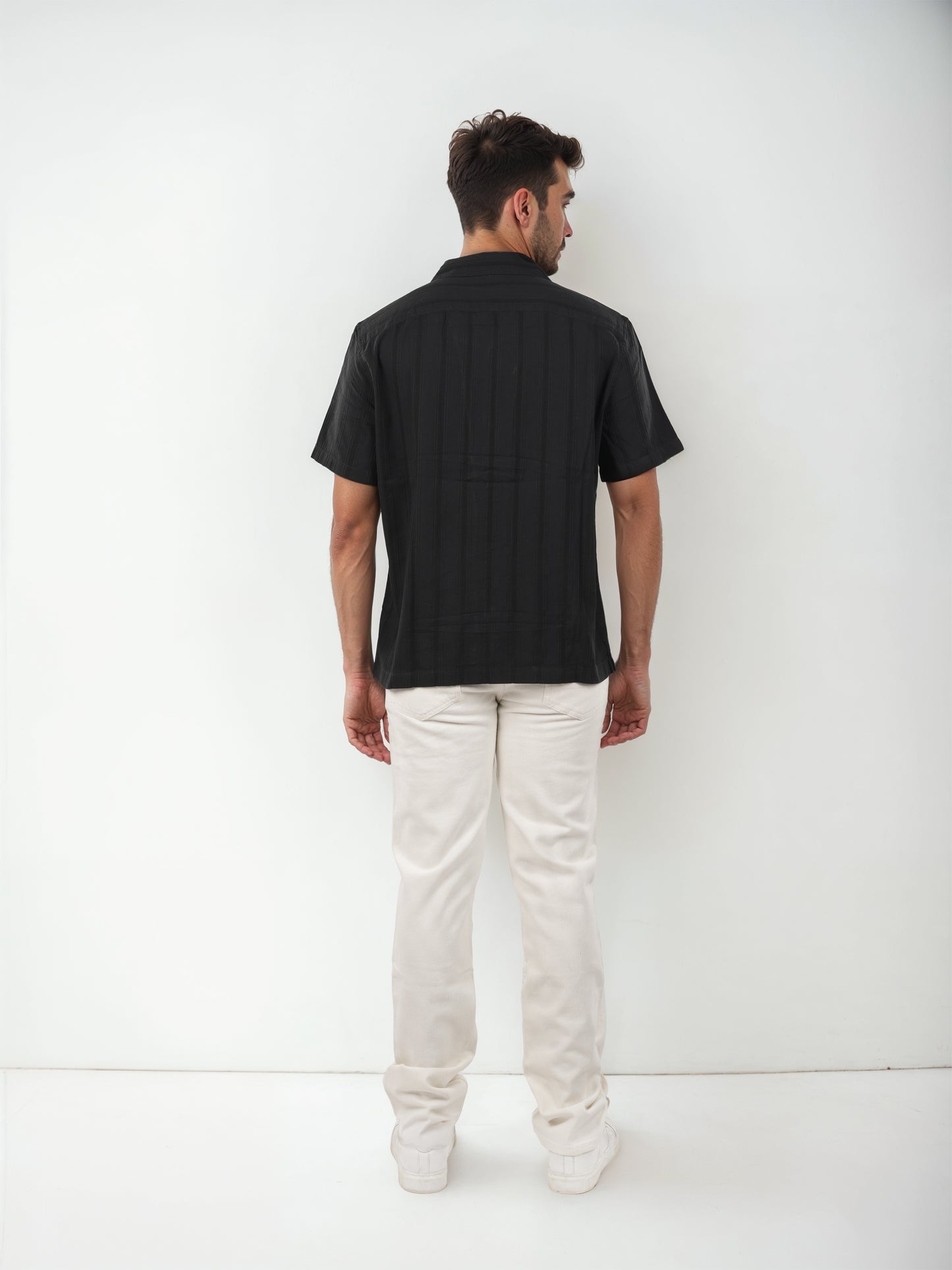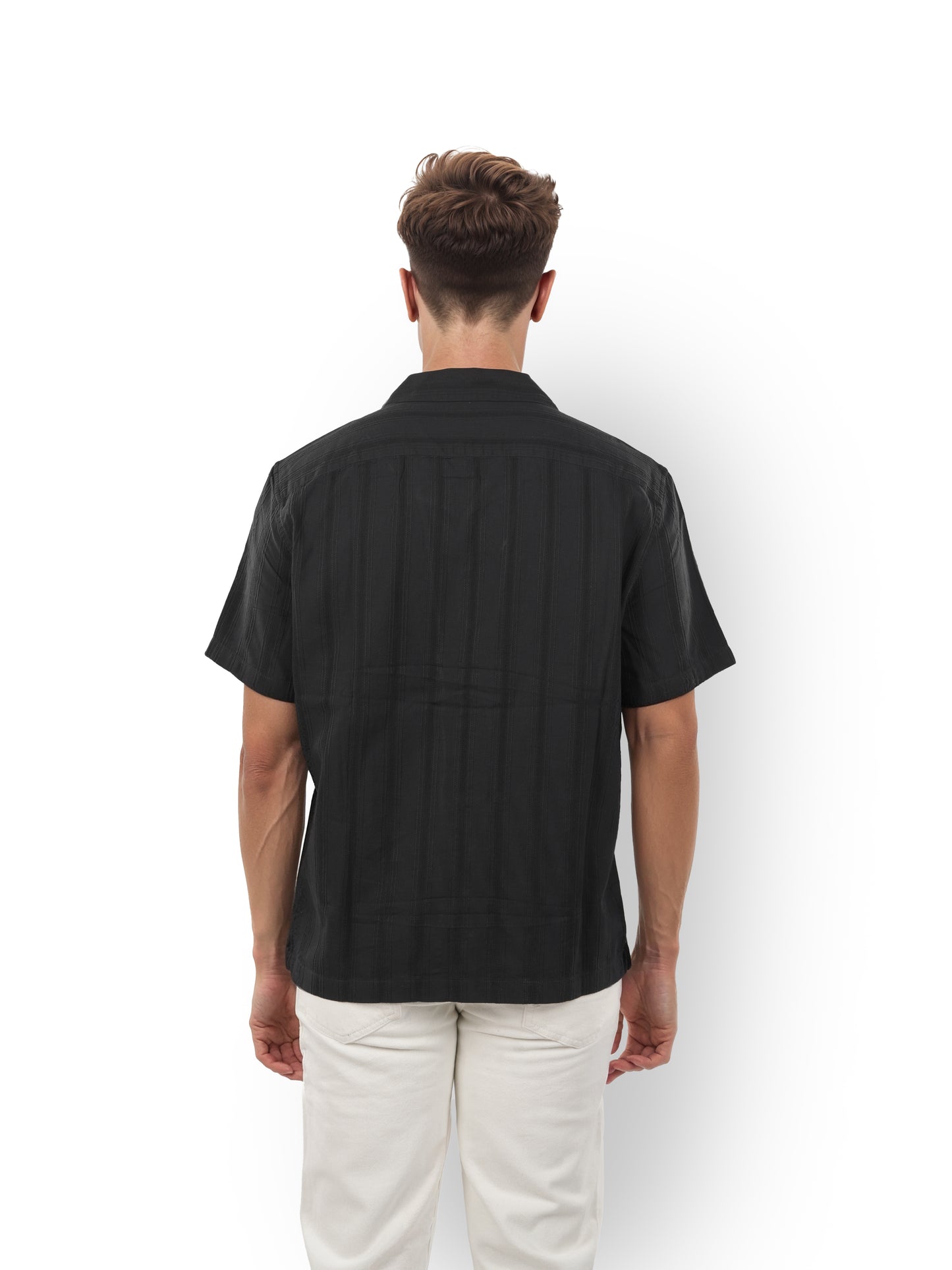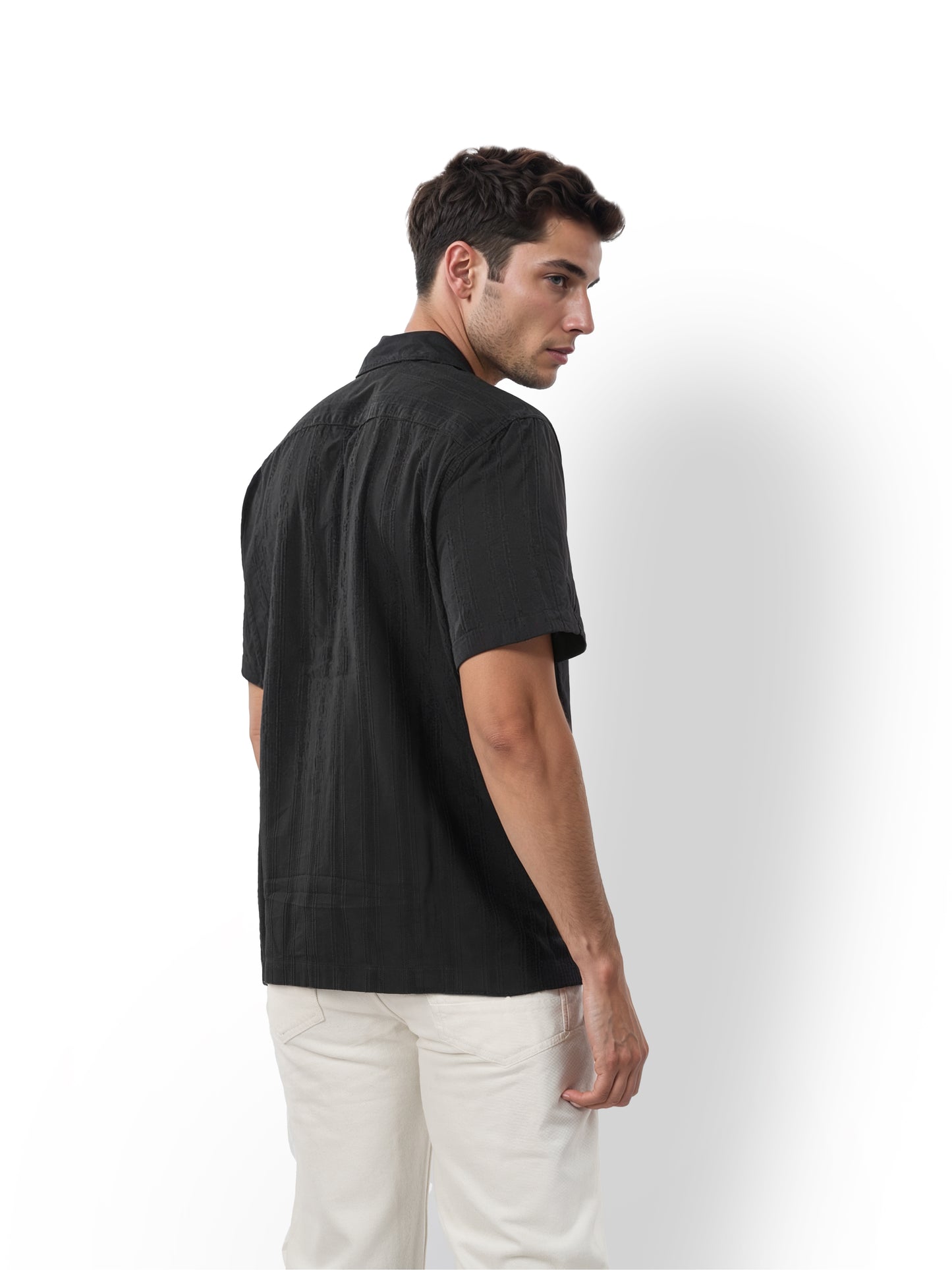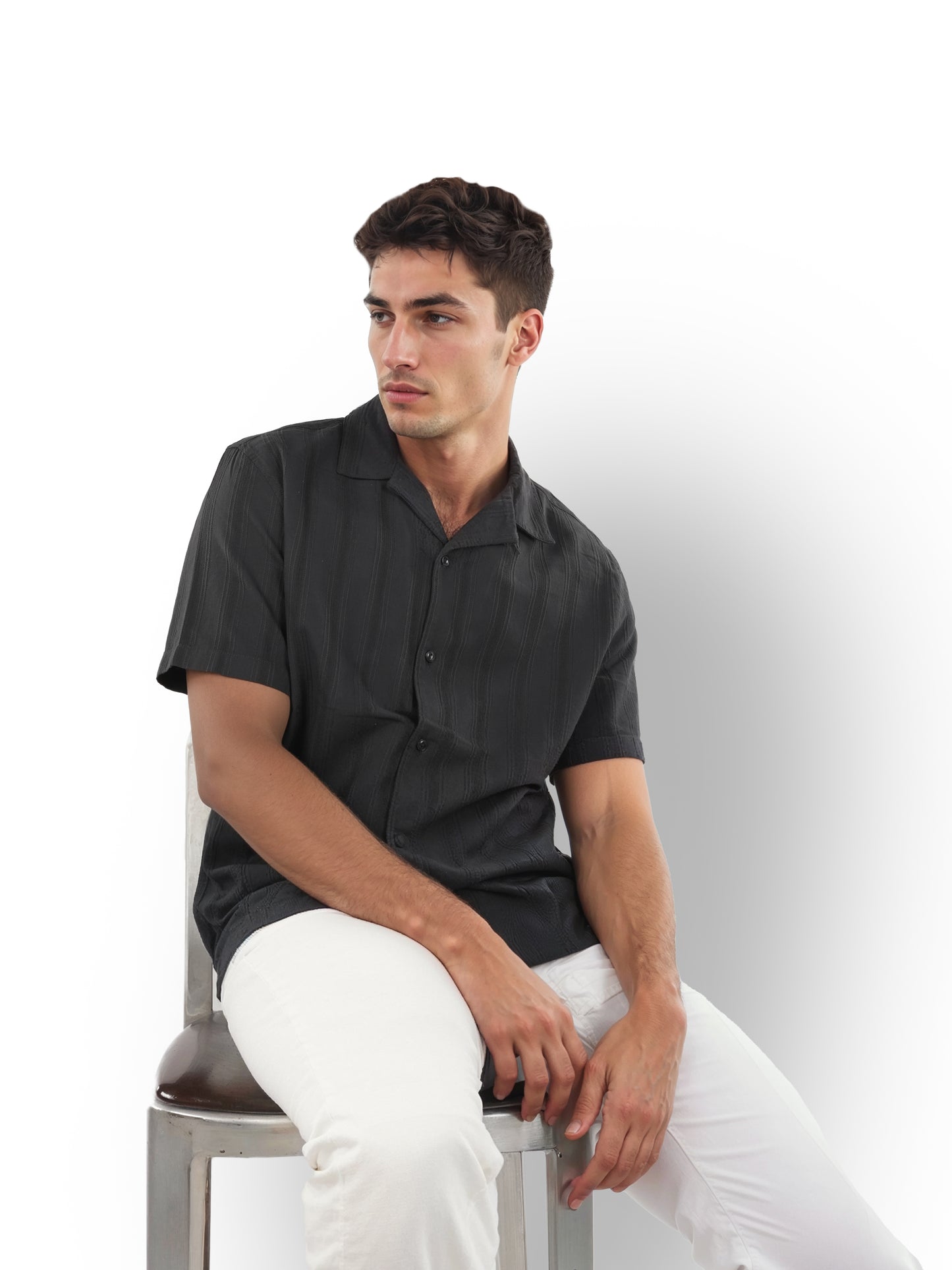 Elevate your casual wardrobe with this Men’s Black Cuban Collar Striped Shirt from Celio. Crafted from comfortable cotton, it features short sleeves for a relaxed fit. Disclaimer: All other items in the image are only for display purposes and will not be a part of the delivery content. Product colour may slightly vary due to photographic lighting sources. Country of Origin - India.