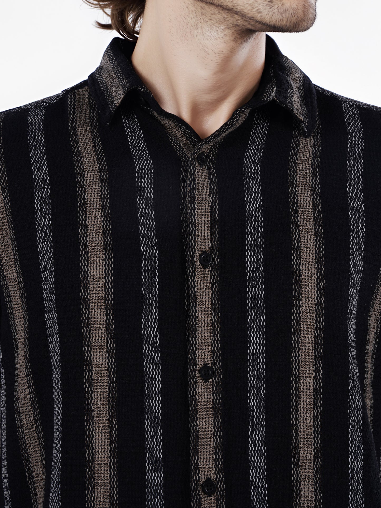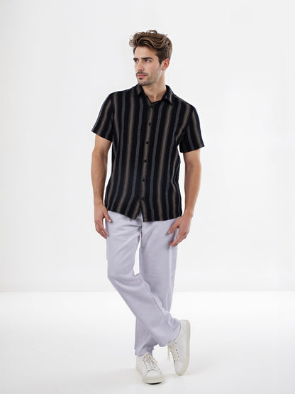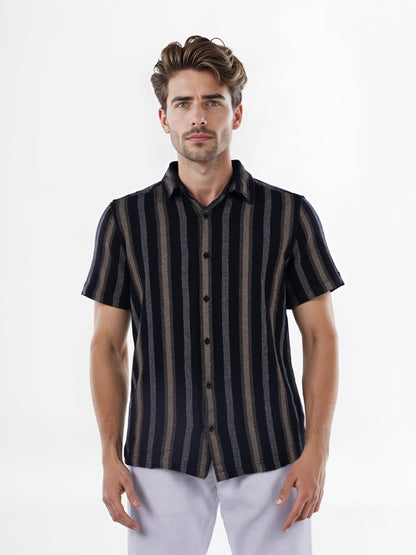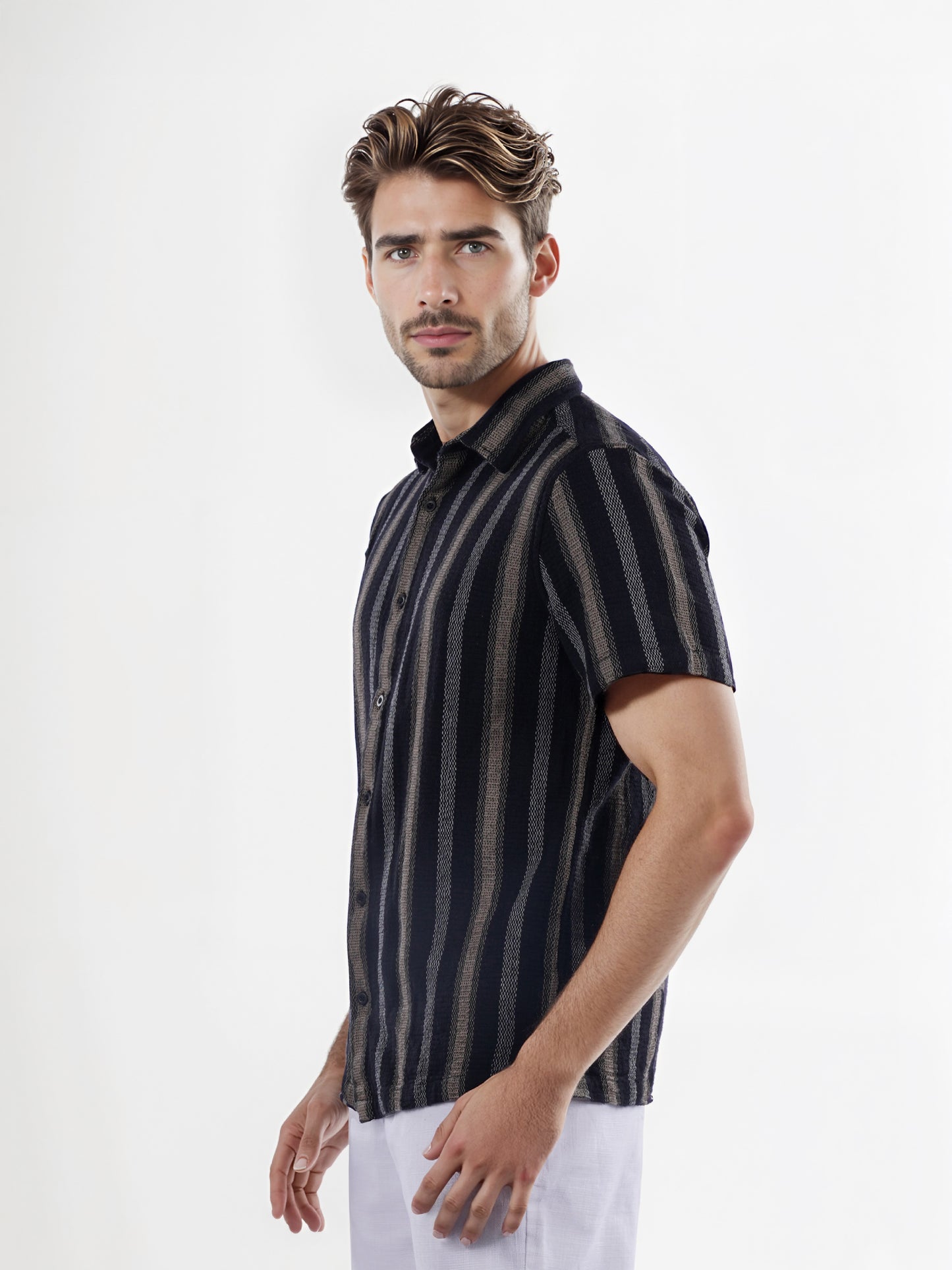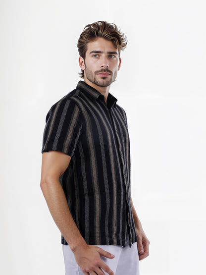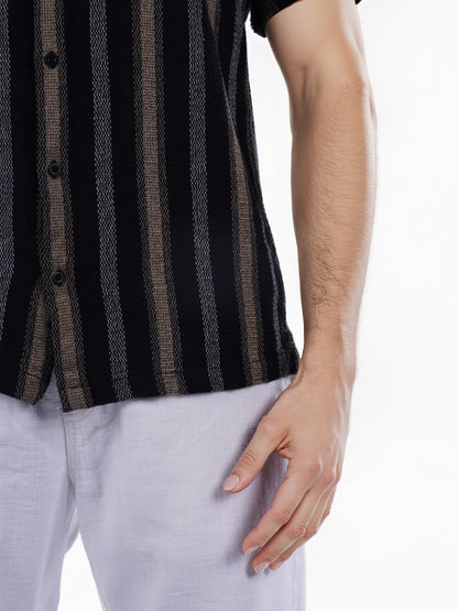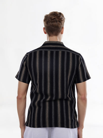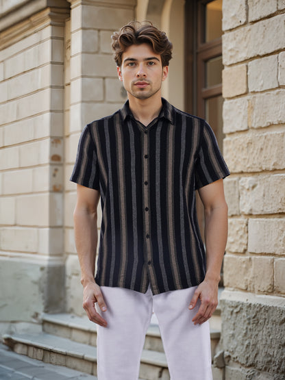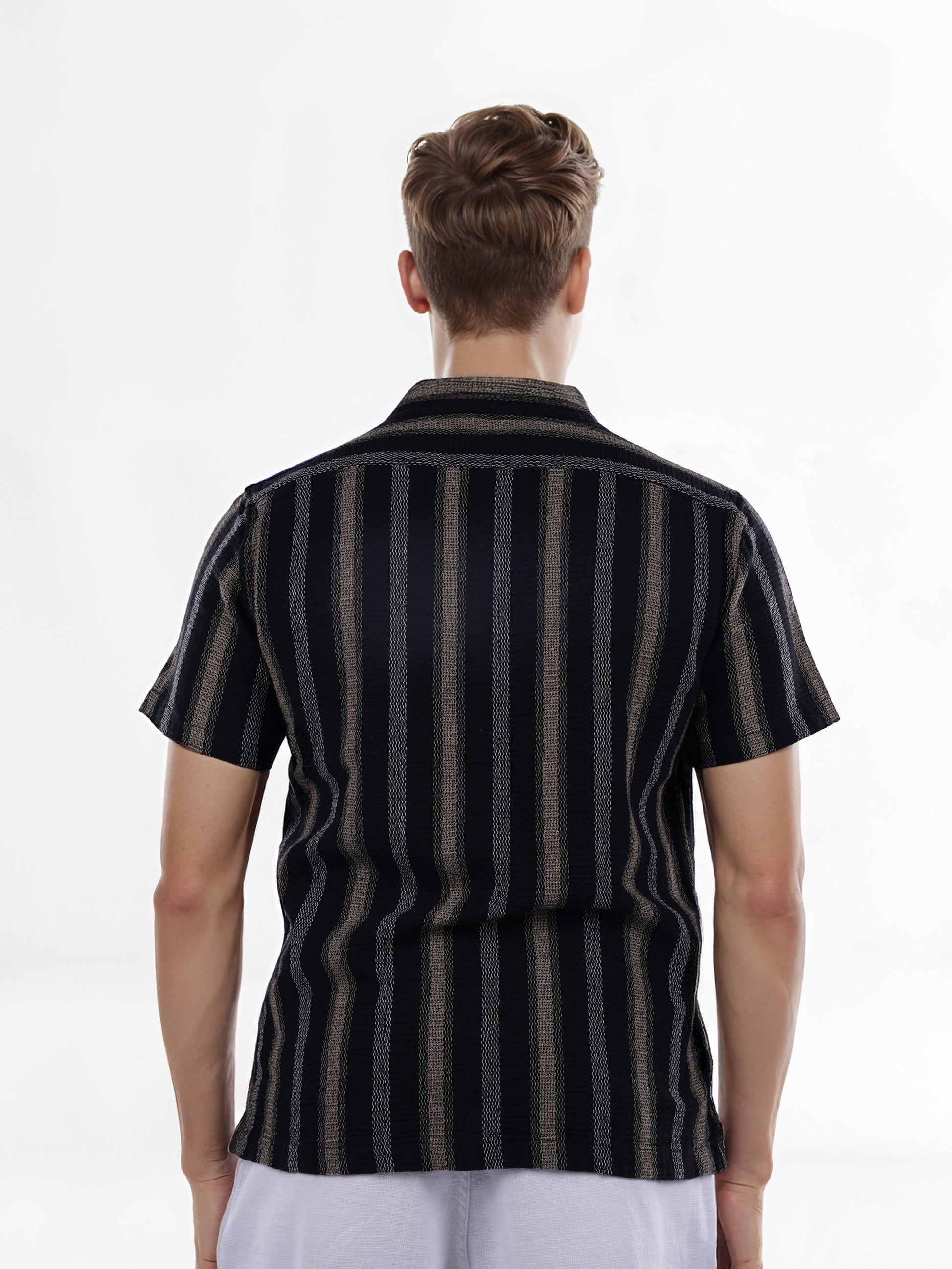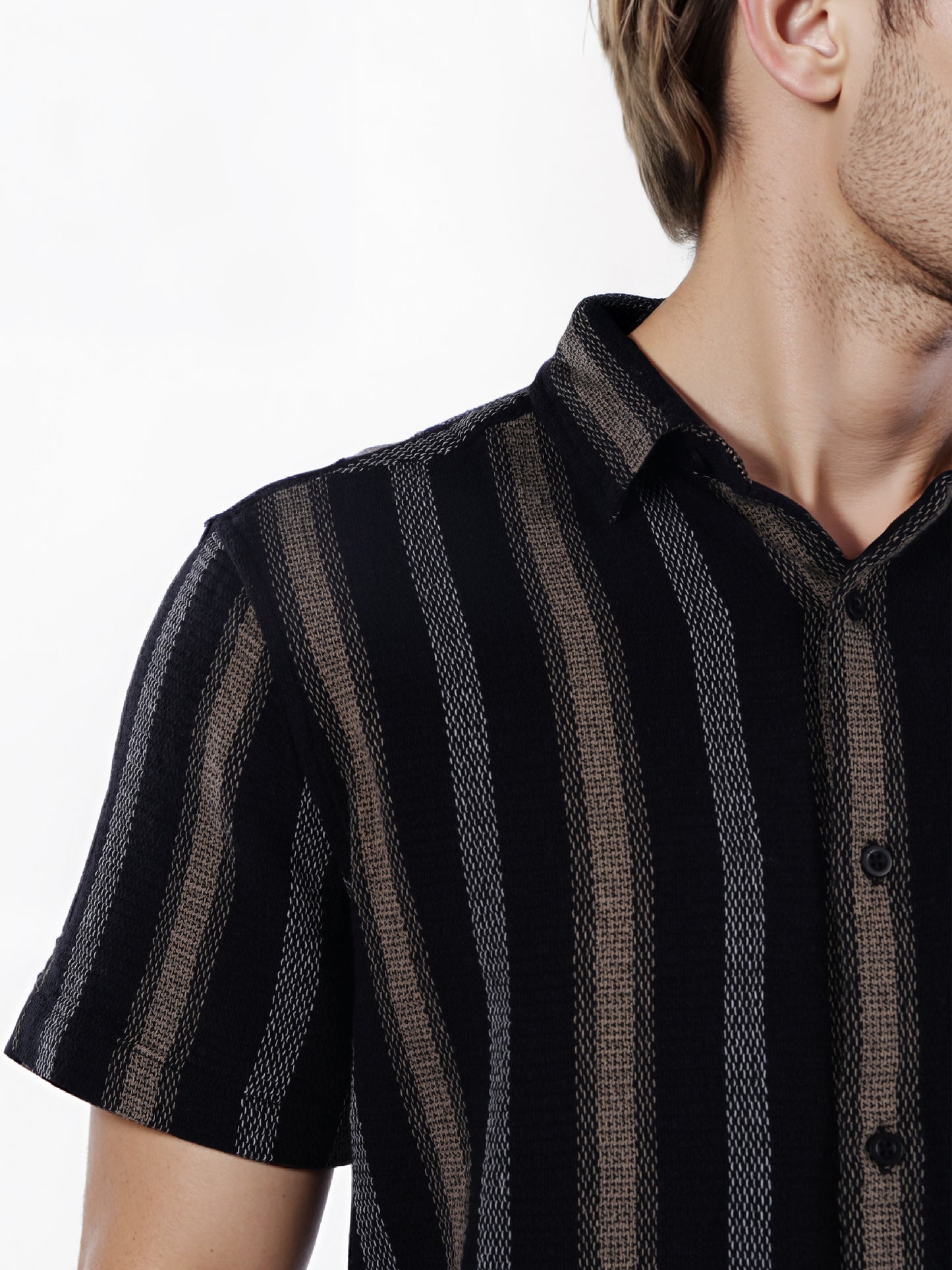 Discover style with the Celio Men Black Striped Regular Fit Cotton Shirt. Perfect for casual wear, this shirt features short sleeves and a sleek cotton fabric for comfort. Disclaimer: All other items in the image are only for display purposes and will not be a part of the delivery content. Product colour may slightly vary due to photographic lighting sources. Country of Origin - India.