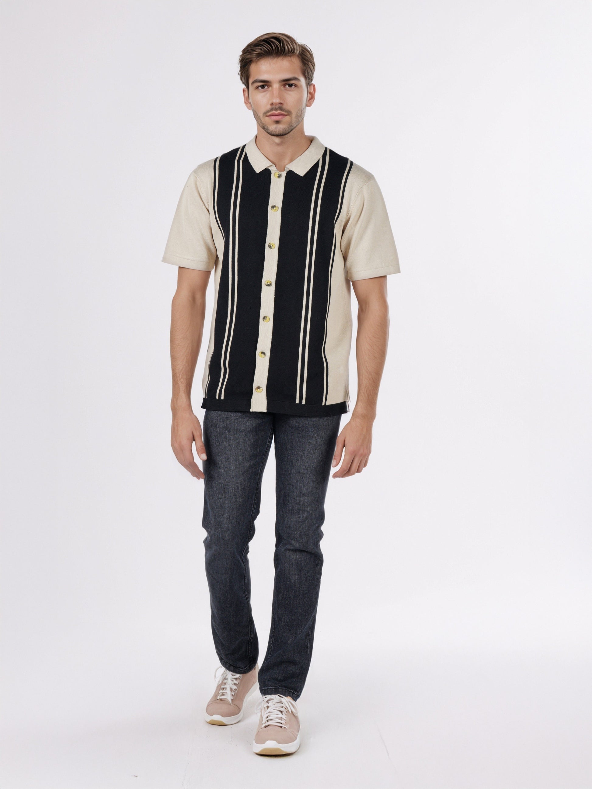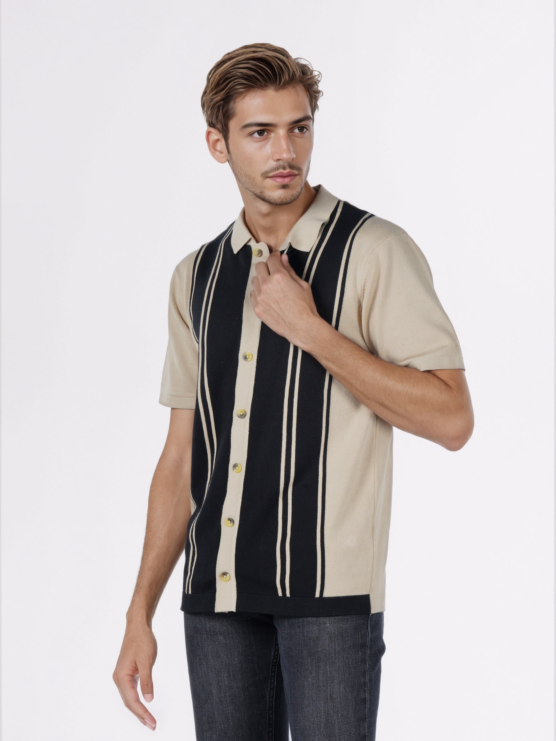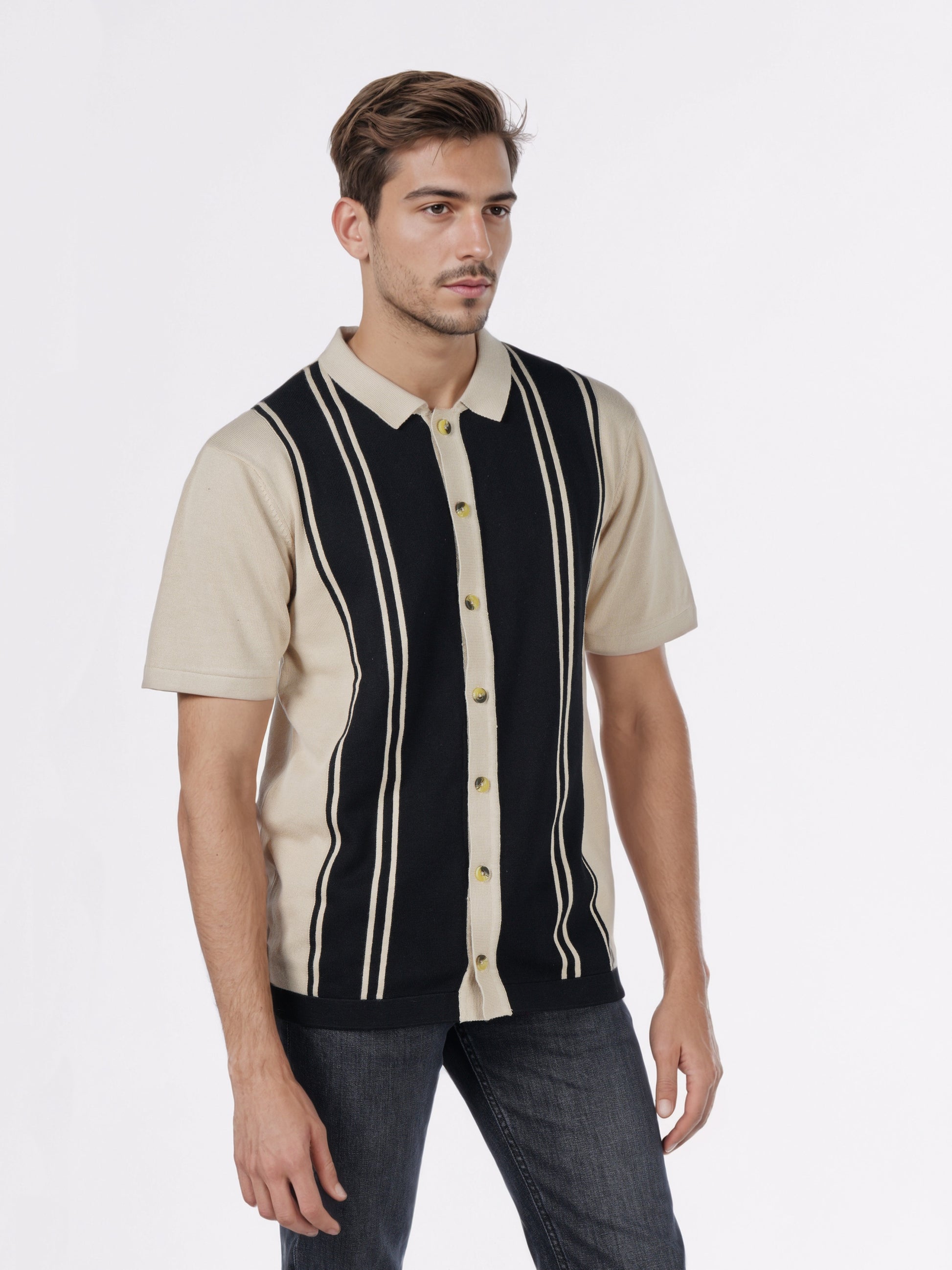 Shop the Celio Men Black Striped Regular Fit Cotton Flat Knit Shirt, perfect for casual occasions. This stylish black shirt features short sleeves and is crafted from comfortable cotton. Disclaimer: All other items in the image are only for display purposes and will not be a part of the delivery content. Product colour may slightly vary due to photographic lighting sources. Country of Origin - India.