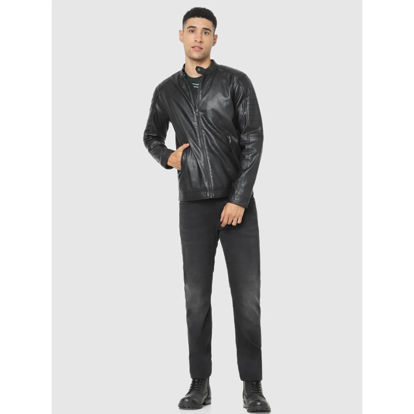 Elevate your casual look with the Celio Black Solid Regular Fit Jacket. Crafted from faux leather, this stylish long-sleeve jacket is perfect for men who seek modern comfort. Disclaimer: All other items in the image are only for display purposes and will not be a part of the delivery content. Product colour may slightly vary due to photographic lighting sources. Country of Origin - India.