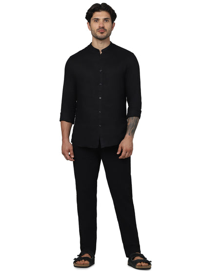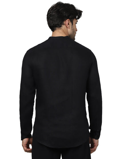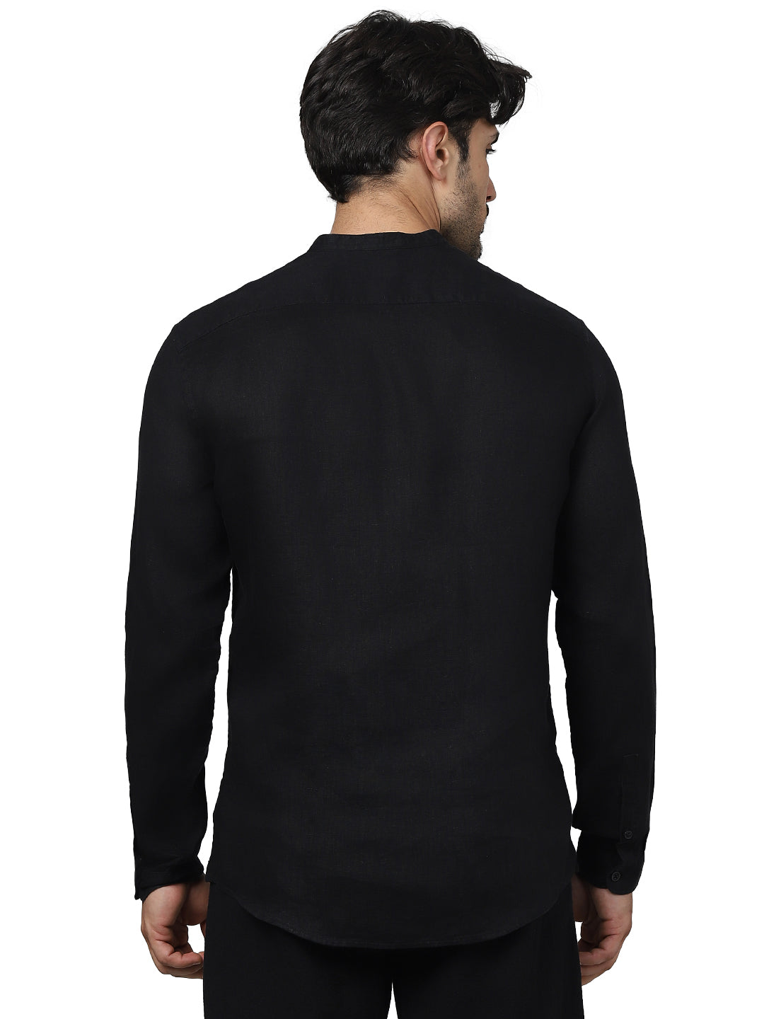 Elevate your casual wardrobe with this regular fit black linen shirt featuring a stylish band collar and long sleeves, perfect for effortless sophistication. Disclaimer: All other items in the image are only for display purposes and will not be a part of the delivery content. Product colour may slightly vary due to photographic lighting sources. Country of Origin - India.