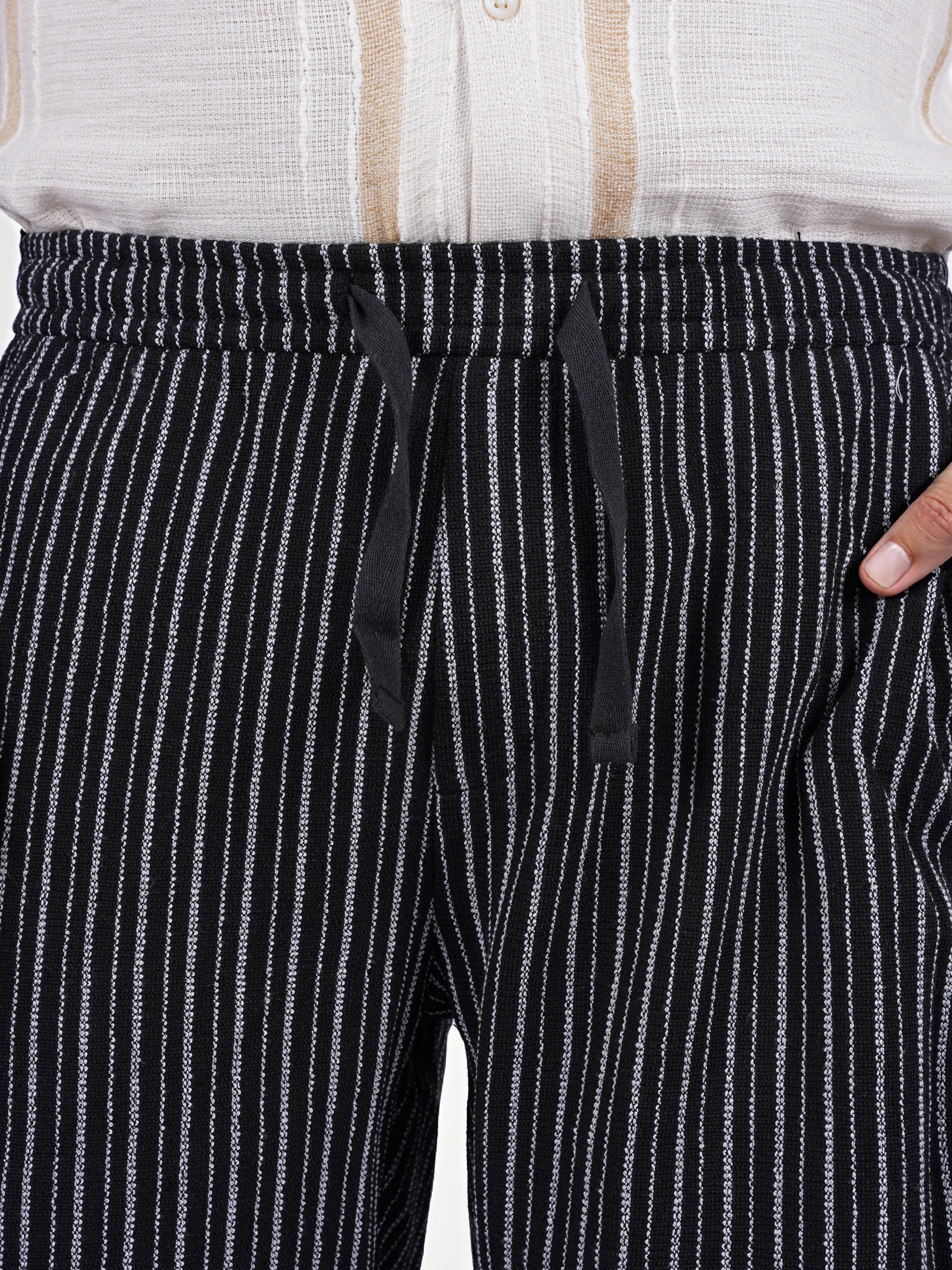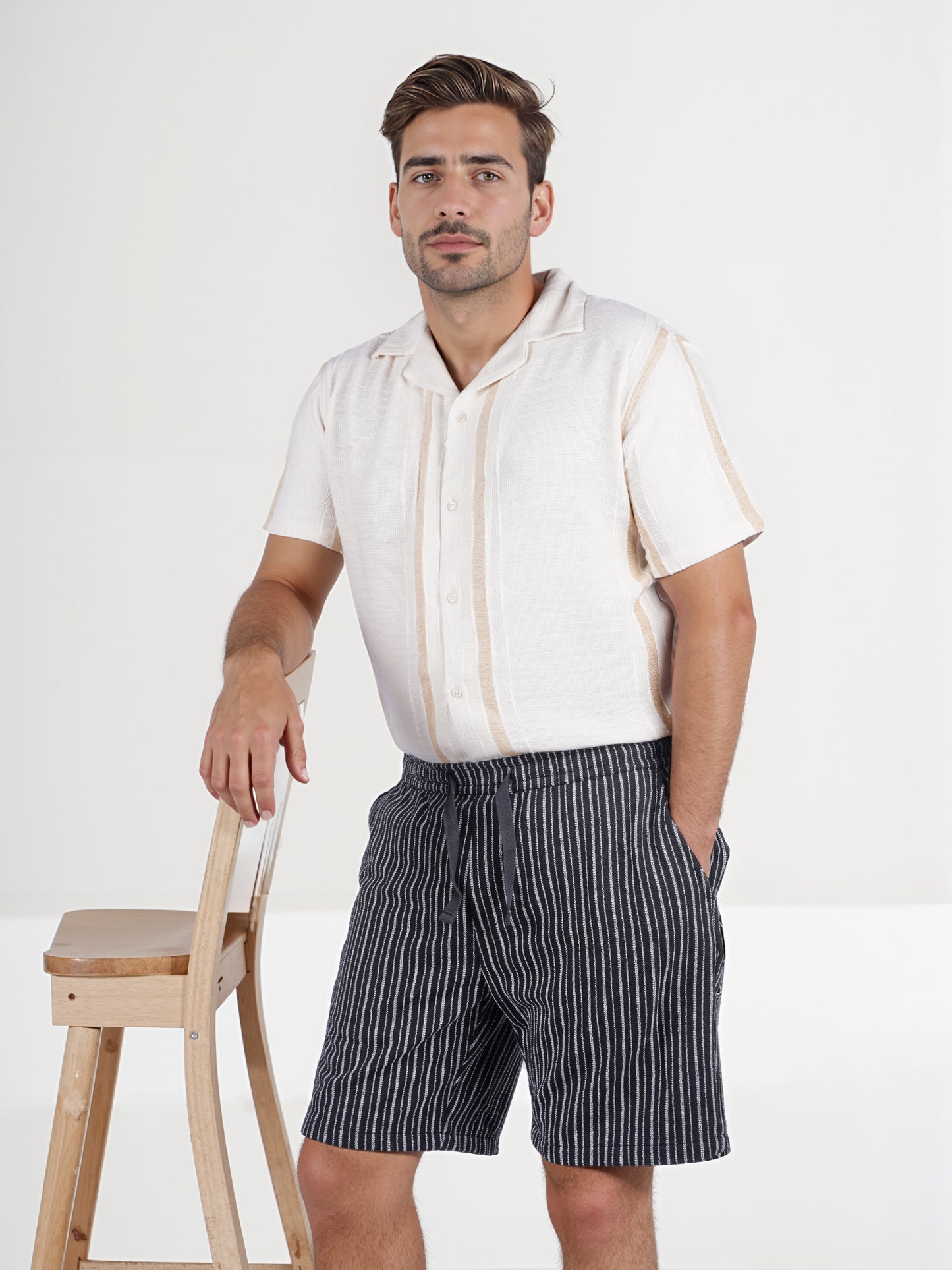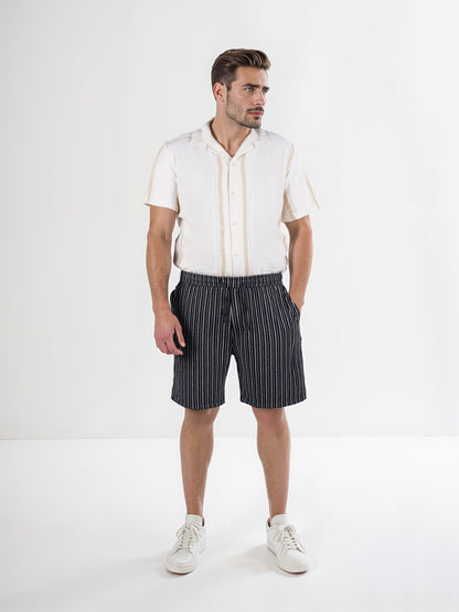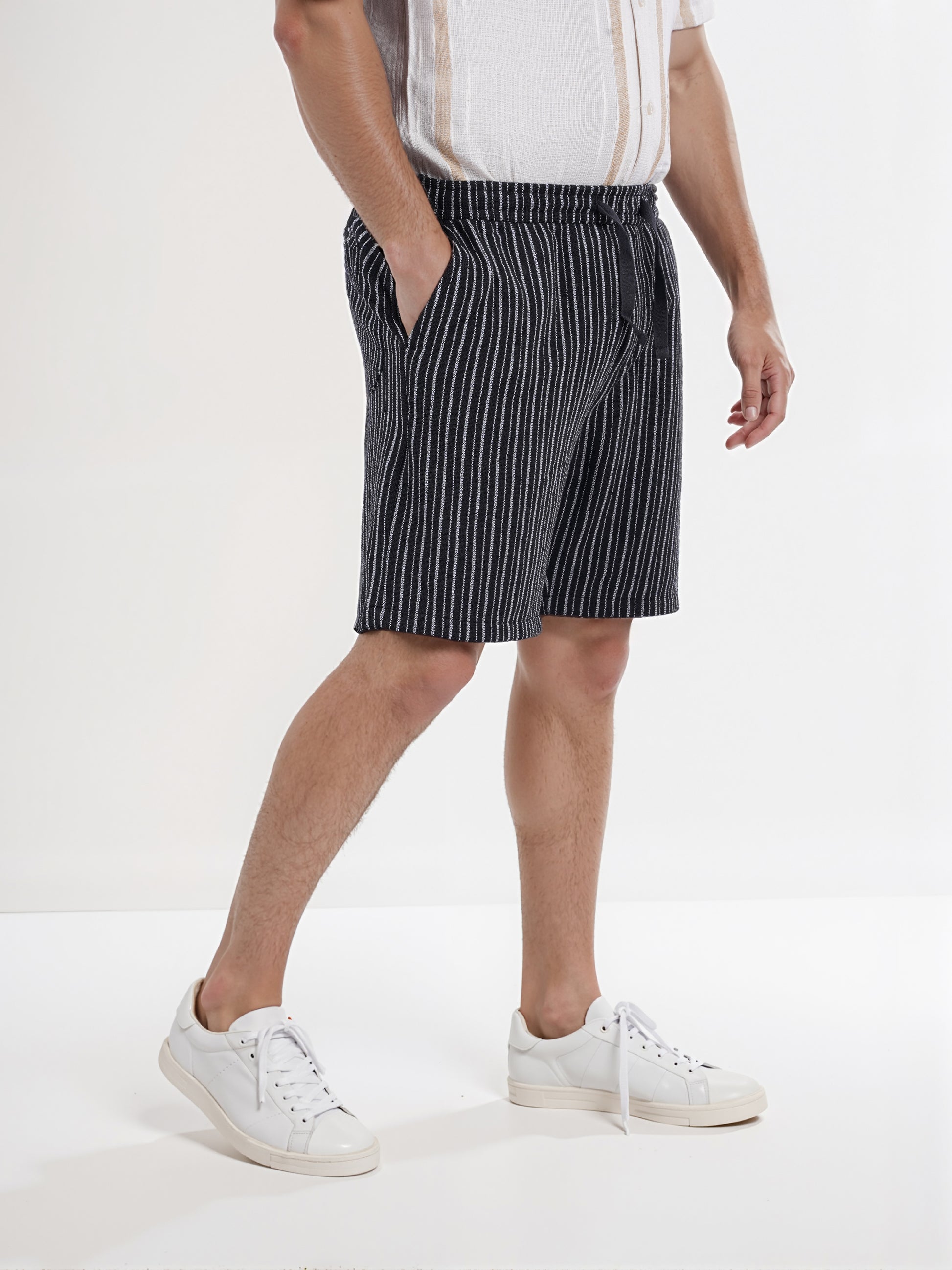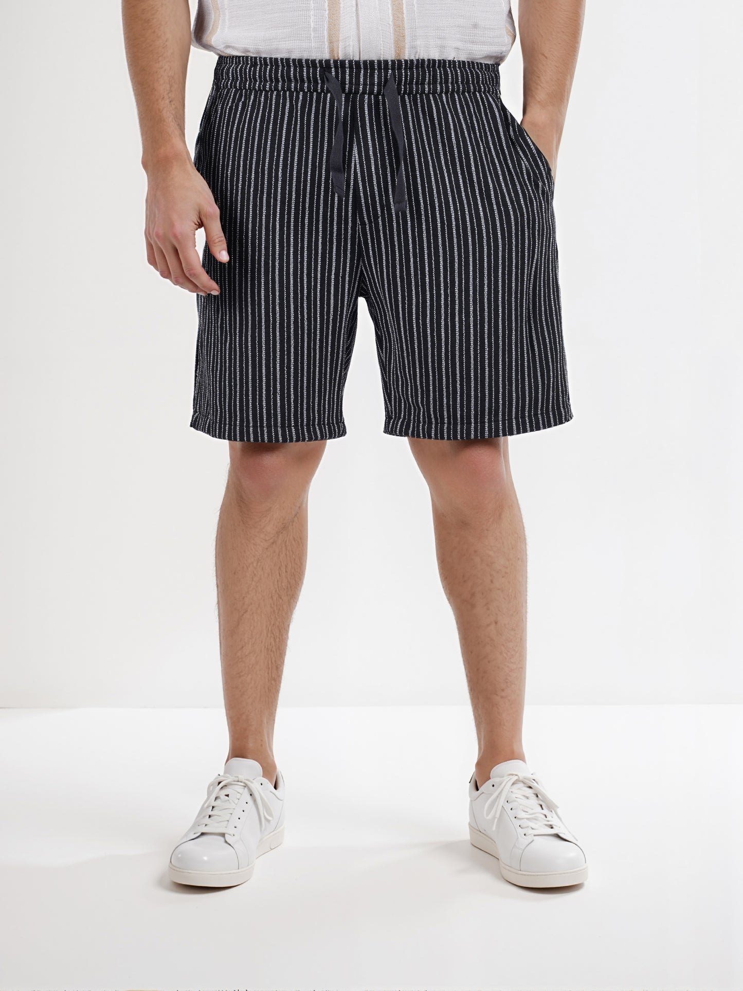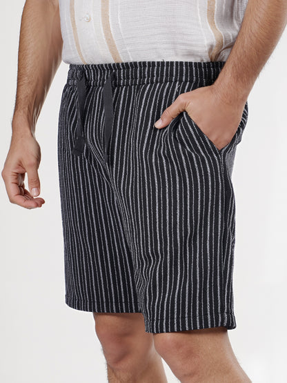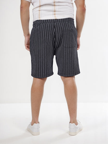 Elevate your casual wardrobe with Celio's black striped shorts for men. Made from durable poly-cotton, these regular fit shorts are perfect for laid-back outings. Disclaimer: All other items in the image are only for display purposes and will not be a part of the delivery content. Product colour may slightly vary due to photographic lighting sources. Country of Origin - India.