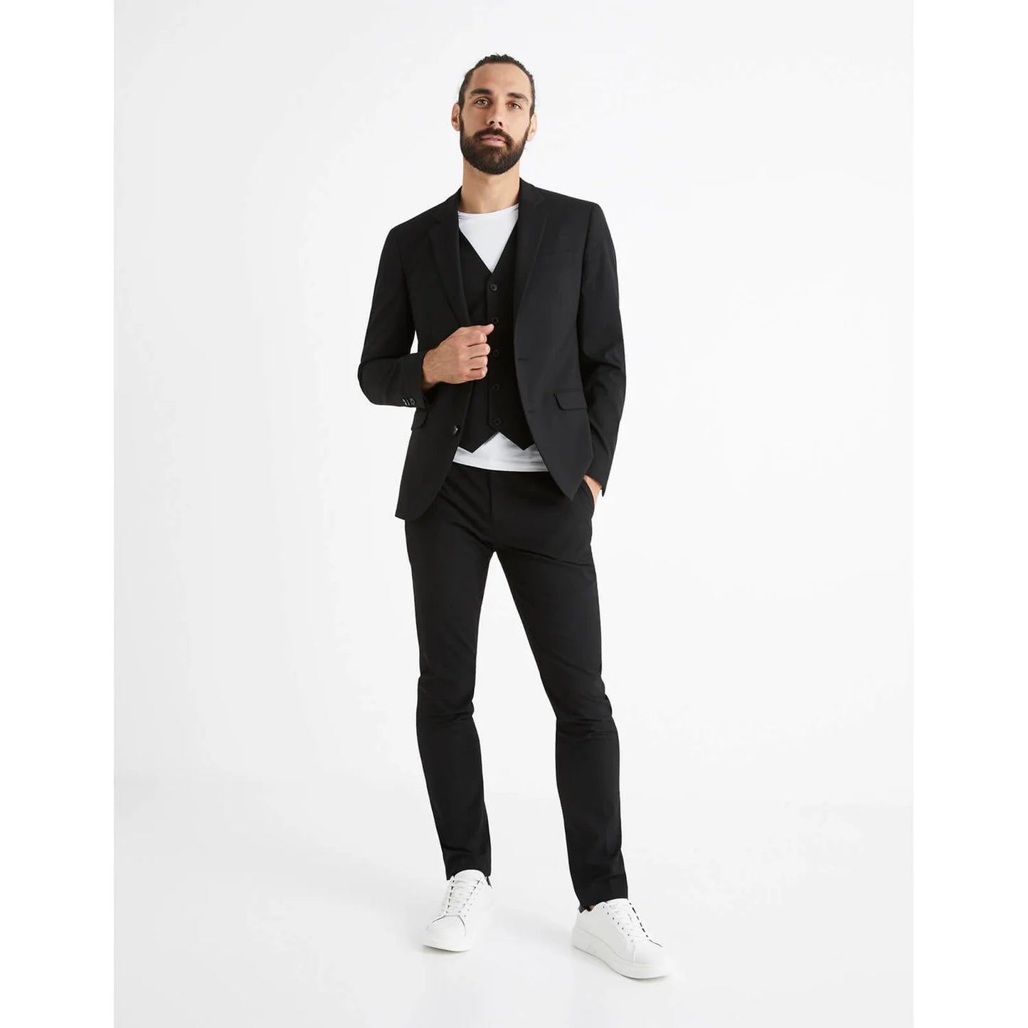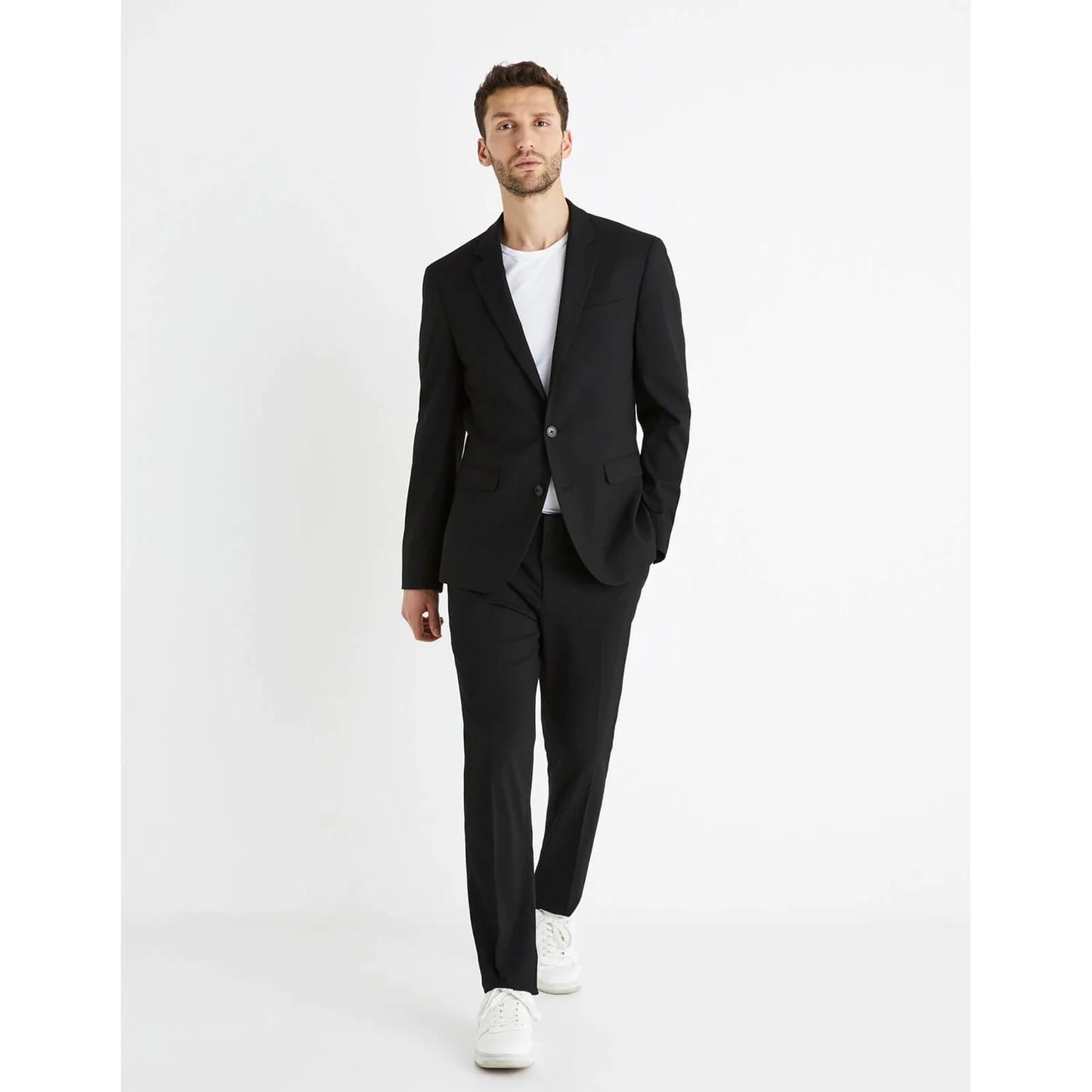 Elevate your casual style with the Celio Men's Black Solid Suit Jacket. Crafted from a comfortable polyester-blend, this jacket features long sleeves and a sleek black design. Disclaimer: All other items in the image are only for display purposes and will not be a part of the delivery content. Product colour may slightly vary due to photographic lighting sources. Country of Origin - India.