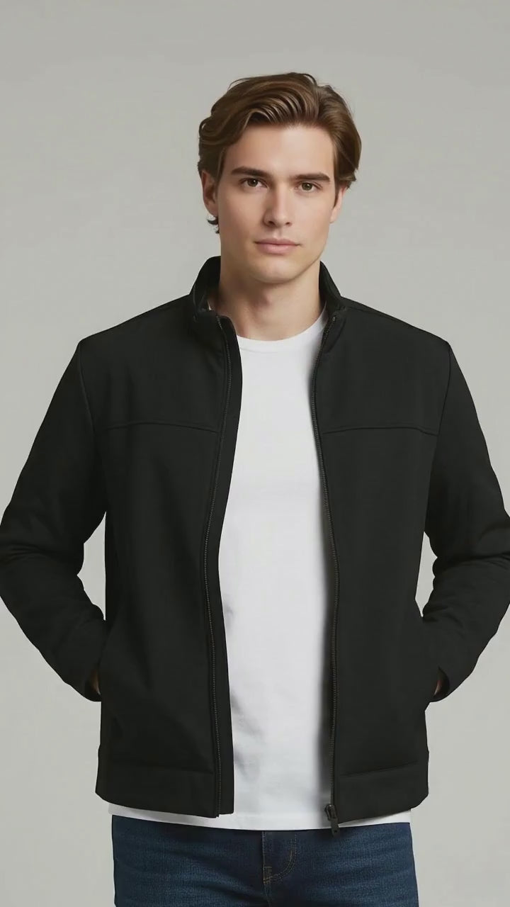 The Celio Men Black Solid Regular Fit Biker Jacket is crafted from durable polyester, featuring long sleeves and a sleek design, perfect for casual outings. Disclaimer: All other items in the image are only for display purposes and will not be a part of the delivery content. Product colour may slightly vary due to photographic lighting sources. Country of Origin - India.