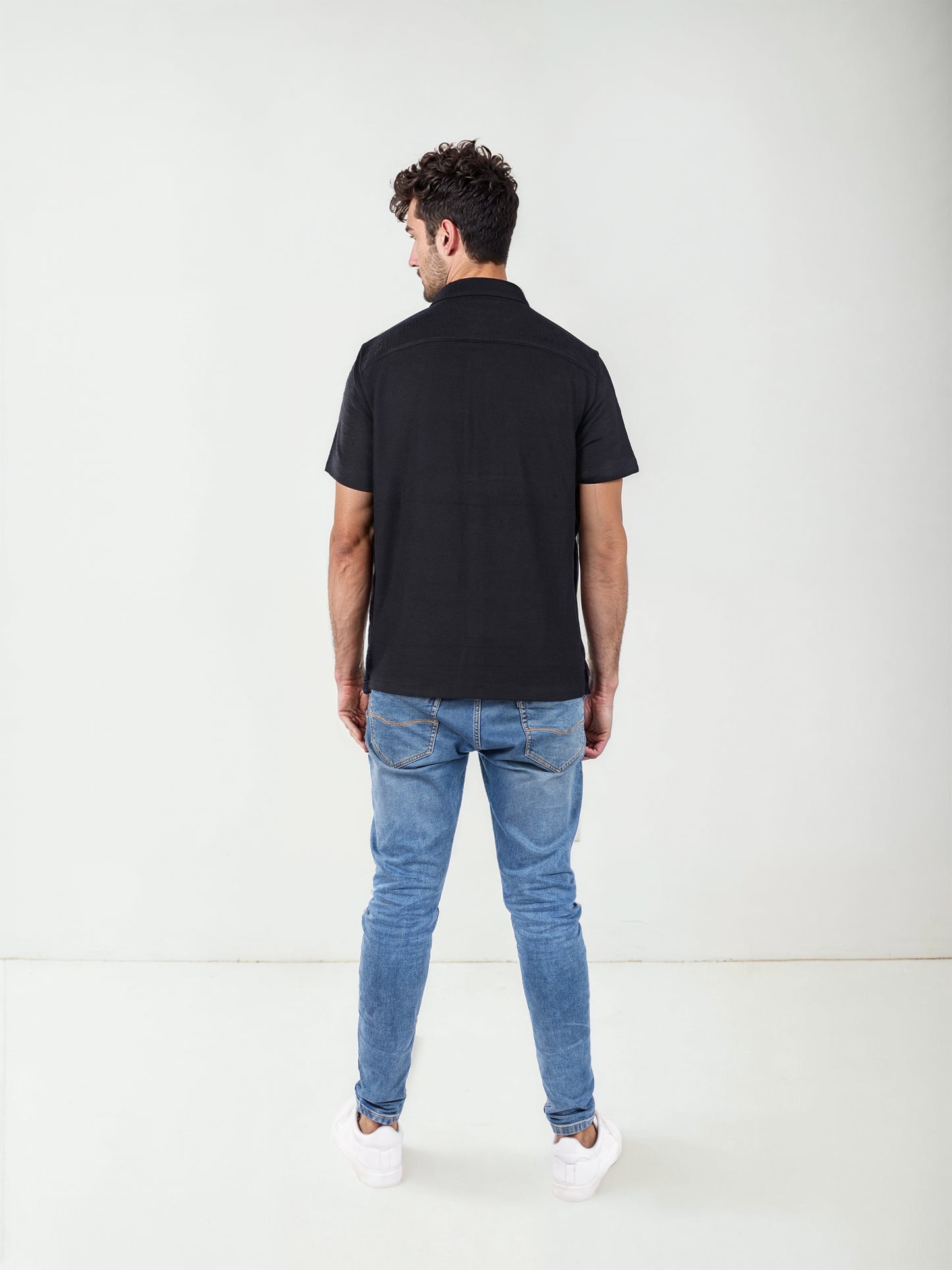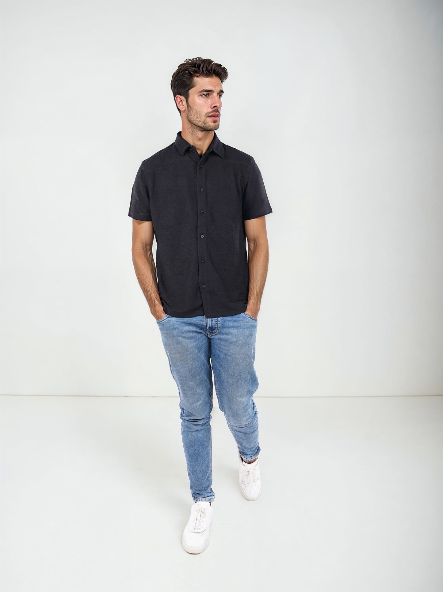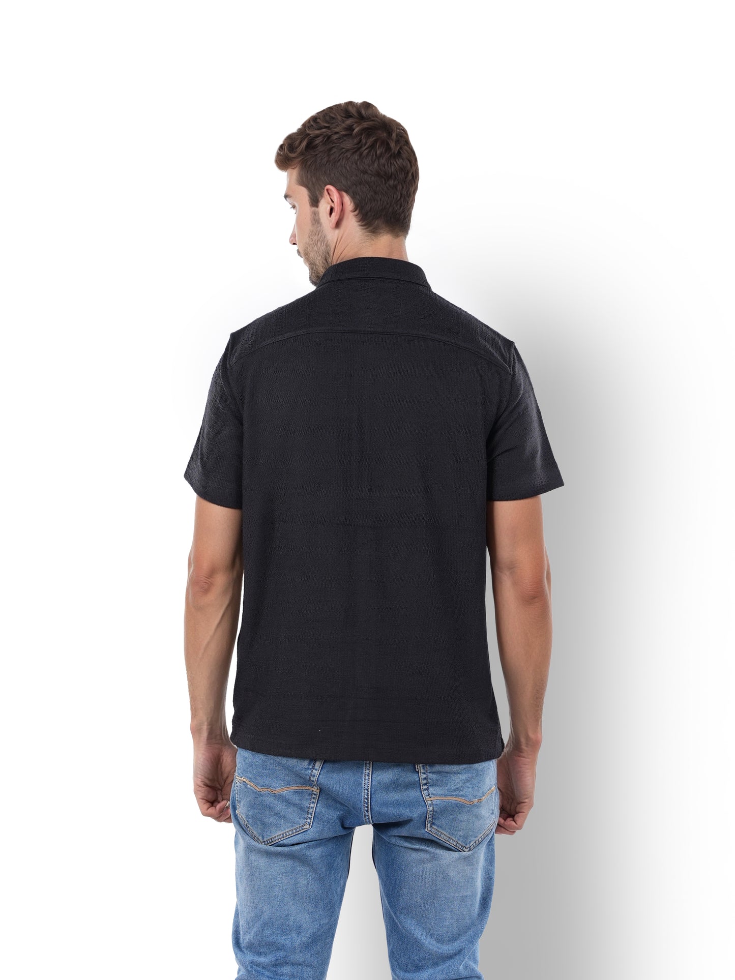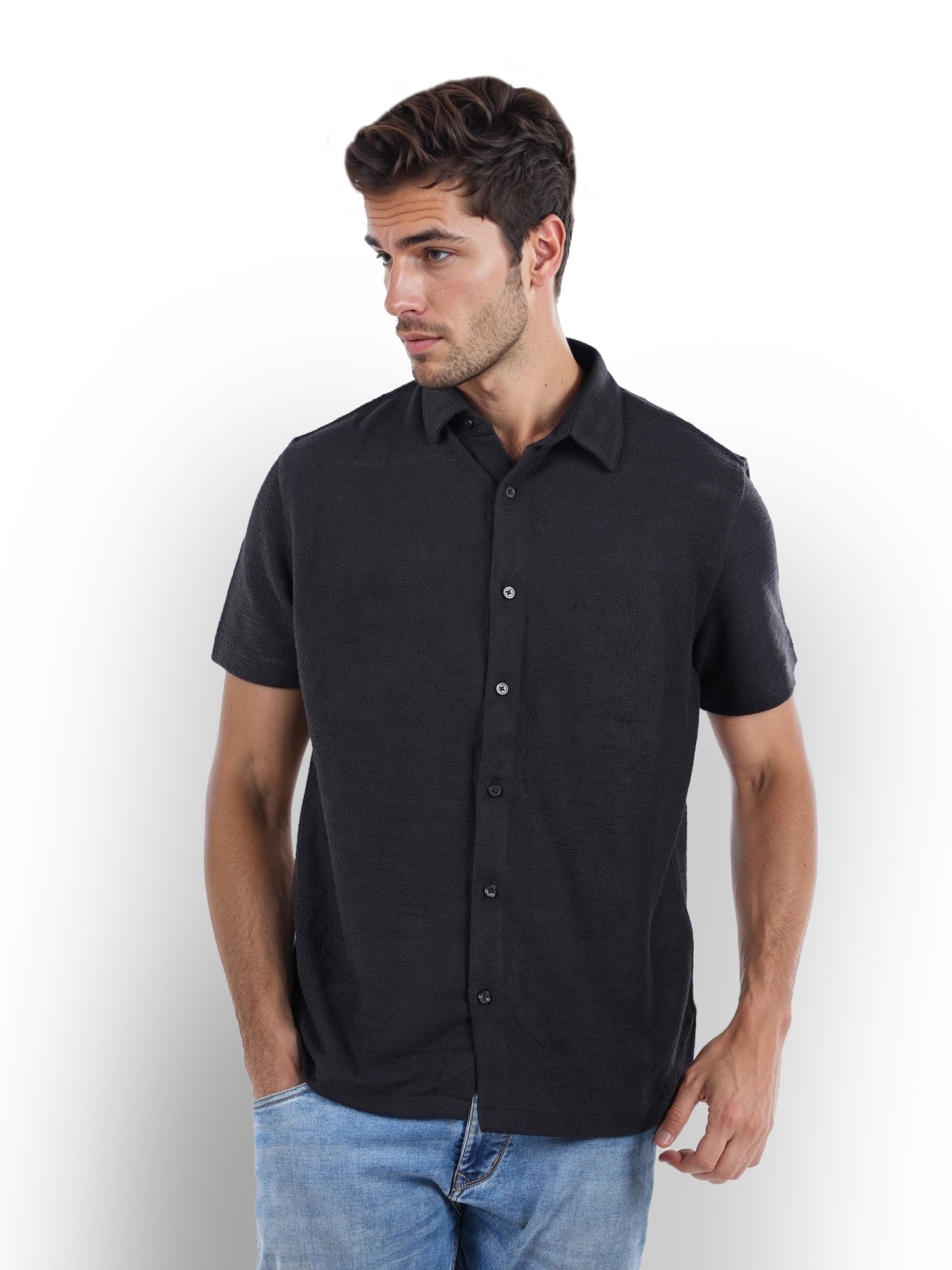 Stylish black short-sleeve shirt by Celio, crafted from polyester. Perfect for casual occasions, this regular fit shirt features a spread collar for a modern look. Disclaimer: All other items in the image are only for display purposes and will not be a part of the delivery content. Product colour may slightly vary due to photographic lighting sources. Country of Origin - India.