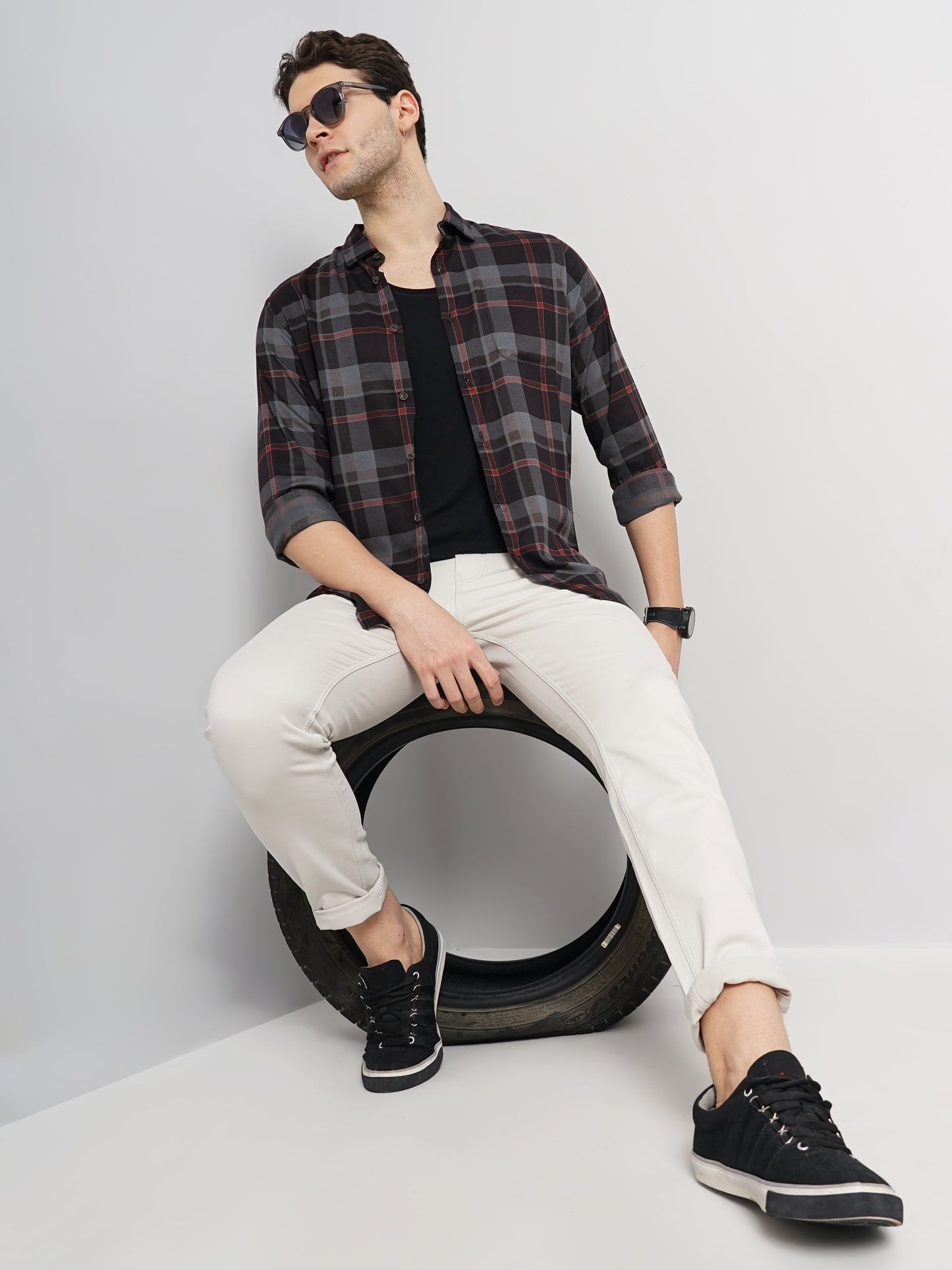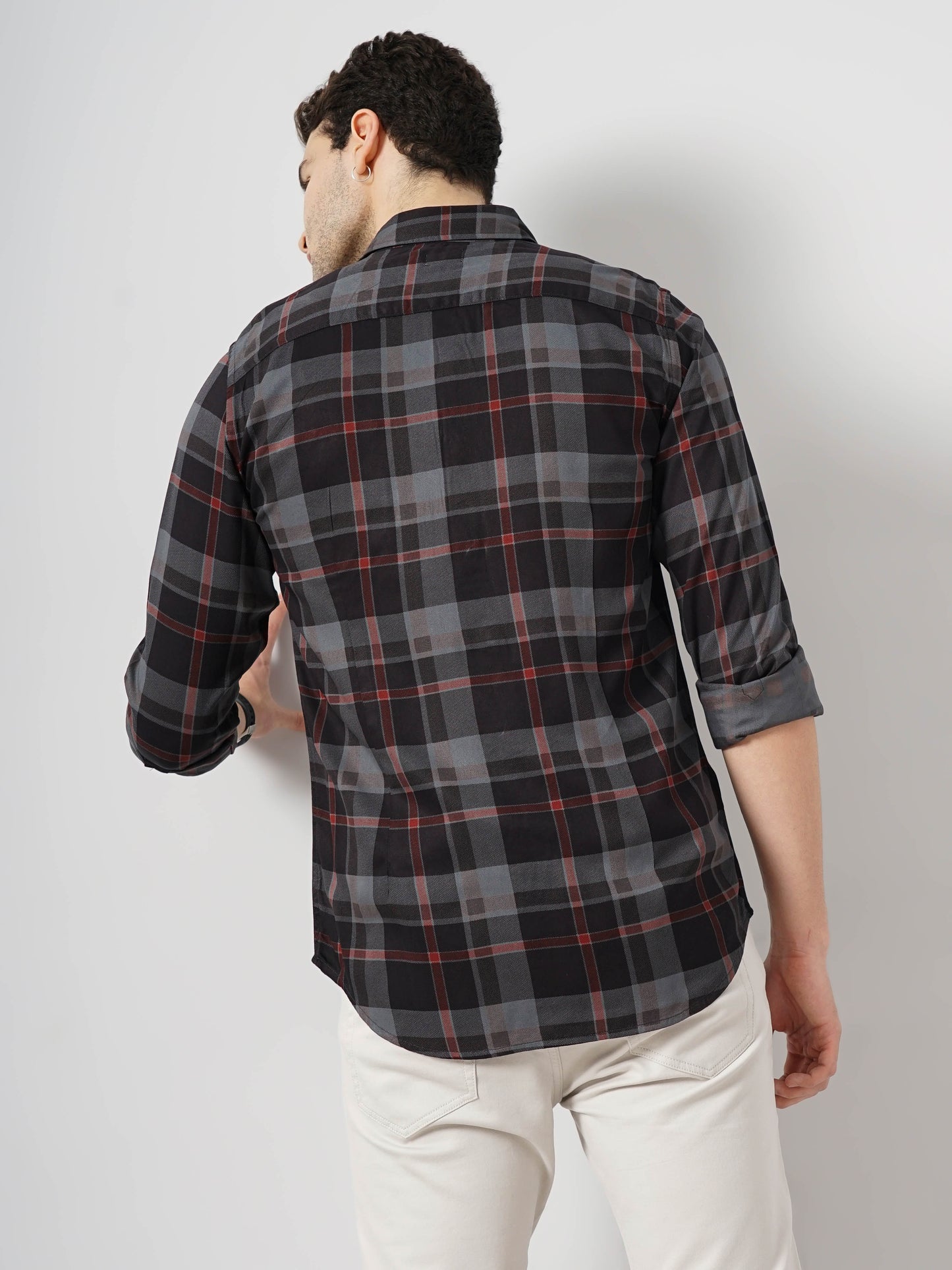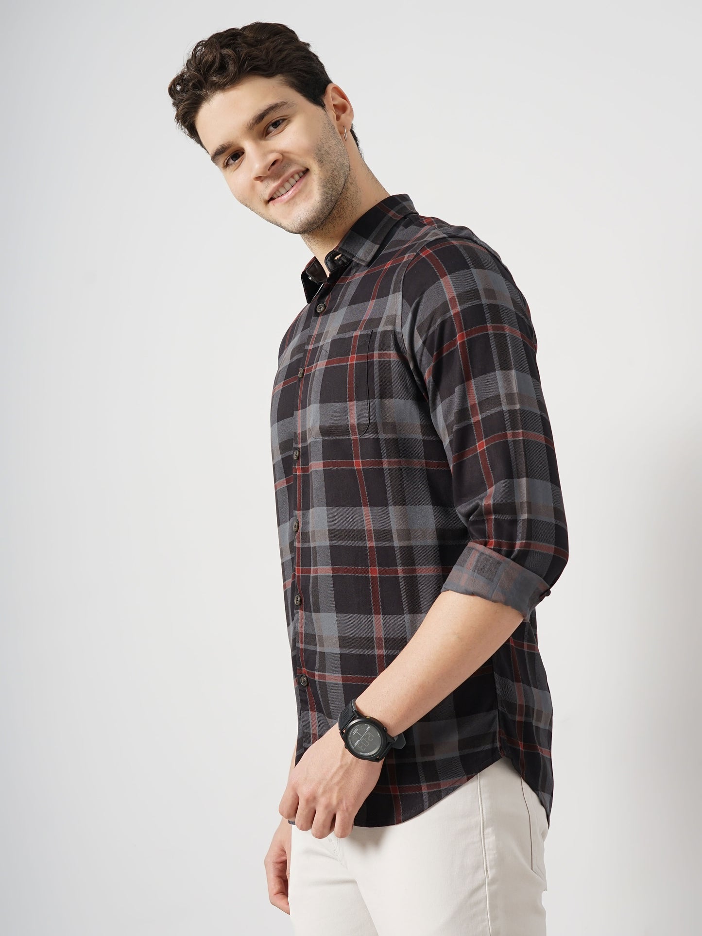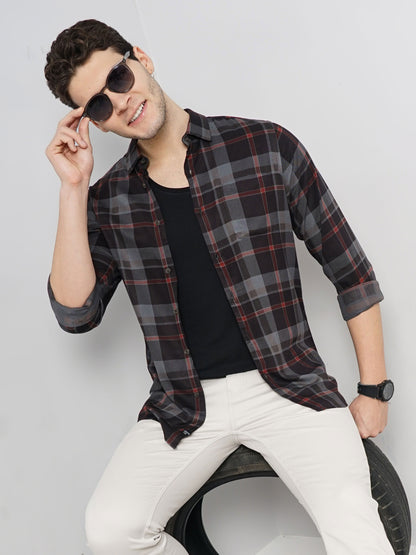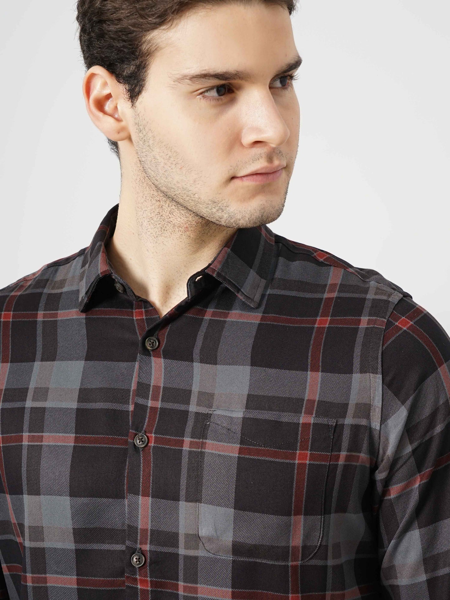 Men's black checked casual shirt by Celio, crafted from soft touch viscose rayon. Features long sleeves, perfect for a stylish yet comfortable look. Disclaimer: All other items in the image are only for display purposes and will not be a part of the delivery content. Product colour may slightly vary due to photographic lighting sources. Country of Origin - India.