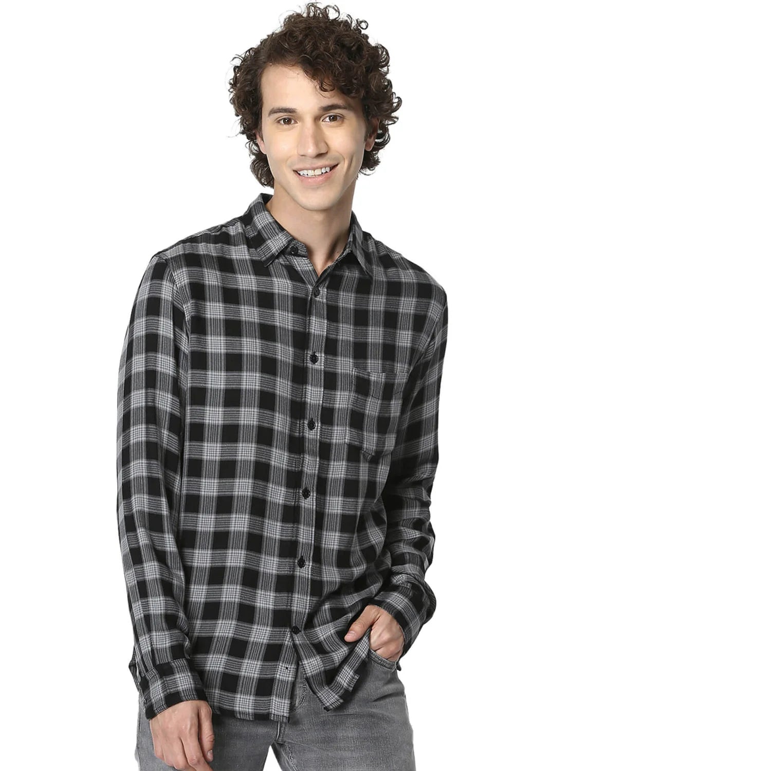 Elevate your casual wardrobe with the Celio Men's Black Checked Soft Touch Shirt. Crafted from soft Viscose, this regular fit piece features long sleeves and a stylish Black-colour design. Disclaimer: All other items in the image are only for display purposes and will not be a part of the delivery content. Product colour may slightly vary due to photographic lighting sources. Country of Origin - India.