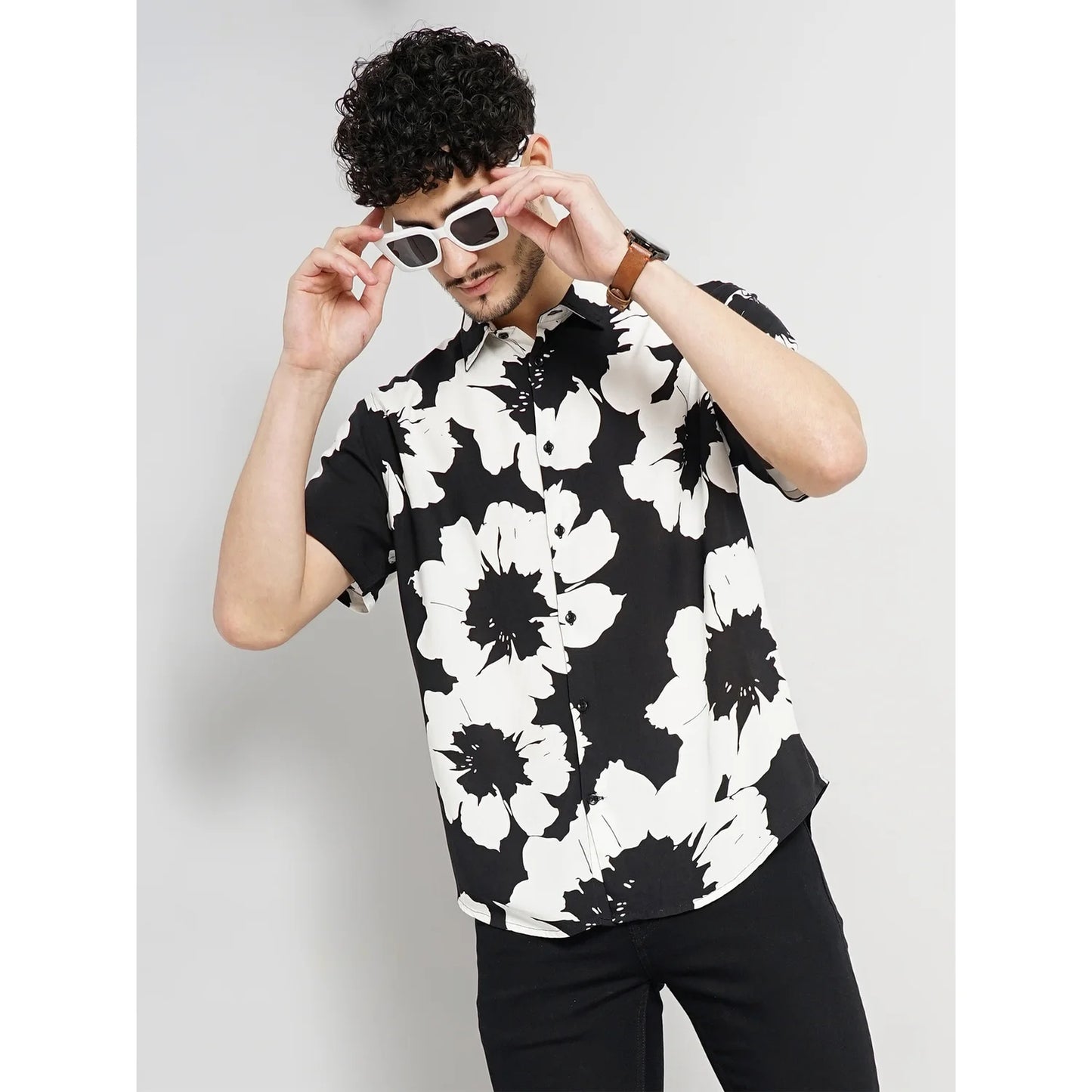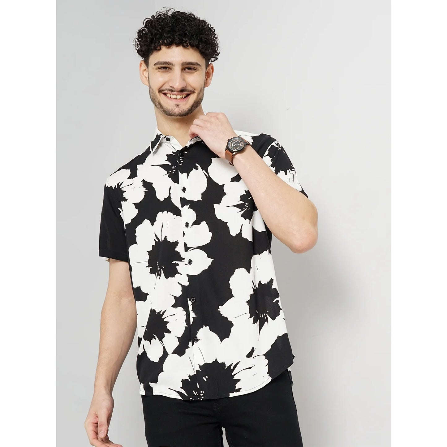 Stylish Celio Floral Half Shirt in black, crafted from soft viscose fabric. Perfect for casual occasions, this men's shirt features comfortable half sleeves for a relaxed fit. Disclaimer: All other items in the image are only for display purposes and will not be a part of the delivery content. Product colour may slightly vary due to photographic lighting sources. Country of Origin - India.