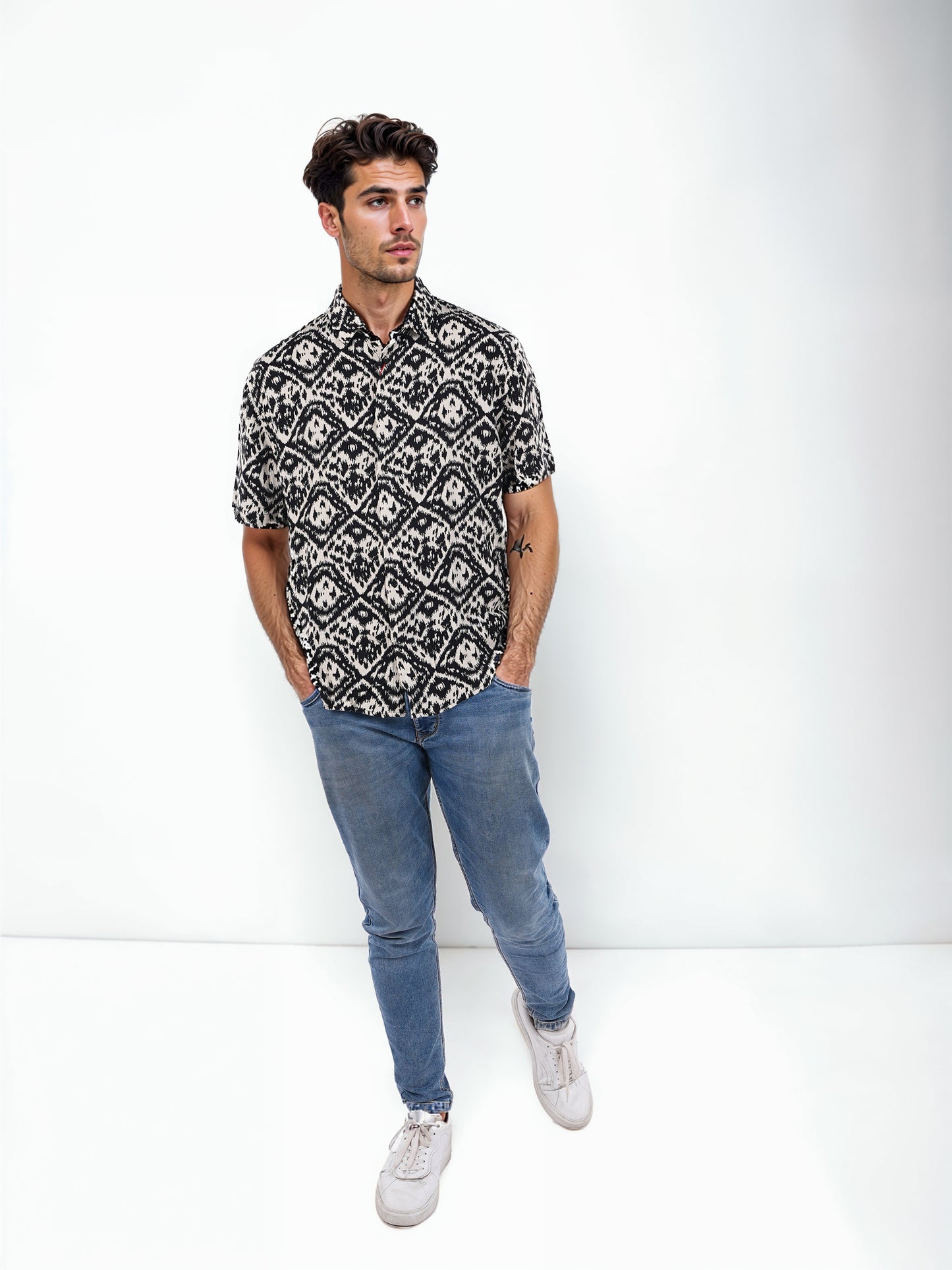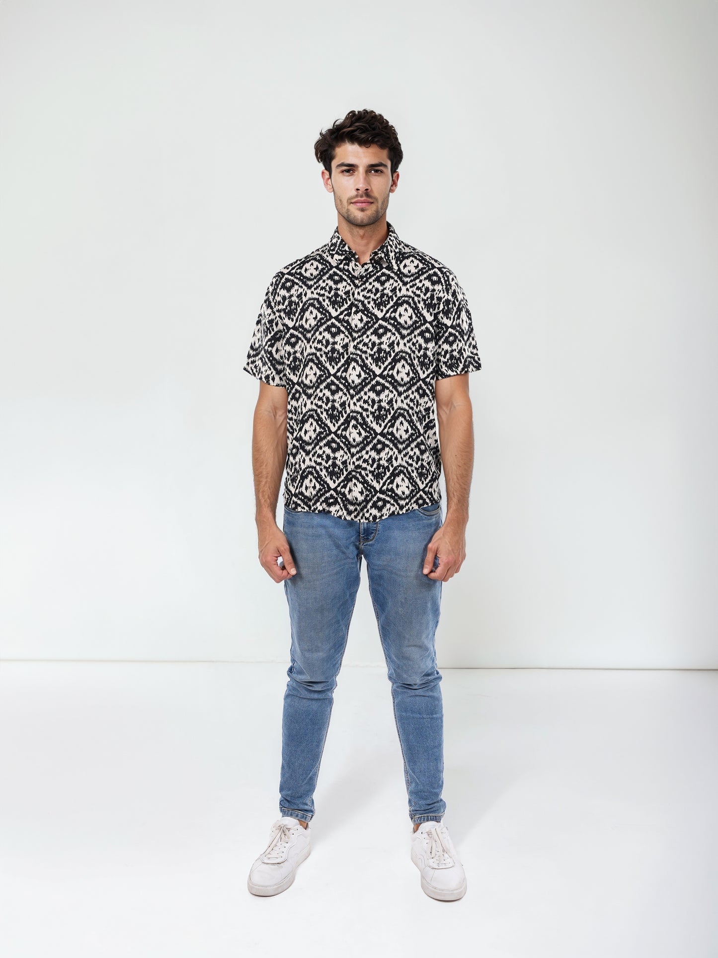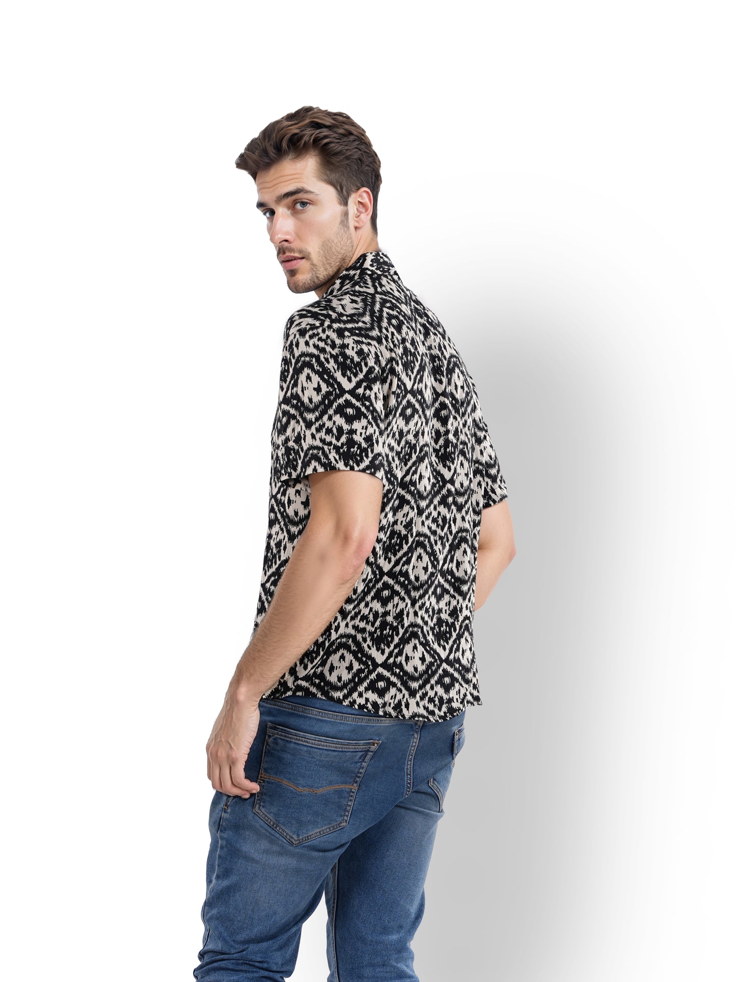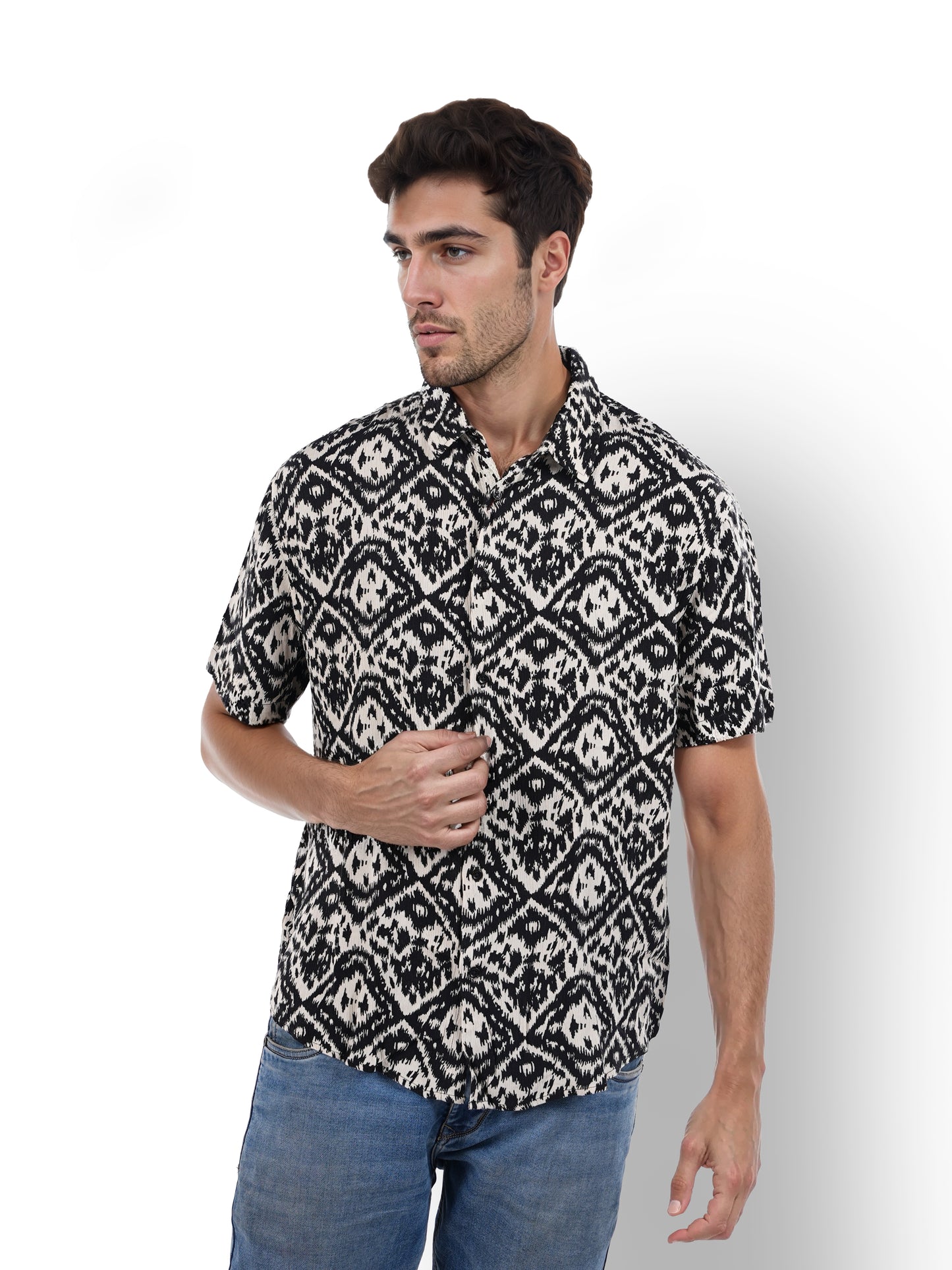 Elevate your casual style with the Celio Men Black Spread Collar Shirt. Crafted from soft viscose rayon, it features a classic fit and short sleeves for ultimate comfort. Disclaimer: All other items in the image are only for display purposes and will not be a part of the delivery content. Product colour may slightly vary due to photographic lighting sources. Country of Origin - India.