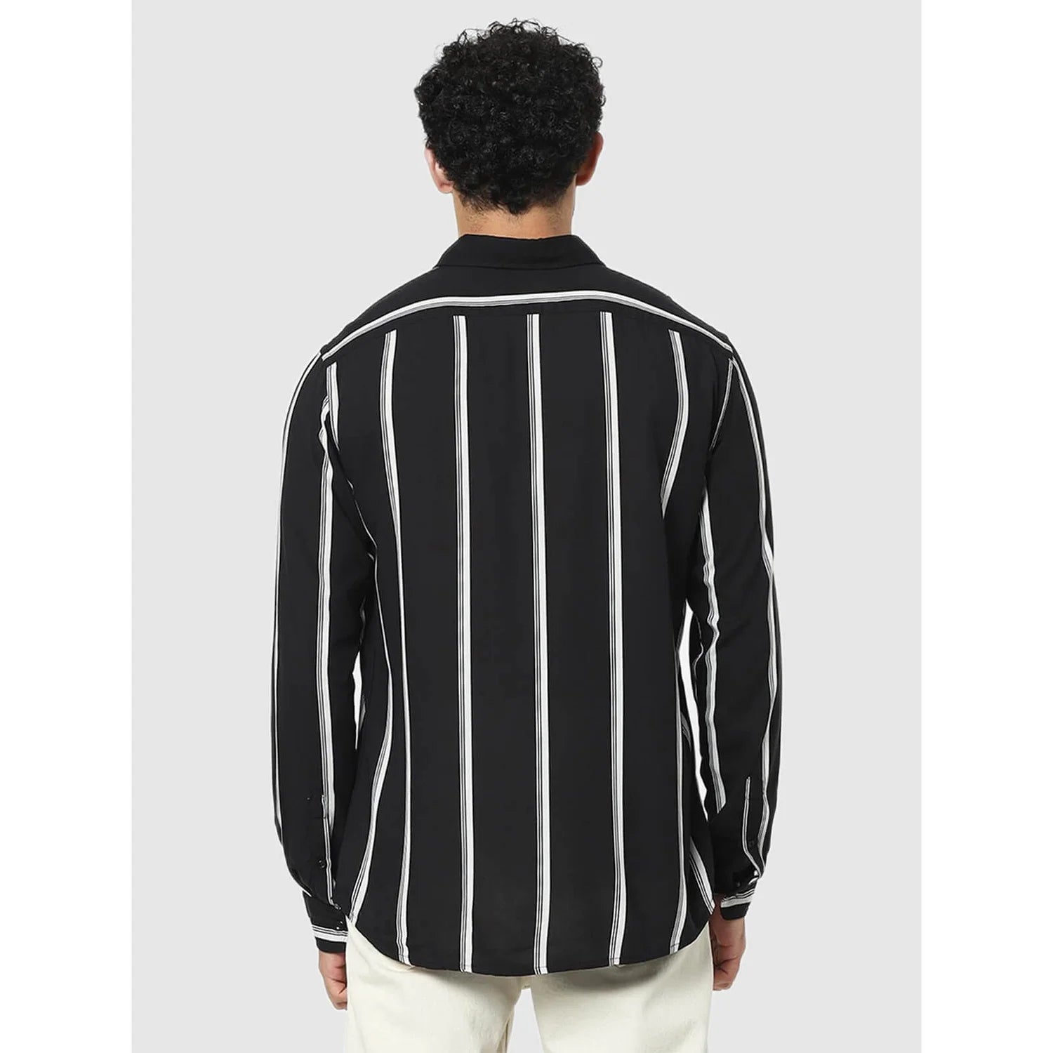 The Celio Black Vertical-Stripes Regular Fit Shirt is a stylish casual wear for men, featuring long sleeves and made from soft viscose fabric, perfect for any occasion. Disclaimer: All other items in the image are only for display purposes and will not be a part of the delivery content. Product colour may slightly vary due to photographic lighting sources. Country of Origin - India.