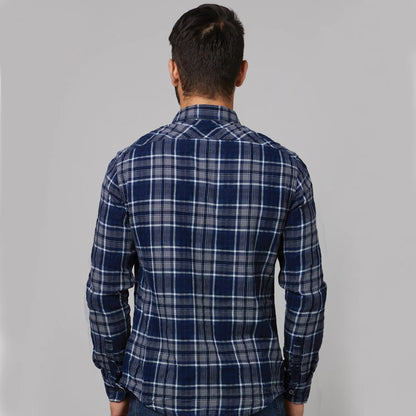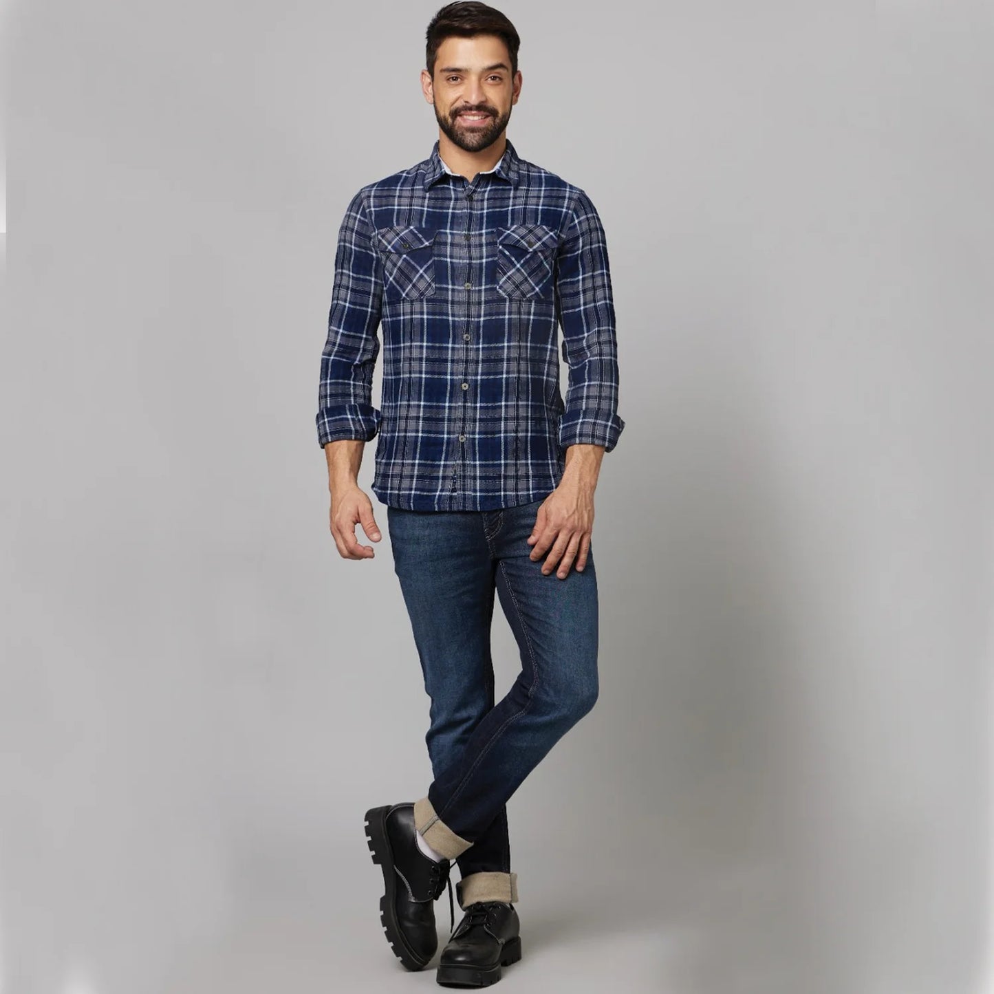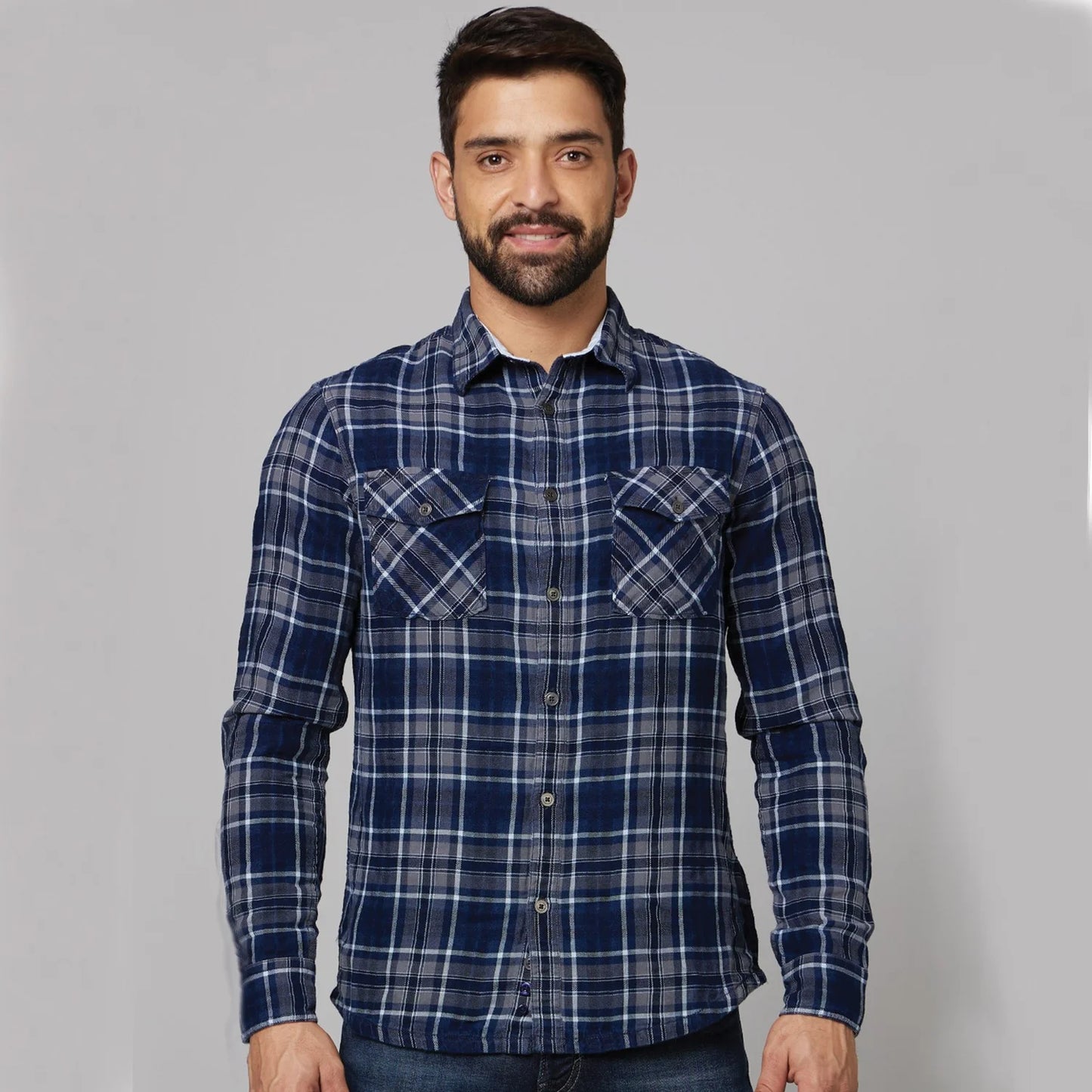 Shop the Celio Checked Regular Fit Casual Shirt in Indigo, perfect for men. Made from comfortable cotton, this blue long-sleeve shirt is ideal for casual occasions. Disclaimer: All other items in the image are only for display purposes and will not be a part of the delivery content. Product colour may slightly vary due to photographic lighting sources. Country of Origin - India.