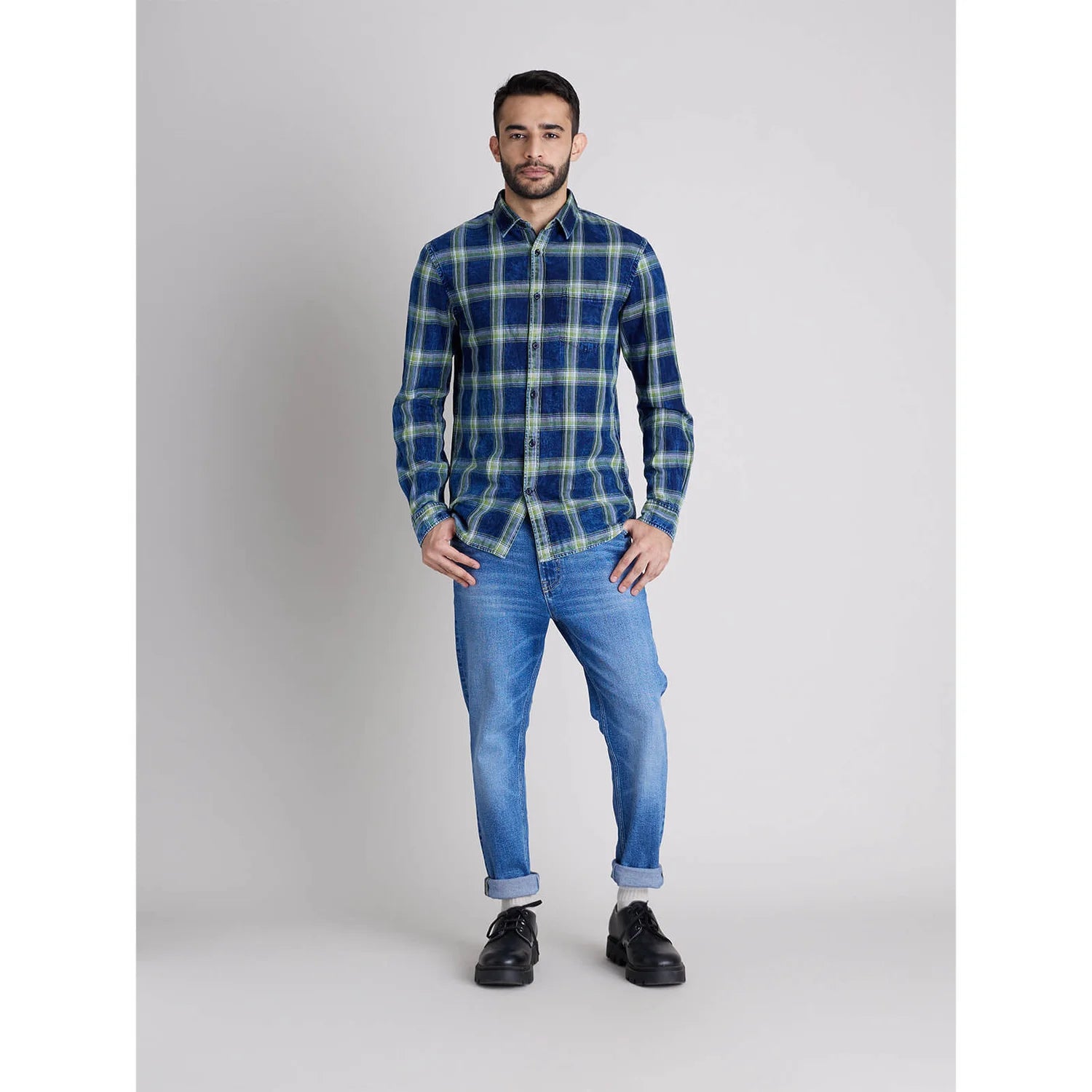 Discover comfort and style with the Celio Men's Yarn Dyed Checks Shirt in Blue. Made from cotton, this long-sleeve shirt is perfect for casual occasions. Disclaimer: All other items in the image are only for display purposes and will not be a part of the delivery content. Product colour may slightly vary due to photographic lighting sources. Country of Origin - India.