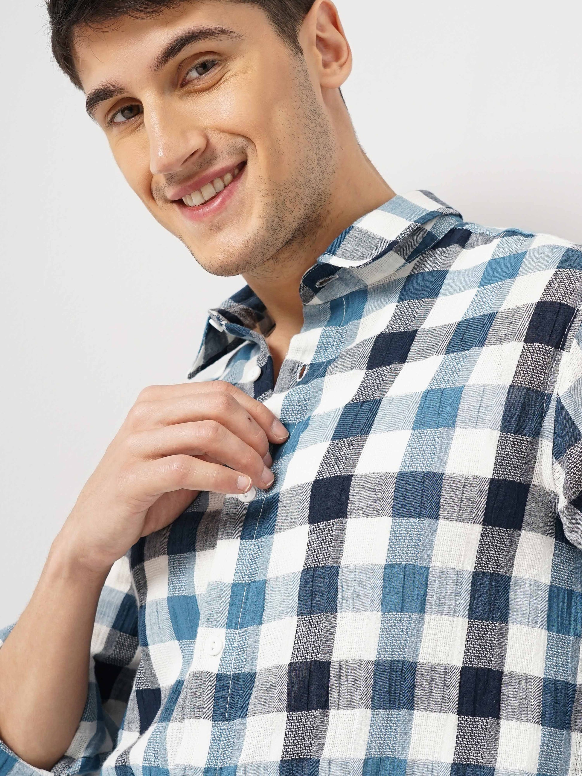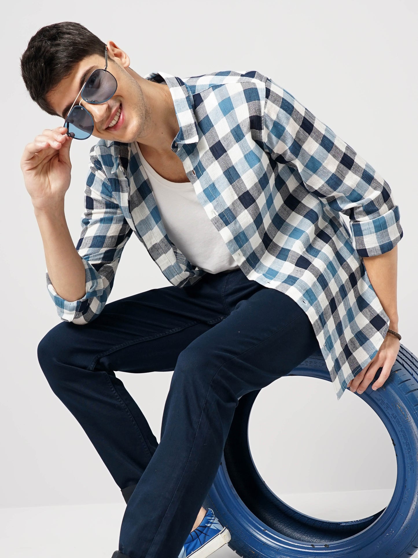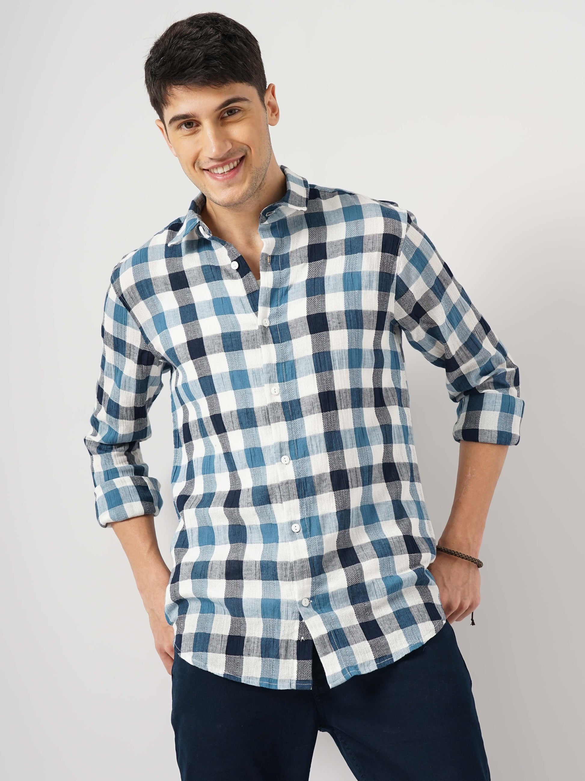 Elevate your casual wardrobe with the Celio Men Checked Regular Fit Cotton Casual Shirt in blue. Perfect for everyday wear, featuring long sleeves for a stylish look. Disclaimer: All other items in the image are only for display purposes and will not be a part of the delivery content. Product colour may slightly vary due to photographic lighting sources. Country of Origin - India.