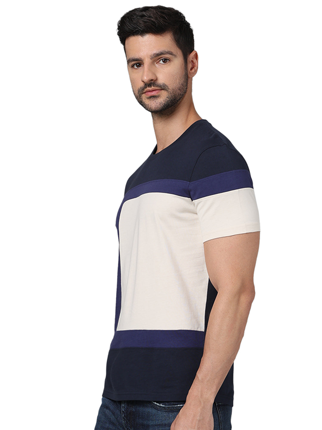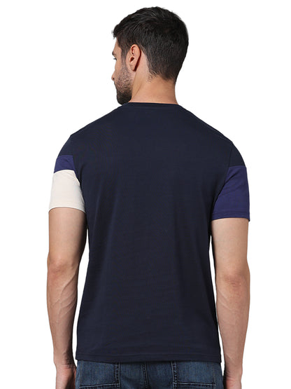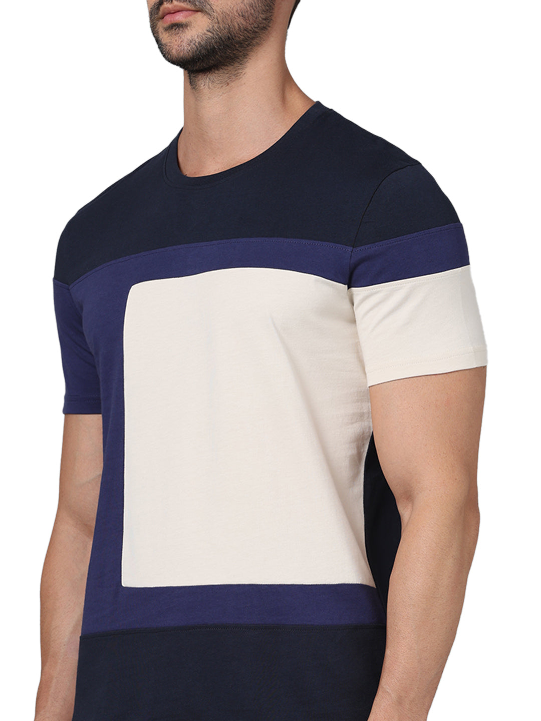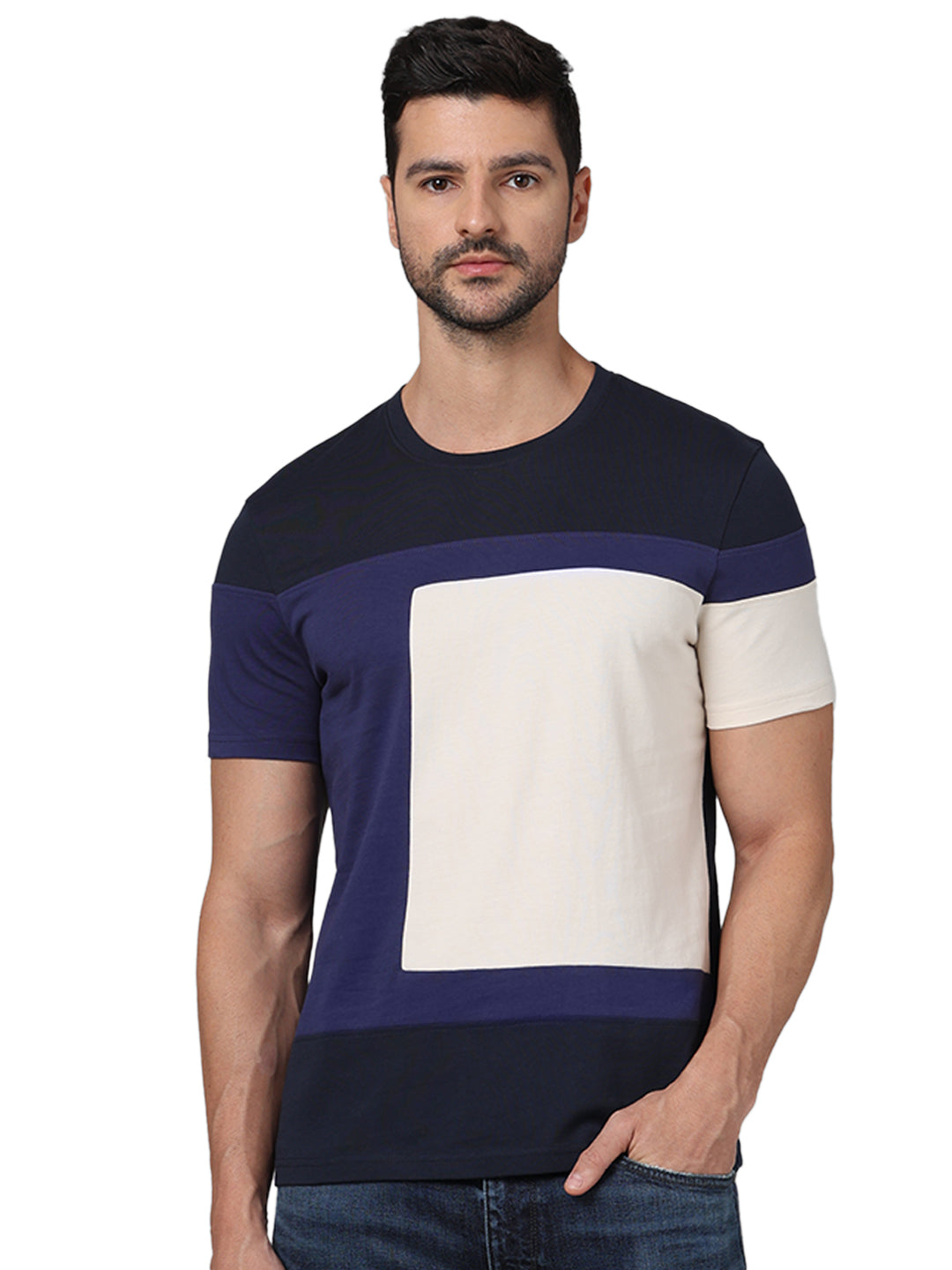 Discover comfort and style with the Celio Men blue Round Neck Colourblocked T-shirt. Made of cotton, it's perfect for casual outings. Featuring short sleeves for a relaxed look. Disclaimer: All other items in the image are only for display purposes and will not be a part of the delivery content. Product colour may slightly vary due to photographic lighting sources. Country of Origin - India.