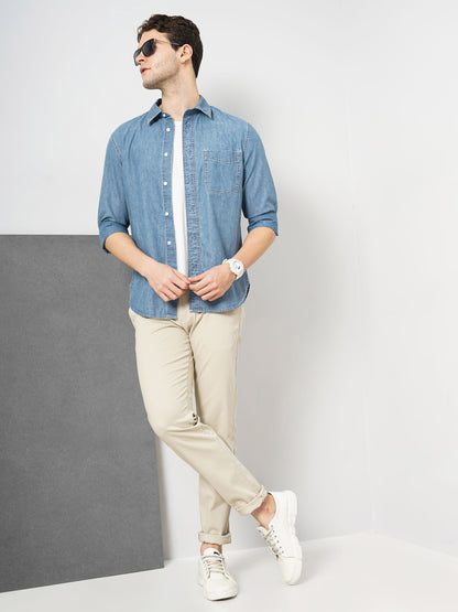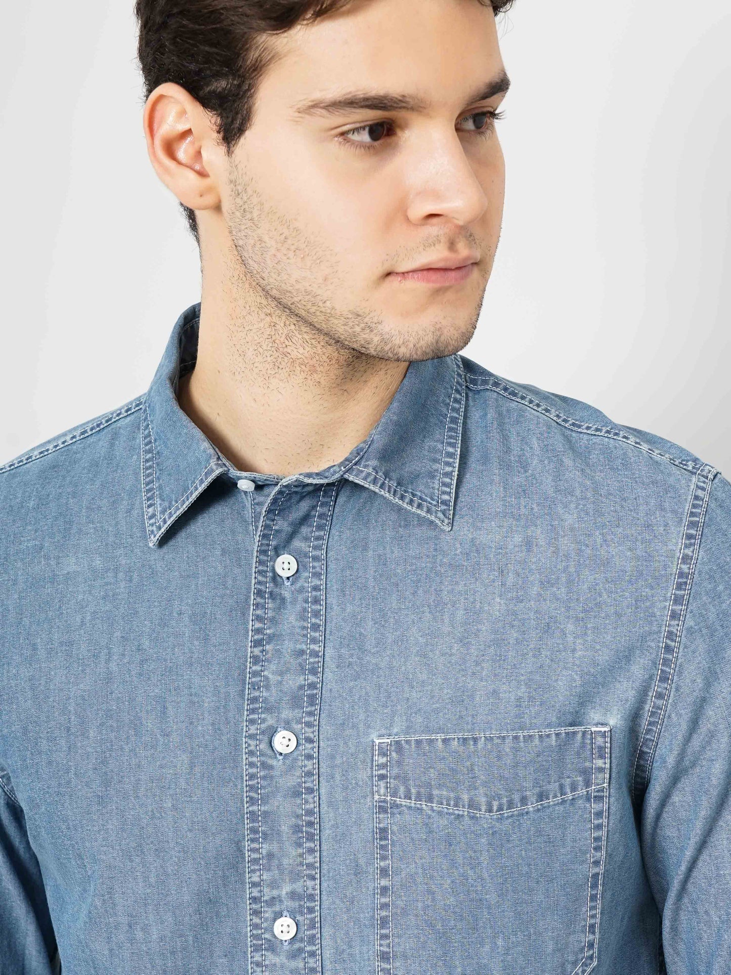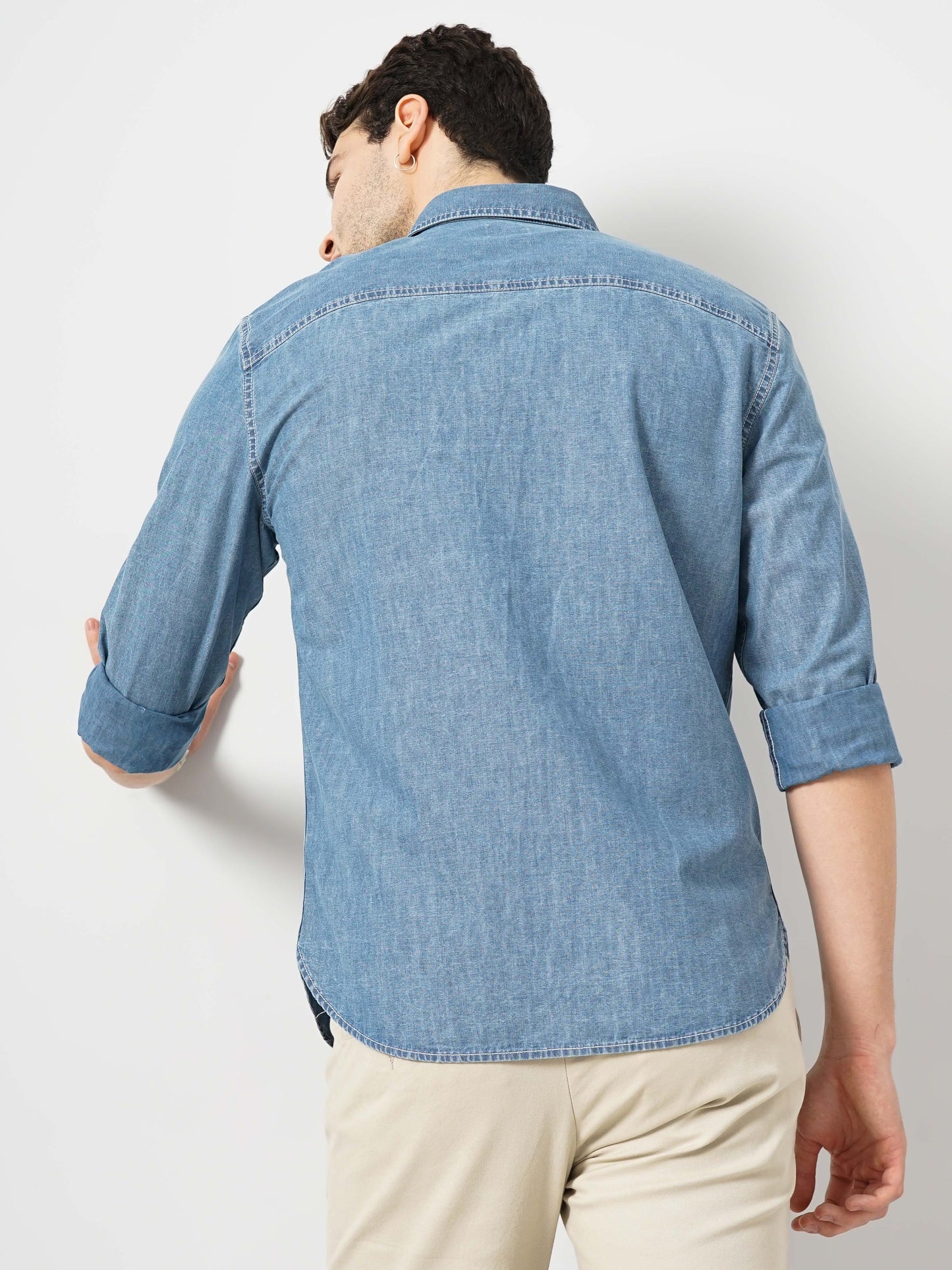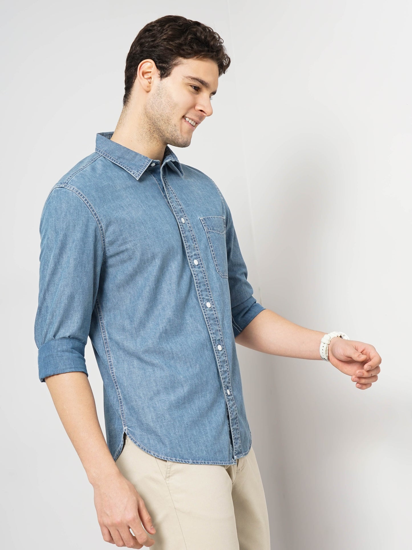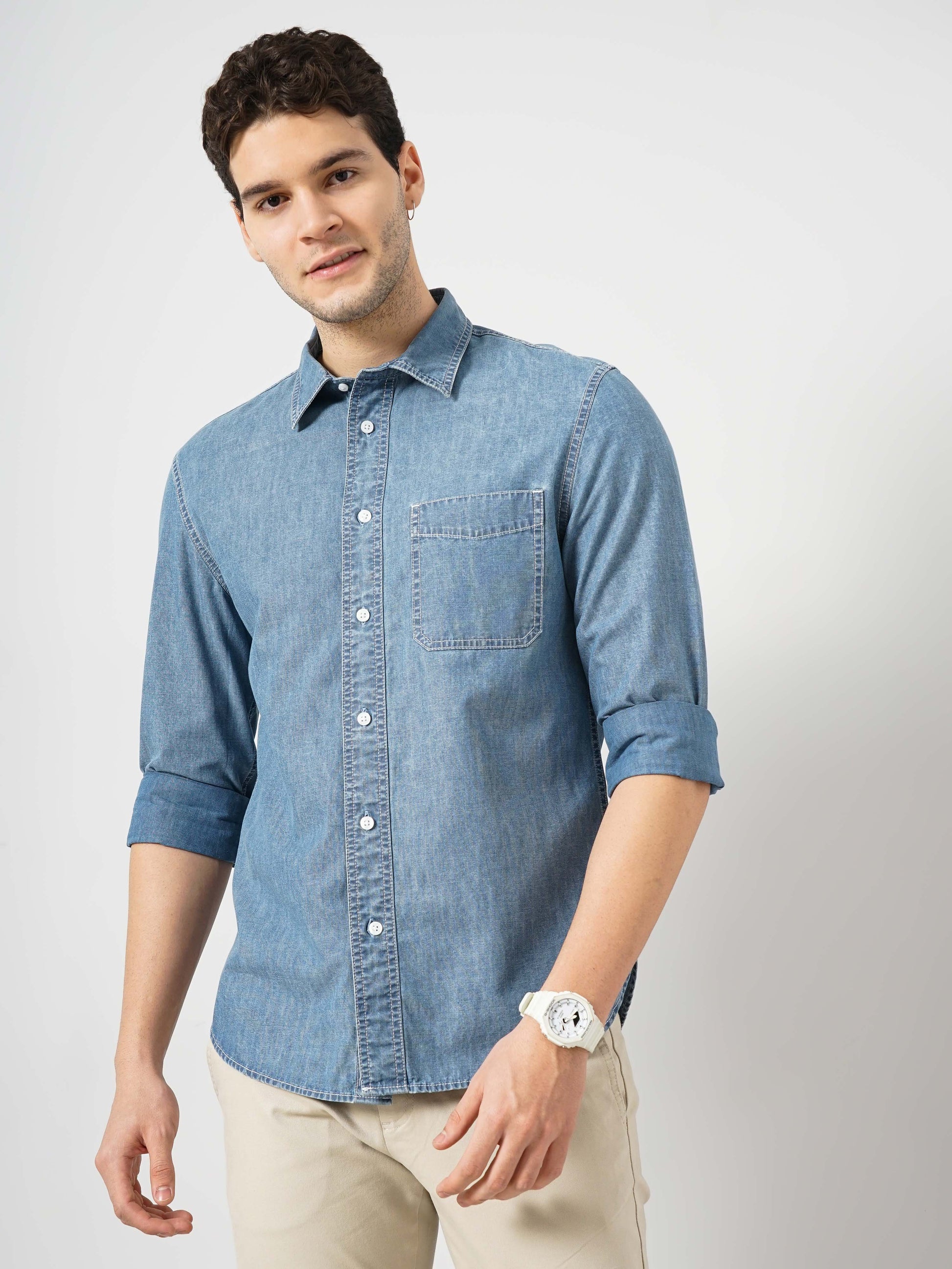 Stylish Men Faded Regular Fit Denim Shirt by Celio. Crafted from soft cotton, this blue casual shirt features long sleeves, perfect for a laid-back look. Disclaimer: All other items in the image are only for display purposes and will not be a part of the delivery content. Product colour may slightly vary due to photographic lighting sources. Country of Origin - India.