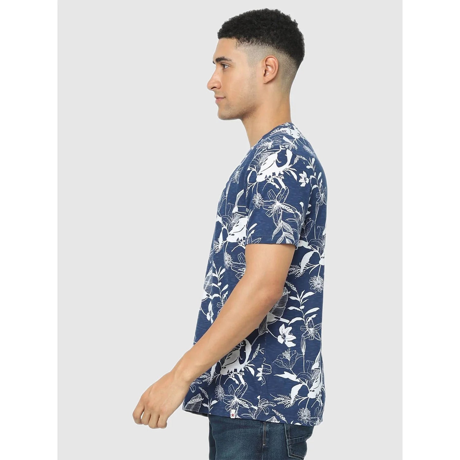 Shop the Celio Blue Floral Regular Fit T-Shirt for men. Made of comfortable cotton, this casual half-sleeve tee is perfect for everyday wear and adds a stylish touch to your wardrobe. Disclaimer: All other items in the image are only for display purposes and will not be a part of the delivery content. Product colour may slightly vary due to photographic lighting sources. Country of Origin - India.