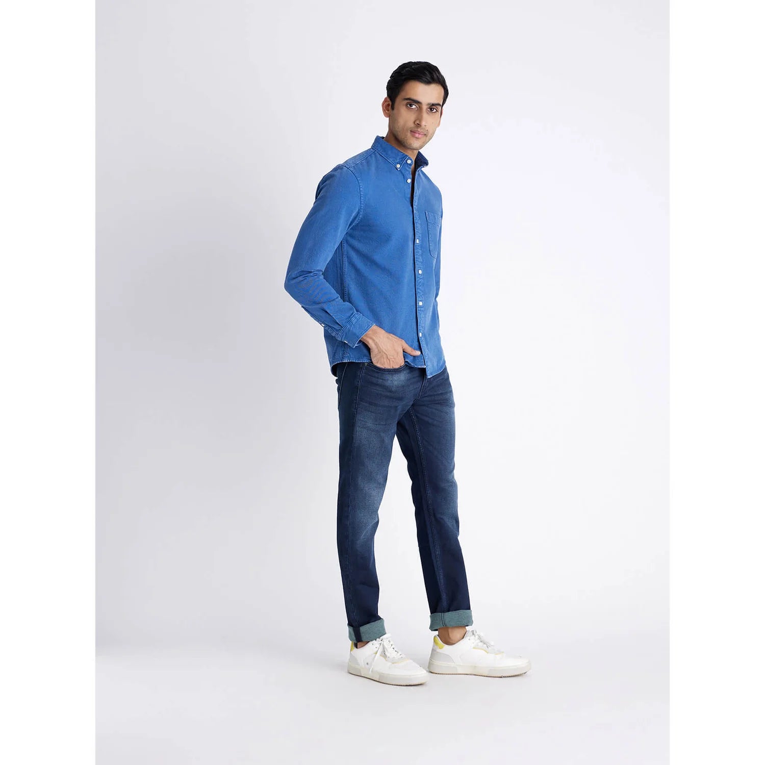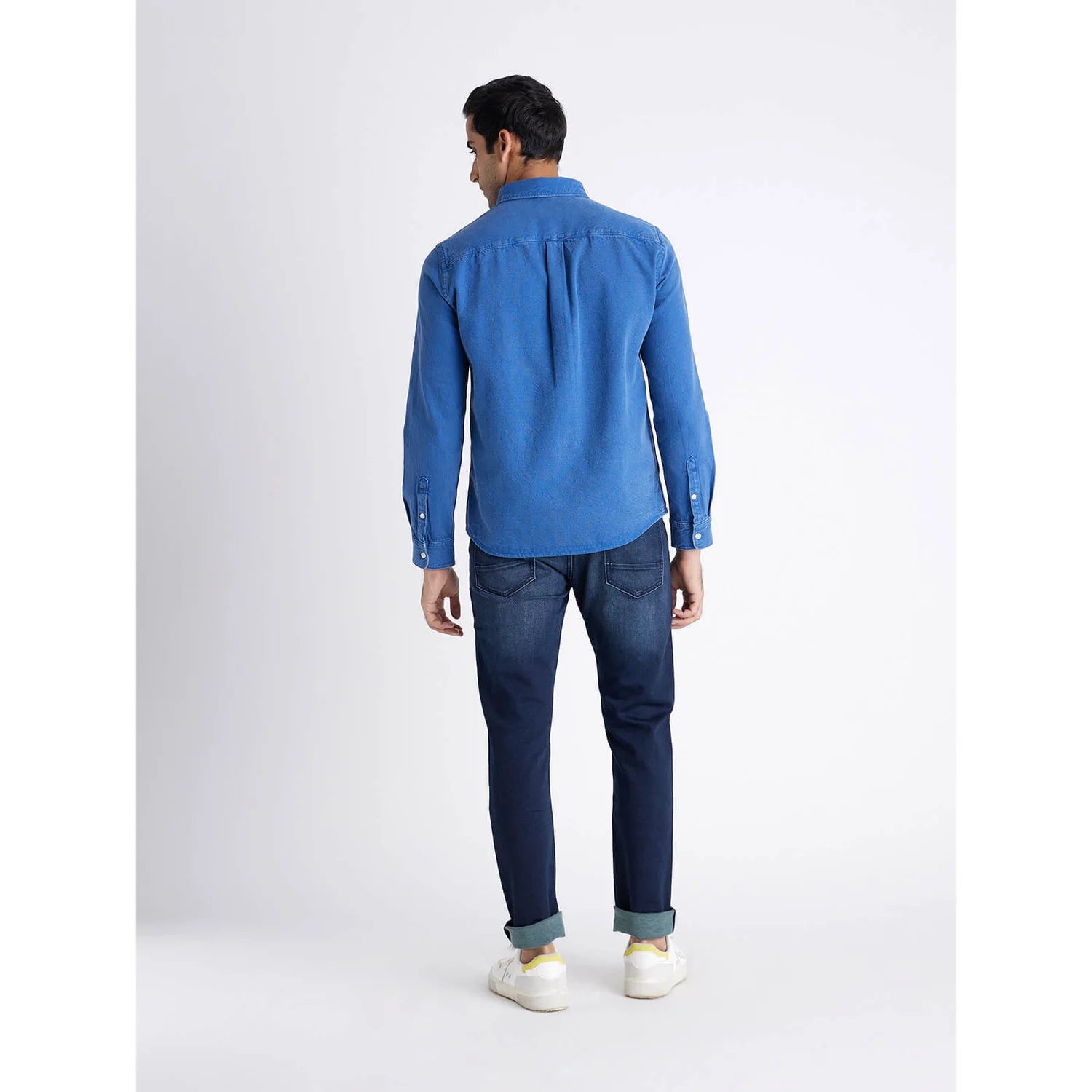 Discover style with the Celio Men's Blue Abstract Denim Shirt. Crafted from cotton, this long-sleeve shirt is perfect for casual occasions and offers a trendy look. Disclaimer: All other items in the image are only for display purposes and will not be a part of the delivery content. Product colour may slightly vary due to photographic lighting sources. Country of Origin - India.