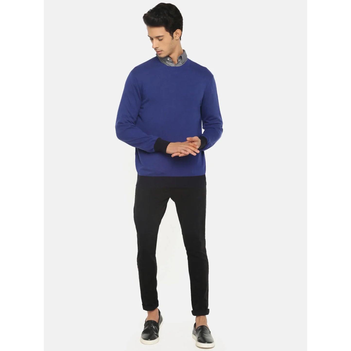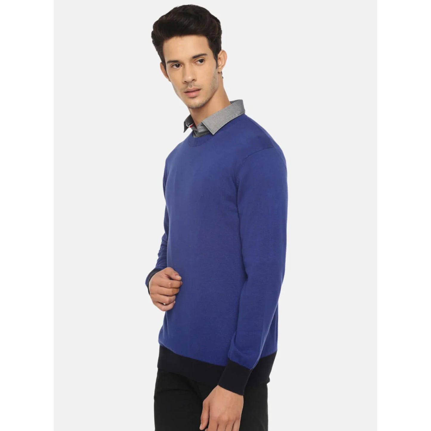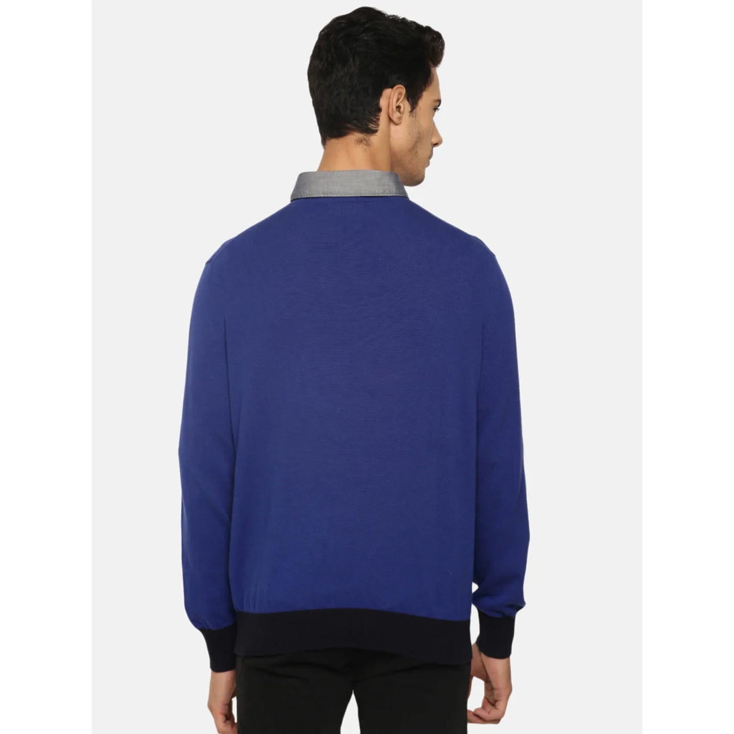 The Celio Men's Blue Solid Sweater in Pecool Blue features a casual design with short sleeves. Made from comfortable cotton, it's perfect for everyday wear. Disclaimer: All other items in the image are only for display purposes and will not be a part of the delivery content. Product colour may slightly vary due to photographic lighting sources. Country of Origin - India.