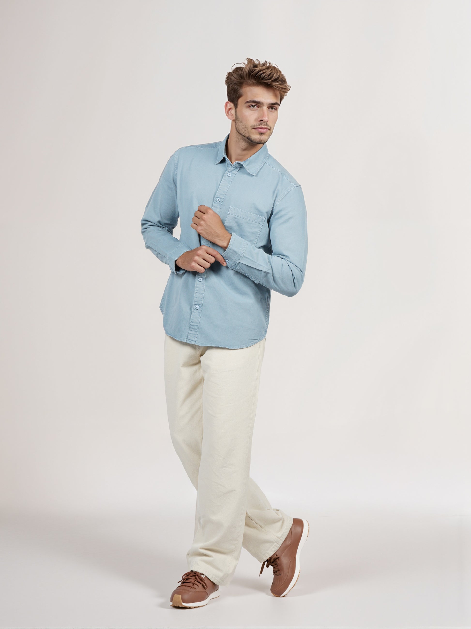This Celio men's shirt in blue features a solid design with long sleeves, crafted from comfortable cotton. Perfect for casual occasions, it ensures a stylish and relaxed fit. Disclaimer: All other items in the image are only for display purposes and will not be a part of the delivery content. Product colour may slightly vary due to photographic lighting sources. Country of Origin - India.