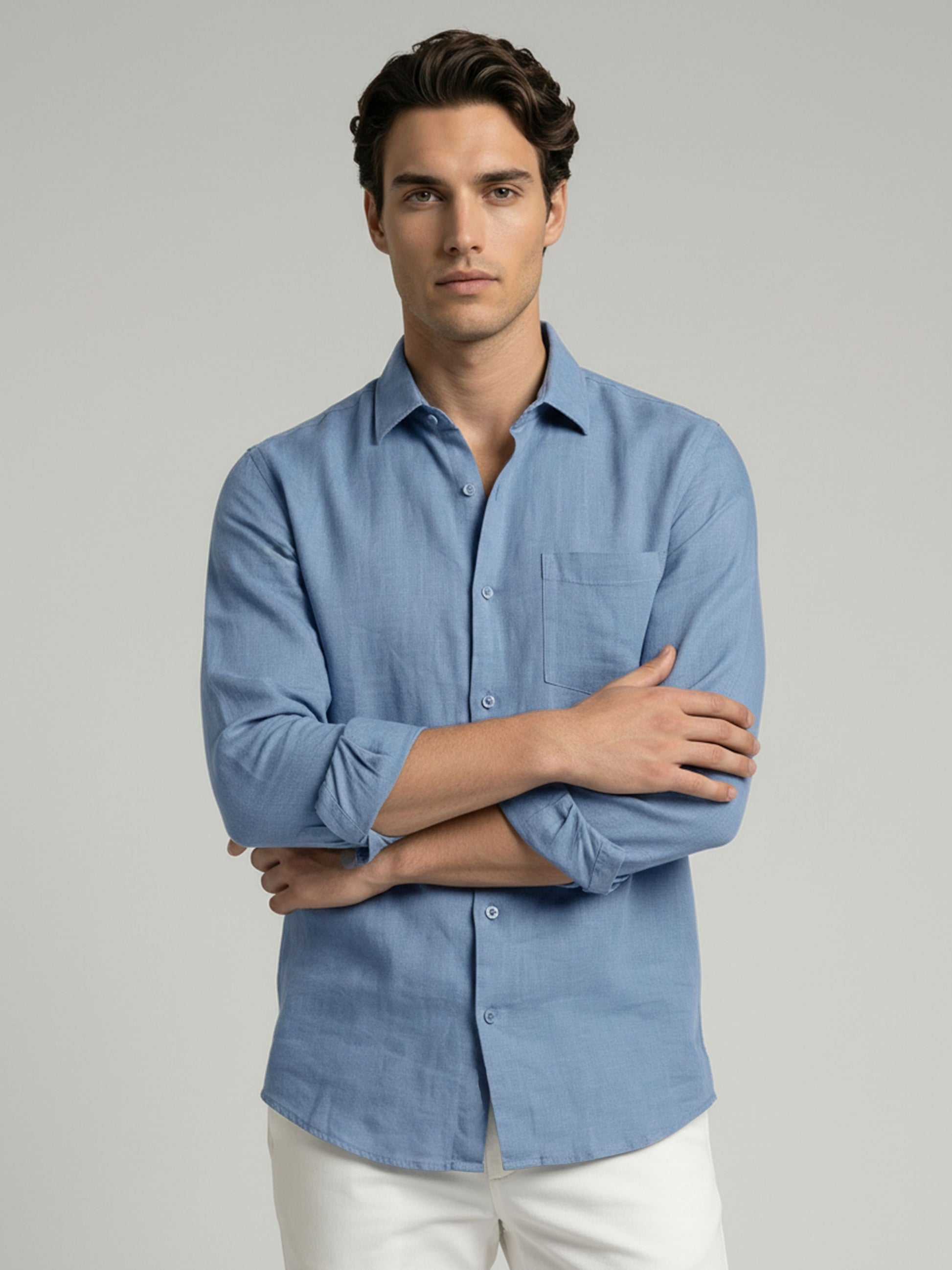 This Celio men’s shirt features a solid blue design made from comfortable cotton linen. With long sleeves, it's perfect for casual occasions. Disclaimer: All other items in the image are only for display purposes and will not be a part of the delivery content. Product colour may slightly vary due to photographic lighting sources. Country of Origin - India.