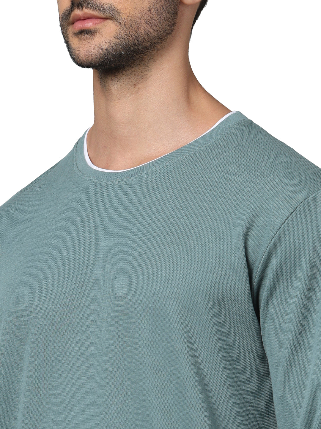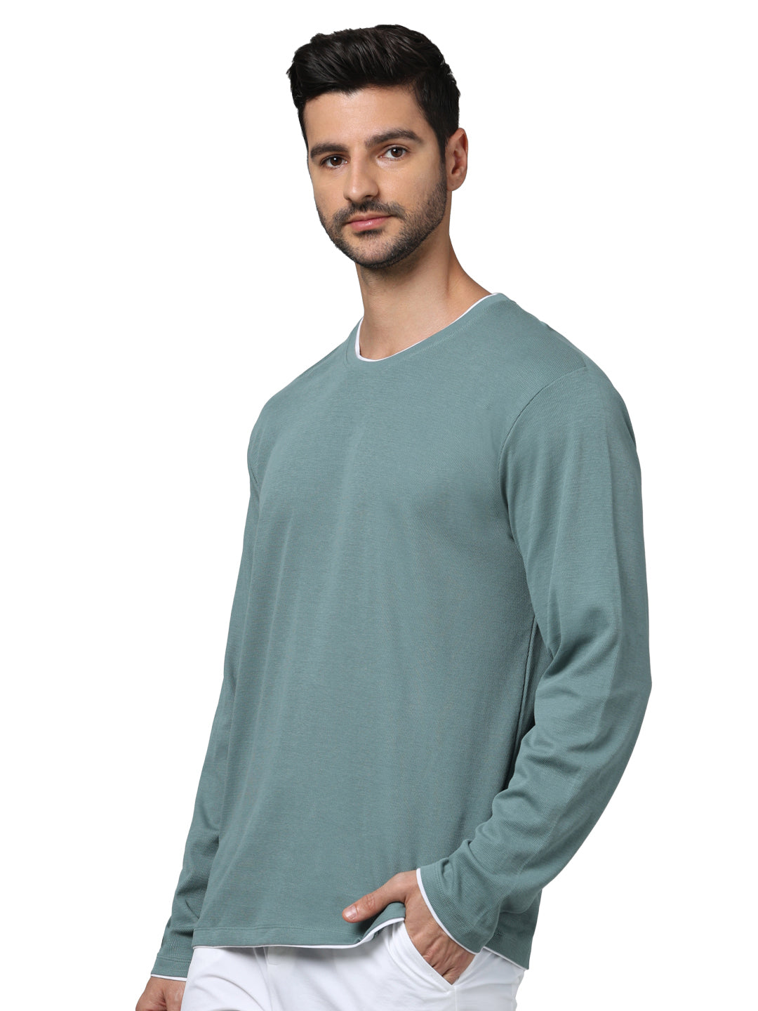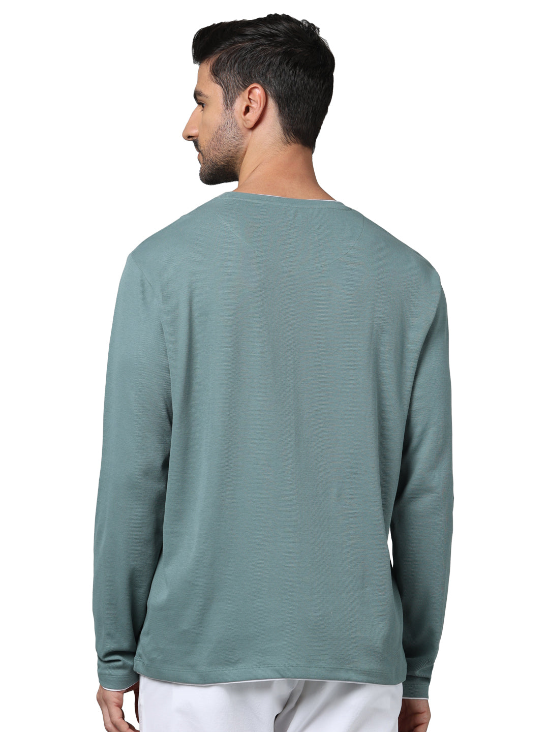 Shop the Celio Men Blue Round Neck Solid T-shirt, crafted from soft cotton. Ideal for casual wear, this regular fit tee features long sleeves for comfort and style. Disclaimer: All other items in the image are only for display purposes and will not be a part of the delivery content. Product colour may slightly vary due to photographic lighting sources. Country of Origin - India.