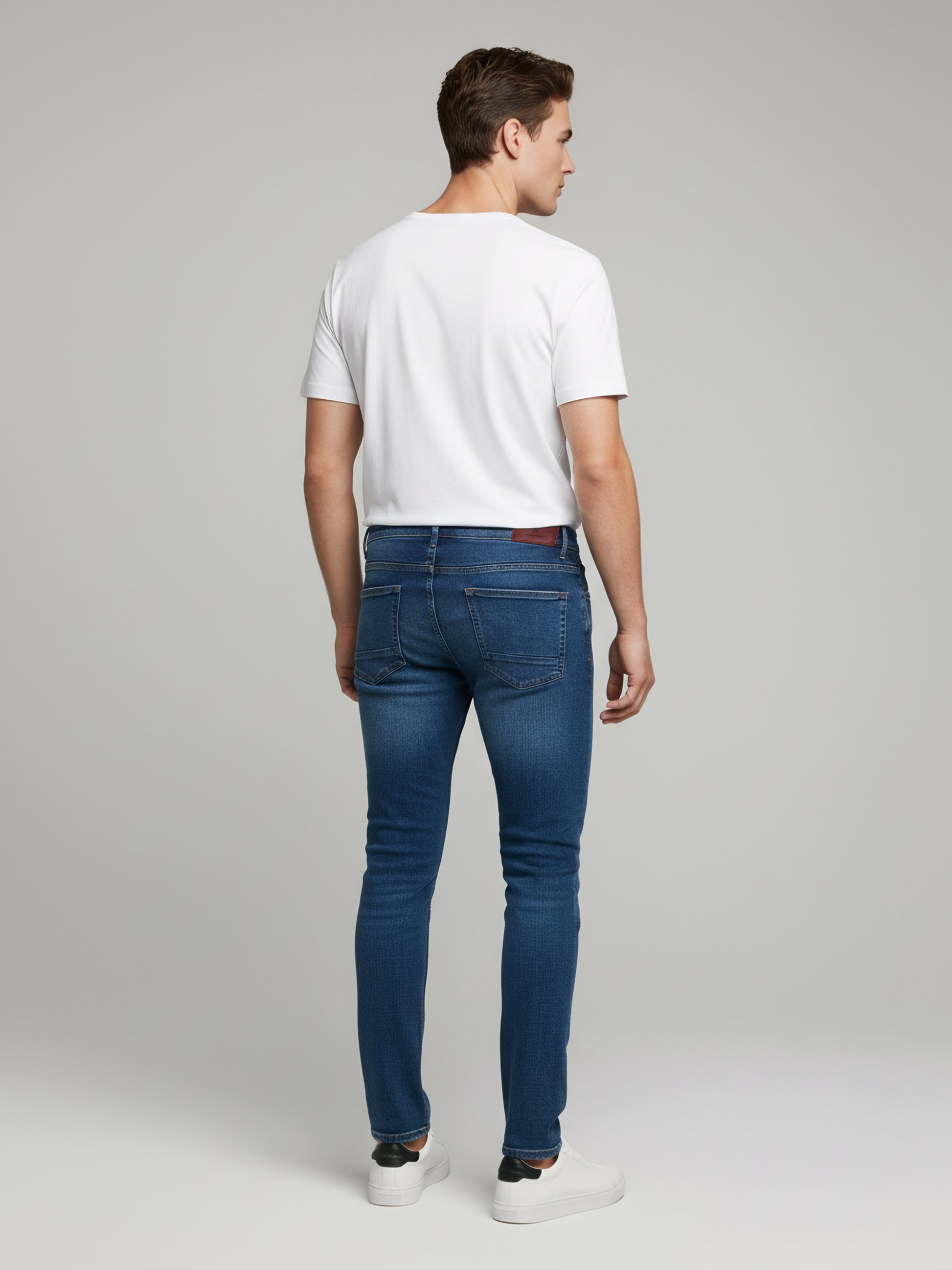 Upgrade your casual wardrobe with Celio's blue solid skinny fit ankle length jeans for men, crafted from comfortable cotton. Perfect for any laid-back occasion. Disclaimer: All other items in the image are only for display purposes and will not be a part of the delivery content. Product colour may slightly vary due to photographic lighting sources. Country of Origin - India.
