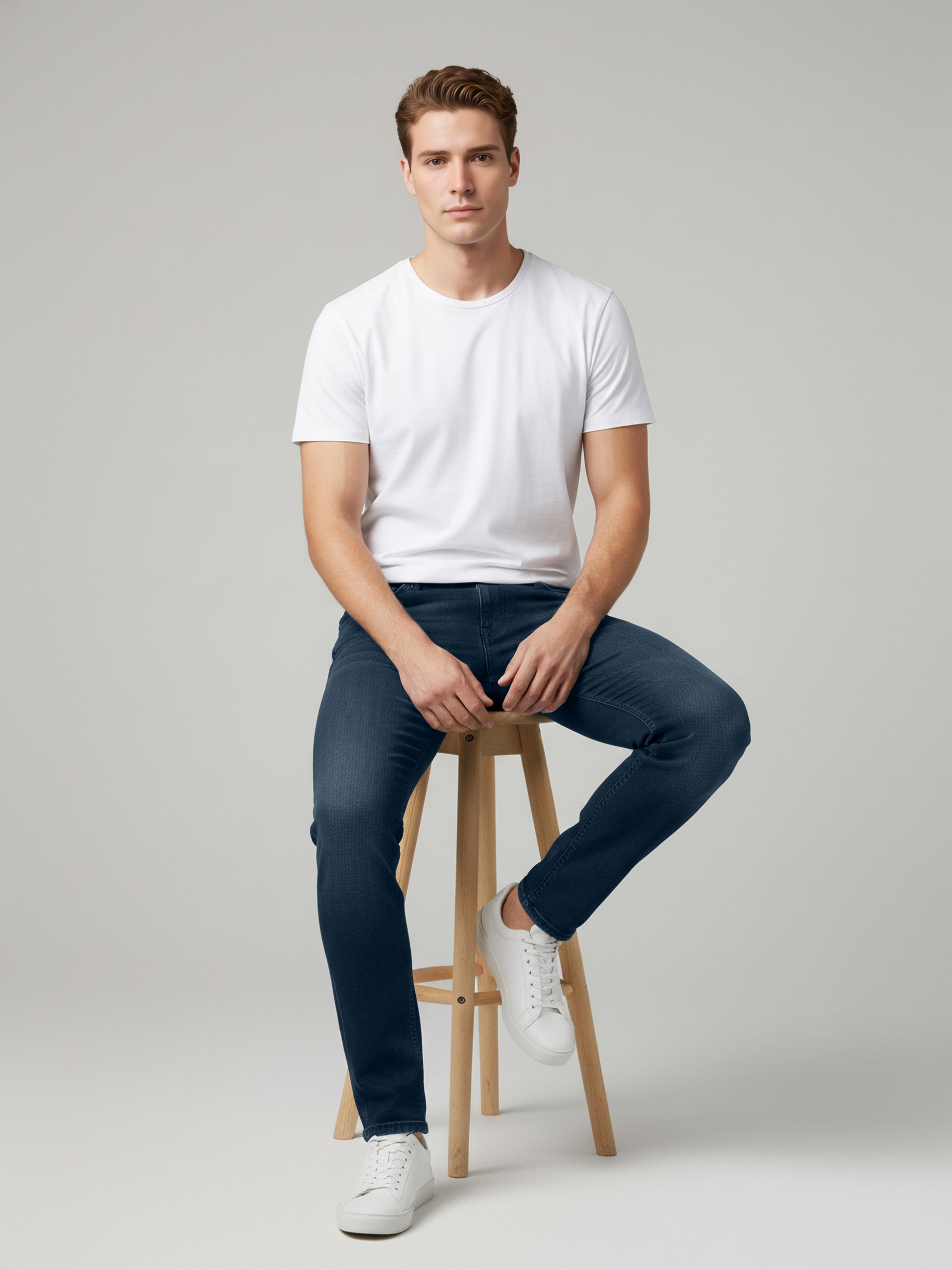 Discover Celio's blue solid slim fit cotton knit jeans, designed for men. Perfect for casual occasions, these jeans combine comfort and style effortlessly. Disclaimer: All other items in the image are only for display purposes and will not be a part of the delivery content. Product colour may slightly vary due to photographic lighting sources. Country of Origin - India.