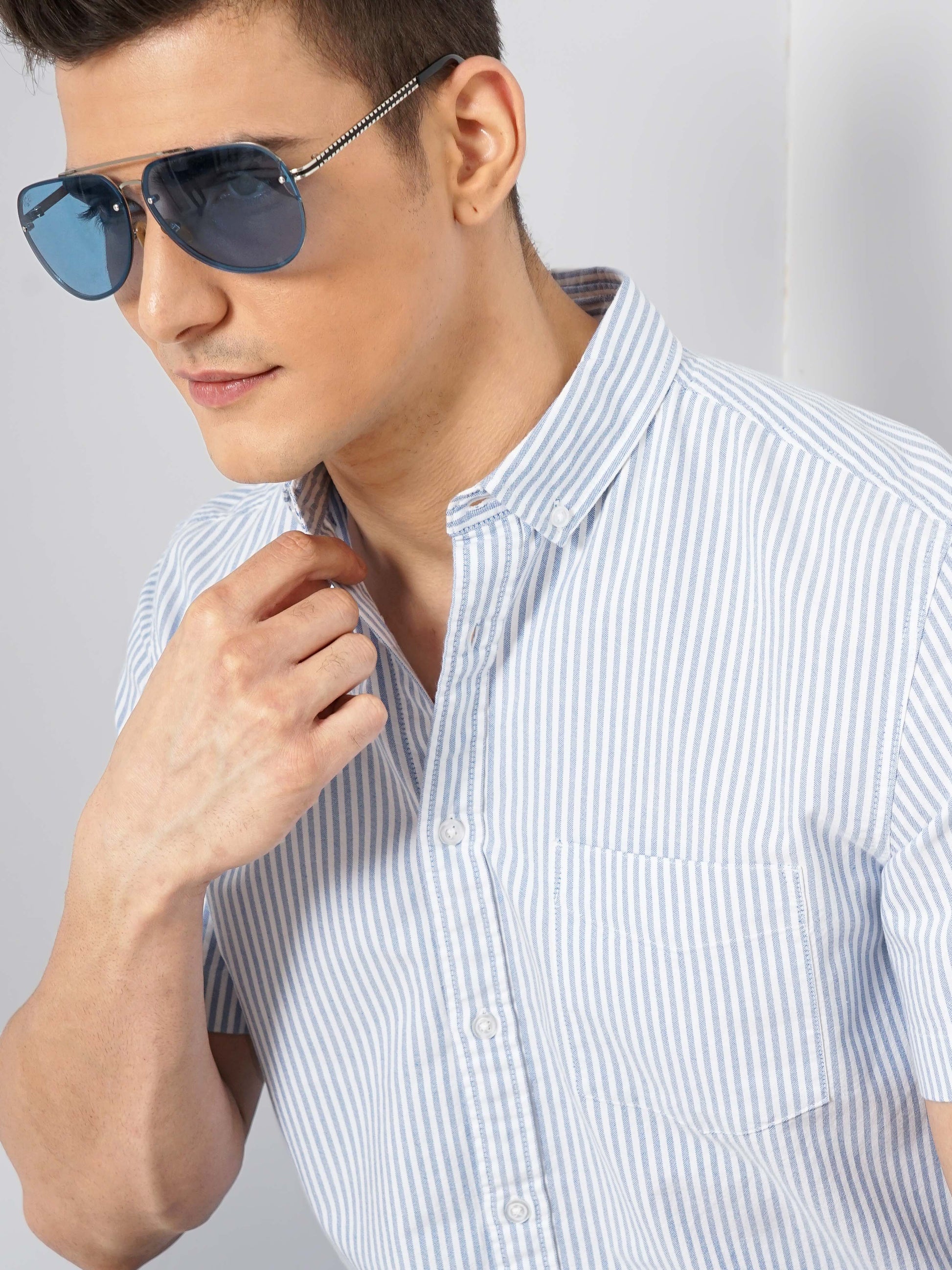 Elevate your casual wardrobe with the Celio Men Blue Button-Down Collar Striped Cotton Shirt. Crafted from soft cotton, it features short sleeves and a stylish blue stripe design. Disclaimer: All other items in the image are only for display purposes and will not be a part of the delivery content. Product colour may slightly vary due to photographic lighting sources. Country of Origin - India.