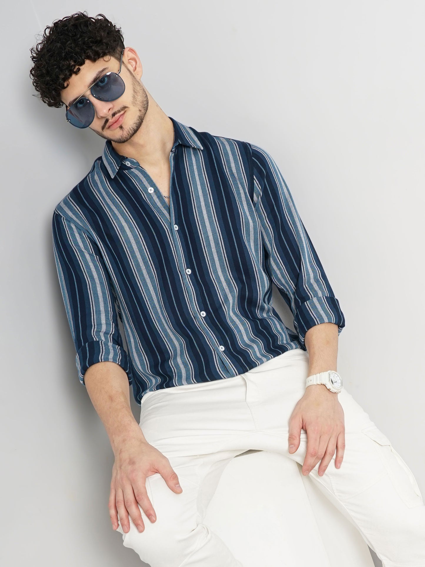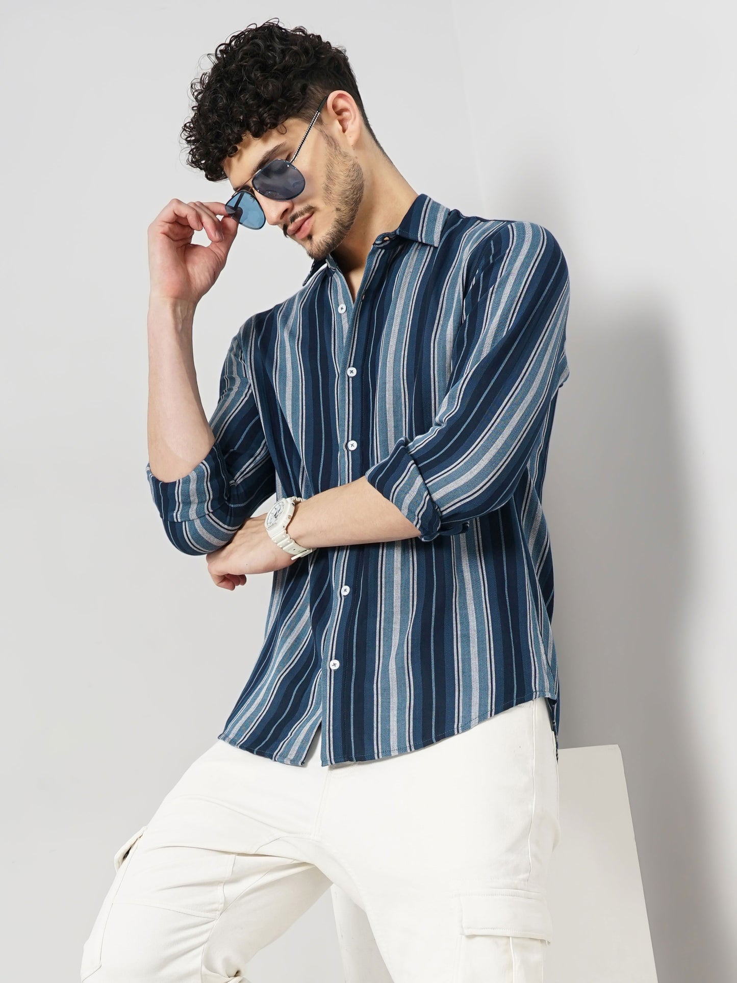Elevate your casual wardrobe with the Celio Men Striped Cotton Shirt in vibrant blue. Designed for comfort, it features long sleeves and a regular fit, perfect for any casual occasion. Disclaimer: All other items in the image are only for display purposes and will not be a part of the delivery content. Product colour may slightly vary due to photographic lighting sources. Country of Origin - India.