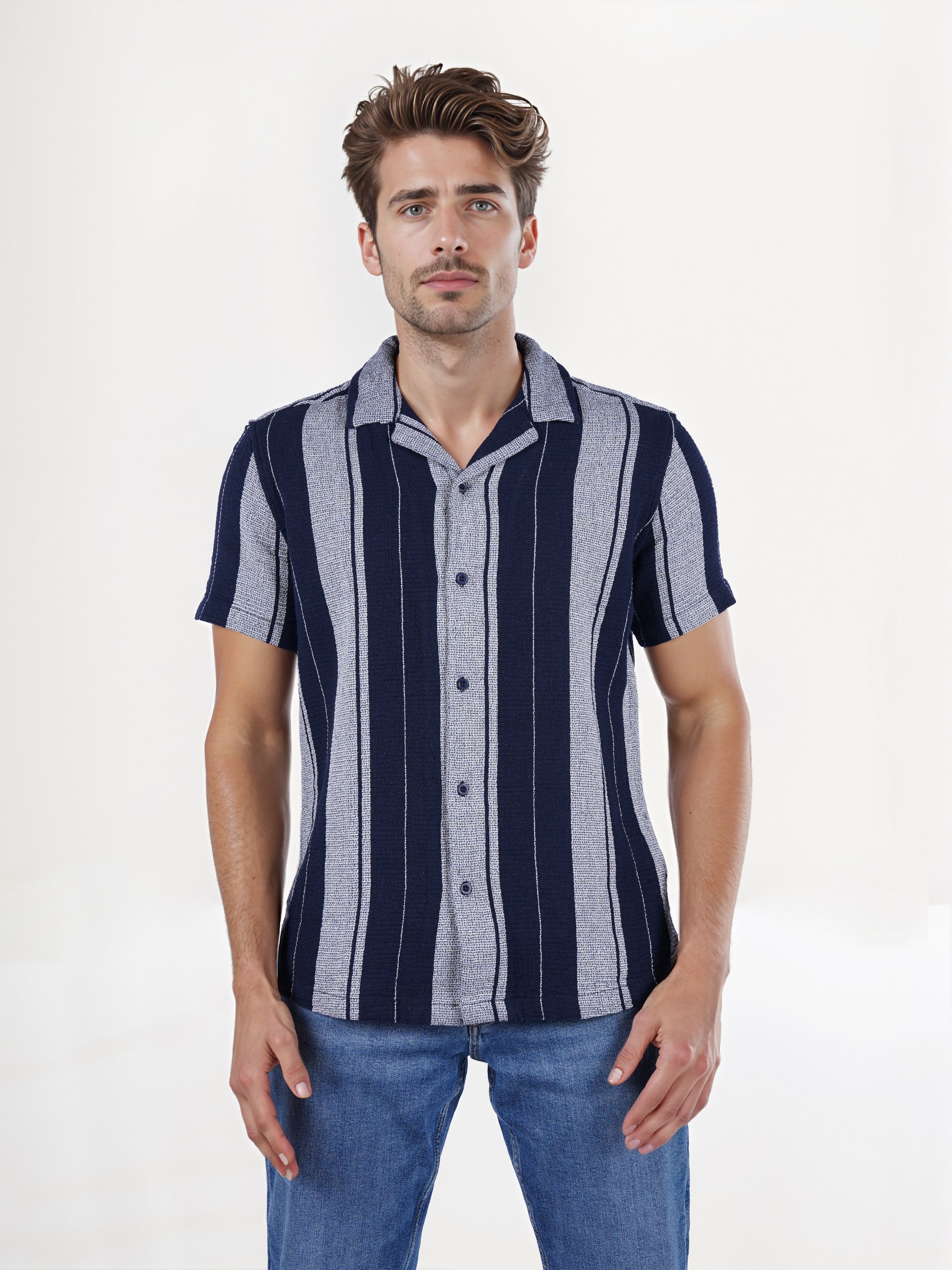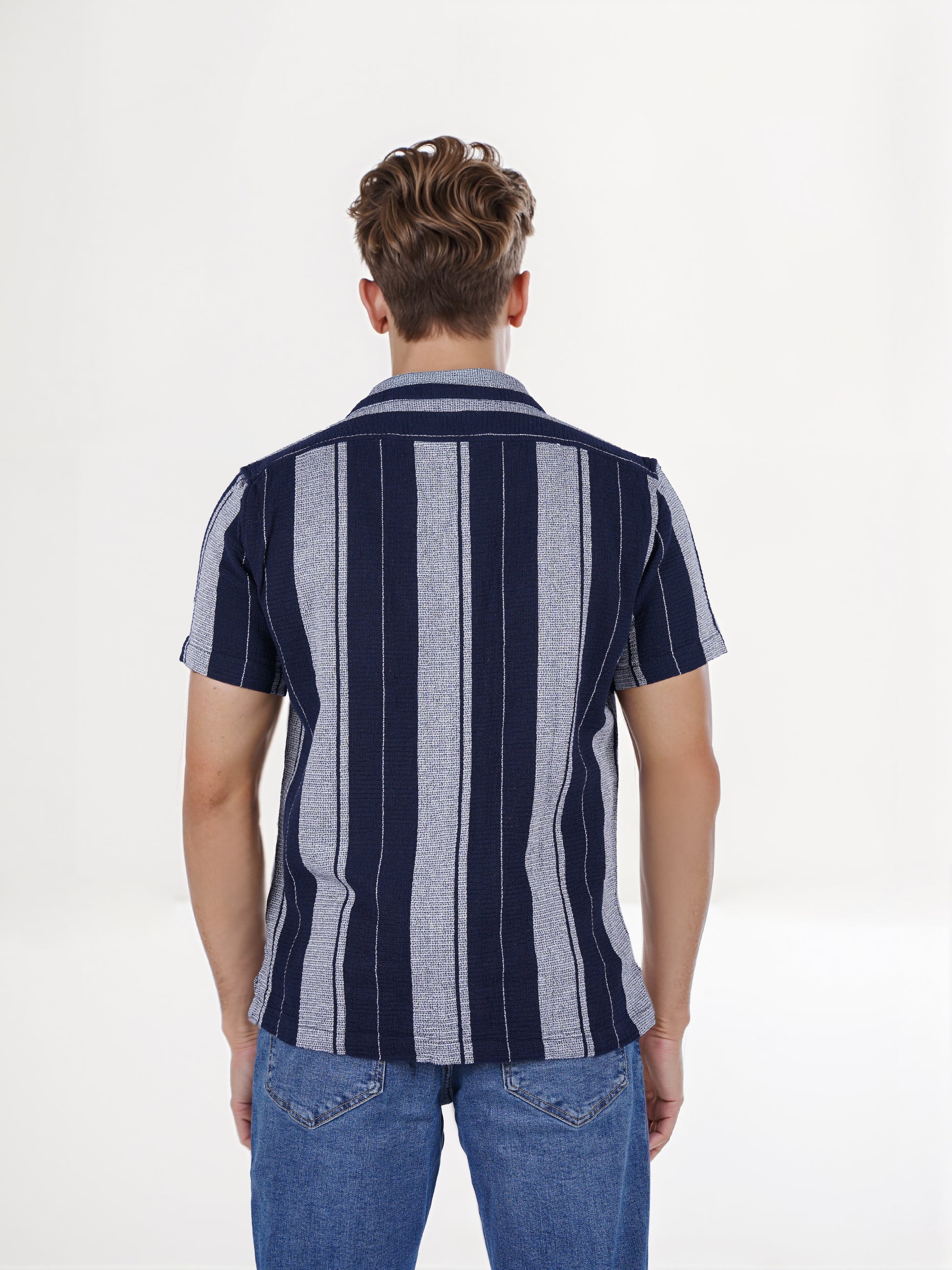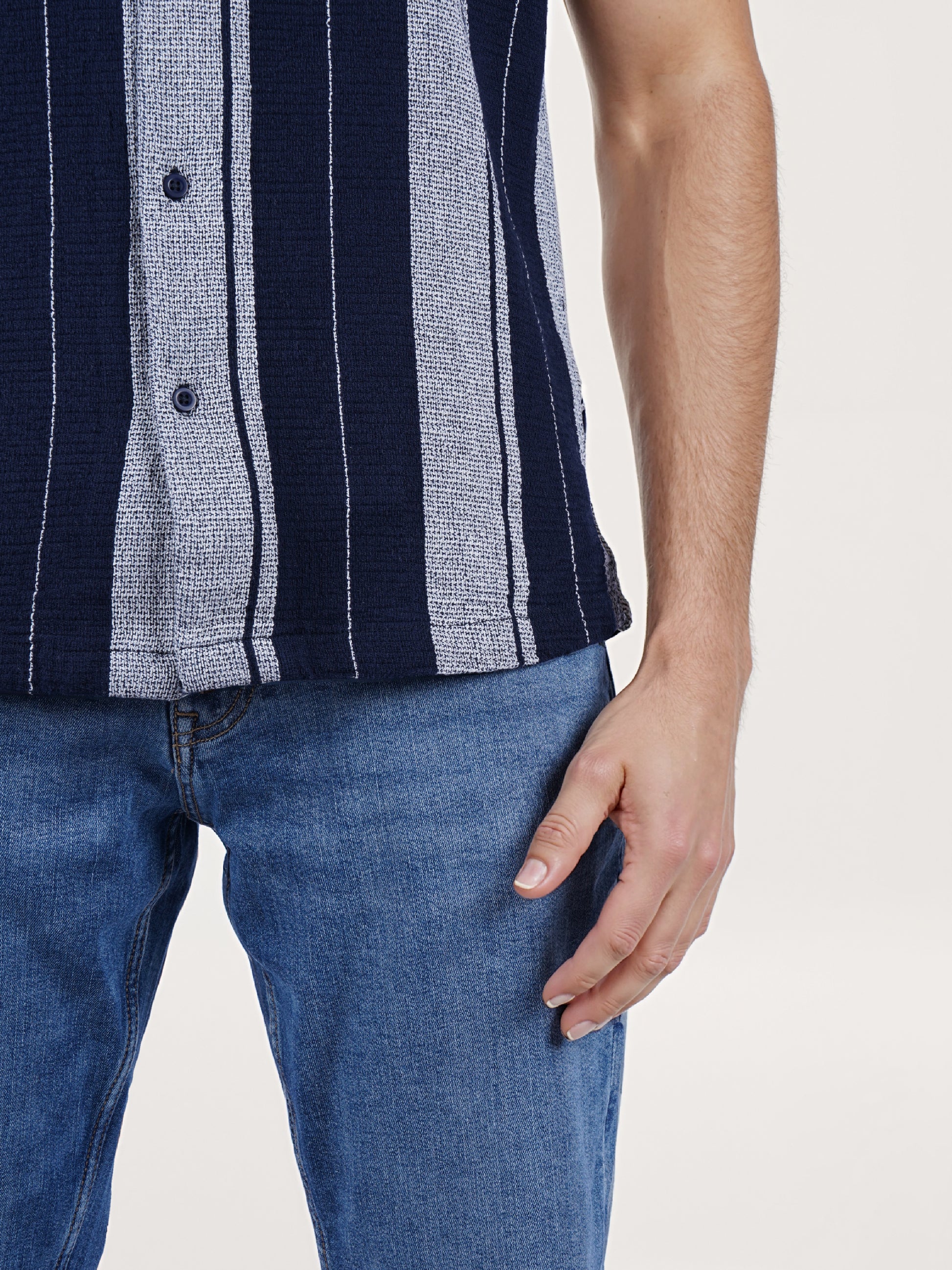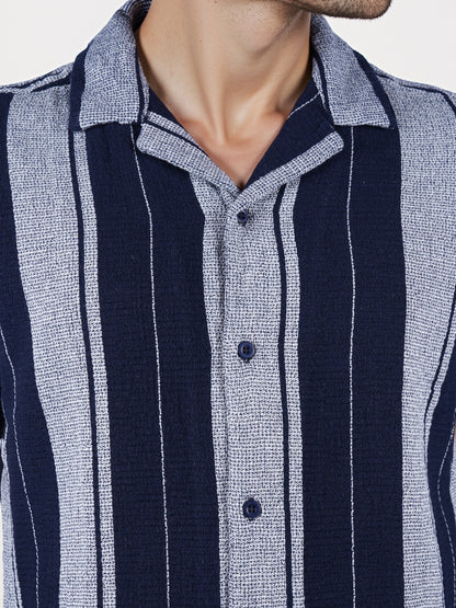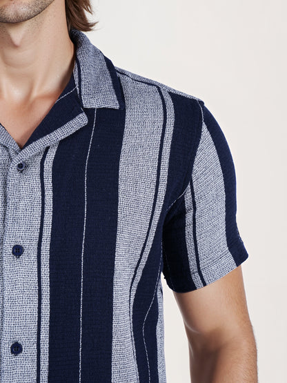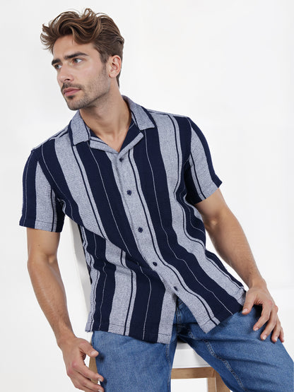 The Celio Men Blue Striped Shirt features a regular fit with short sleeves, crafted from soft cotton, perfect for casual occasions. Disclaimer: All other items in the image are only for display purposes and will not be a part of the delivery content. Product colour may slightly vary due to photographic lighting sources. Country of Origin - India.