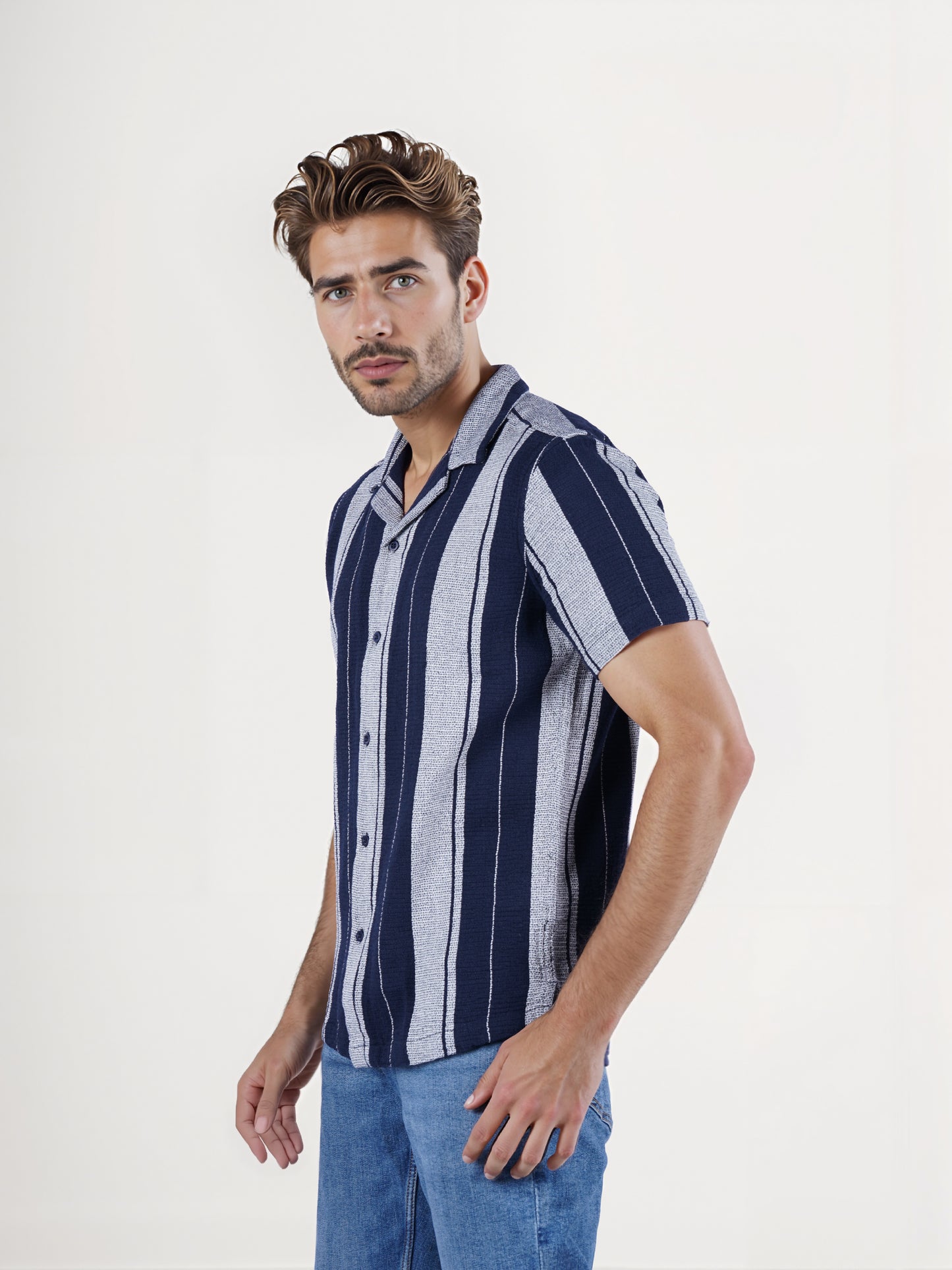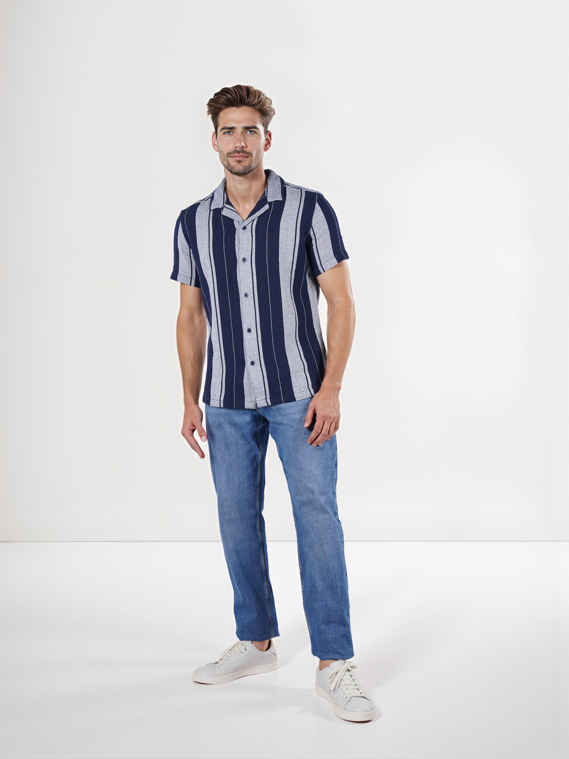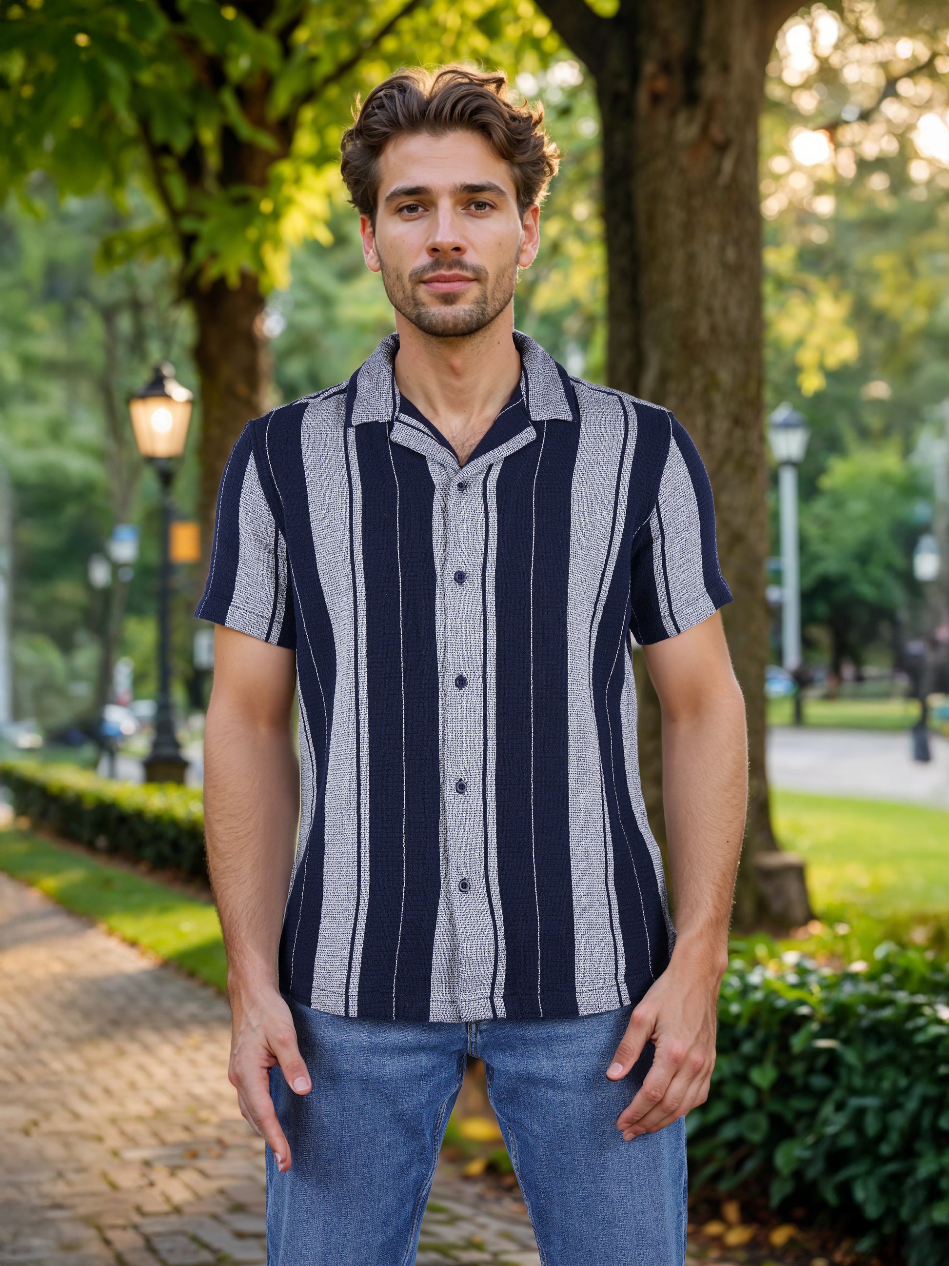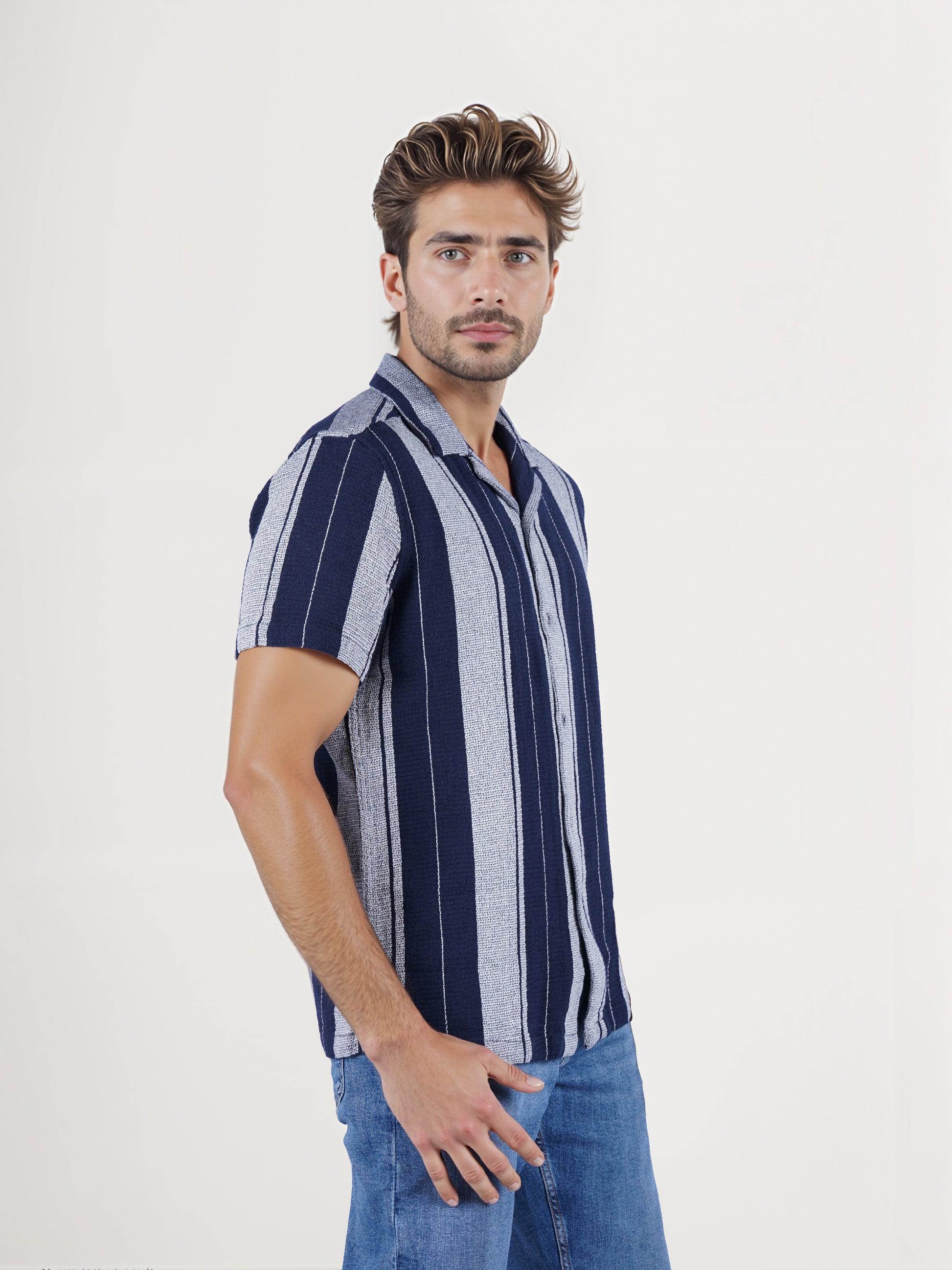 The Celio Men Blue Striped Shirt features a regular fit with short sleeves, crafted from soft cotton, perfect for casual occasions. Disclaimer: All other items in the image are only for display purposes and will not be a part of the delivery content. Product colour may slightly vary due to photographic lighting sources. Country of Origin - India.