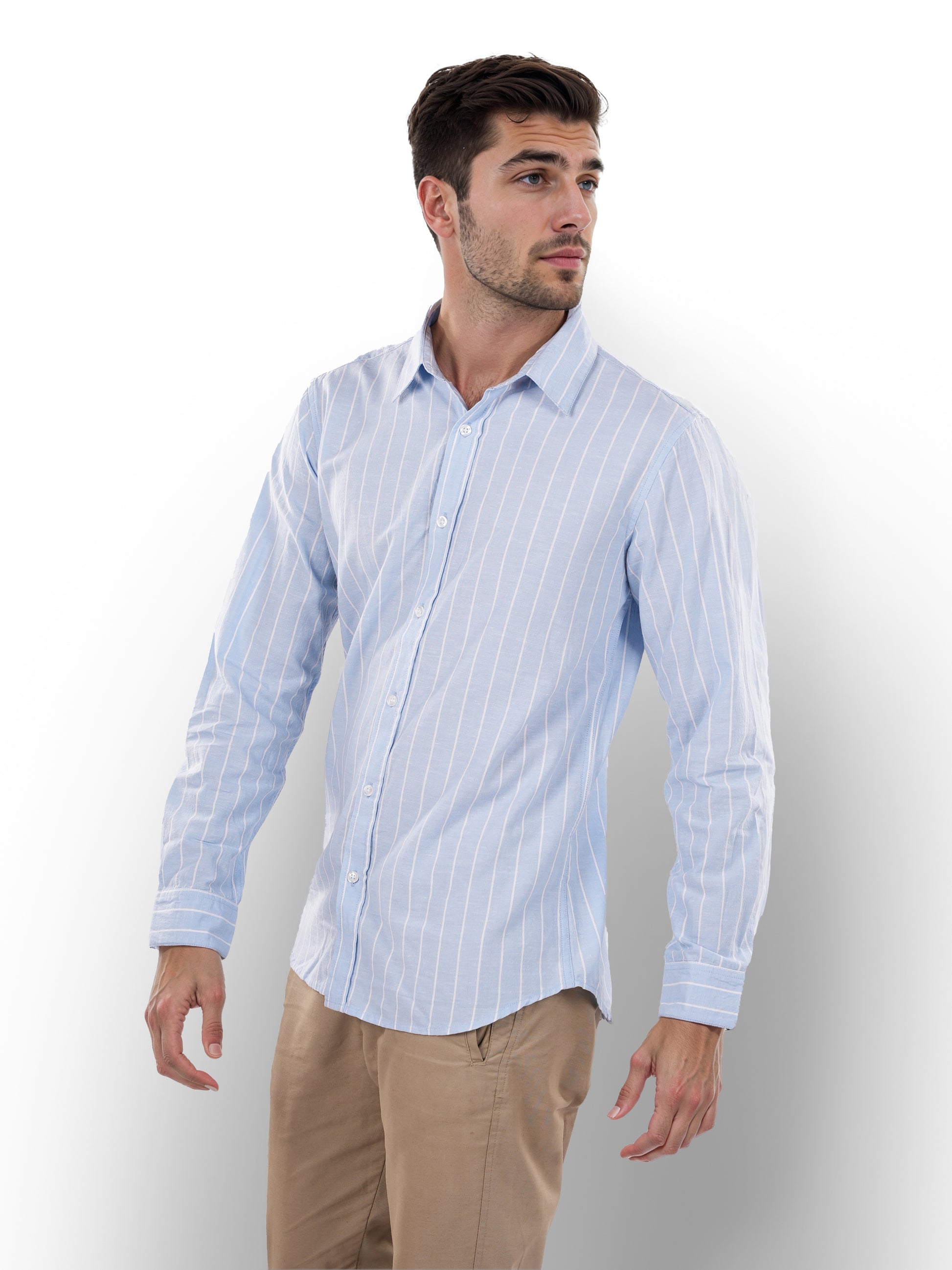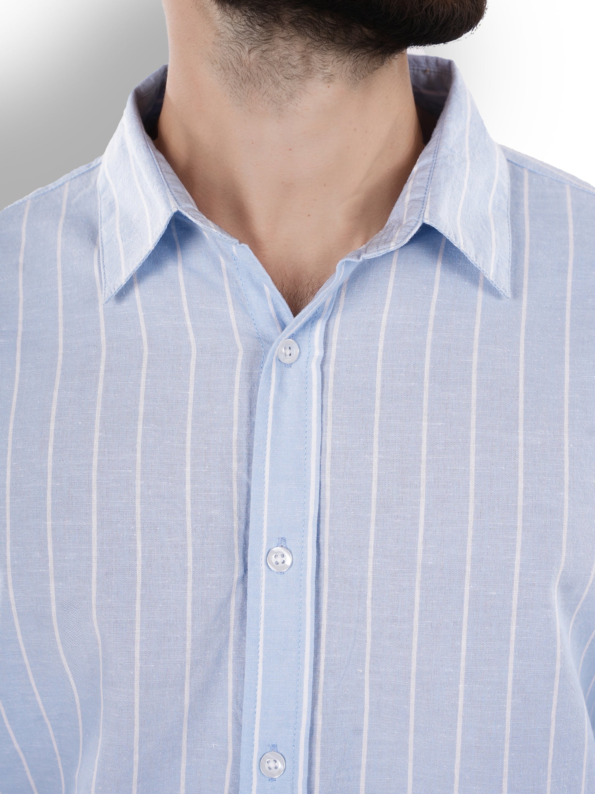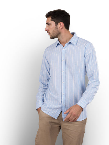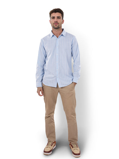 Men's blue striped regular fit shirt by Celio, crafted from comfortable cotton linen. Perfect for casual occasions, featuring long sleeves and a stylish spread collar. Disclaimer: All other items in the image are only for display purposes and will not be a part of the delivery content. Product colour may slightly vary due to photographic lighting sources. Country of Origin - India.