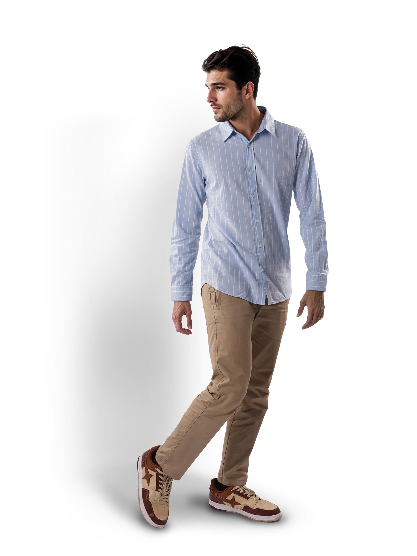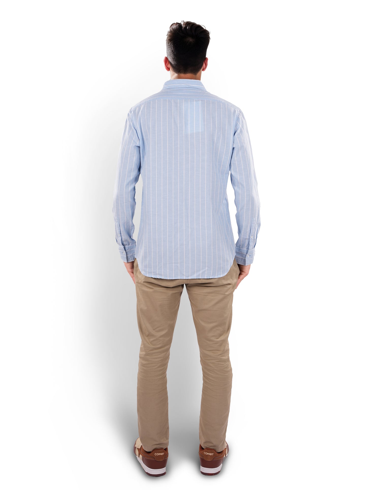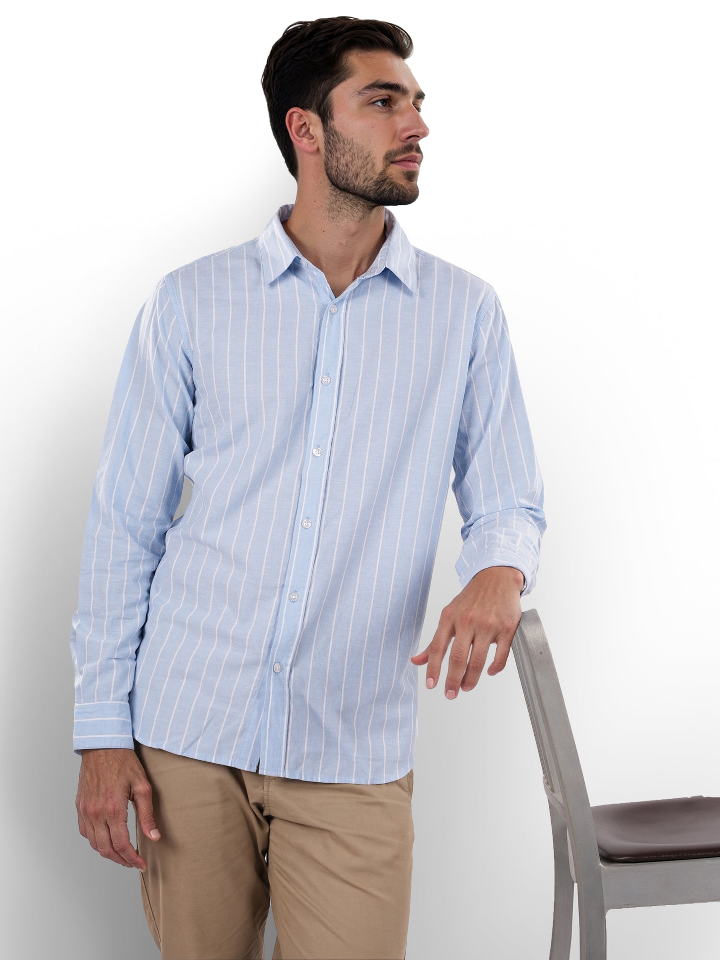 Men's blue striped regular fit shirt by Celio, crafted from comfortable cotton linen. Perfect for casual occasions, featuring long sleeves and a stylish spread collar. Disclaimer: All other items in the image are only for display purposes and will not be a part of the delivery content. Product colour may slightly vary due to photographic lighting sources. Country of Origin - India.
