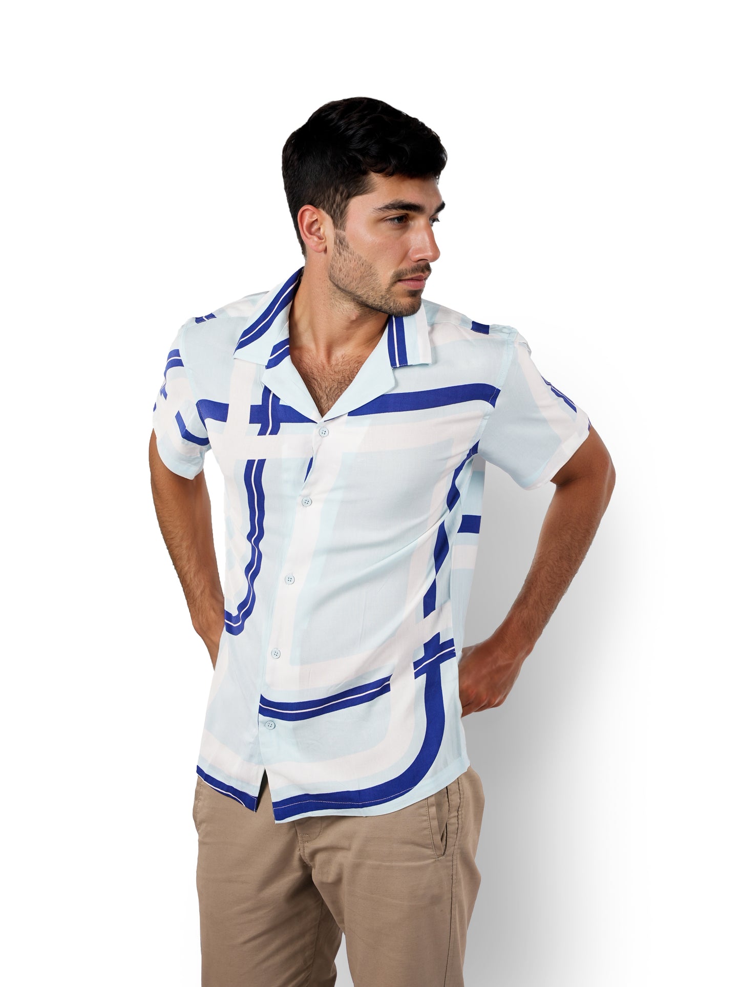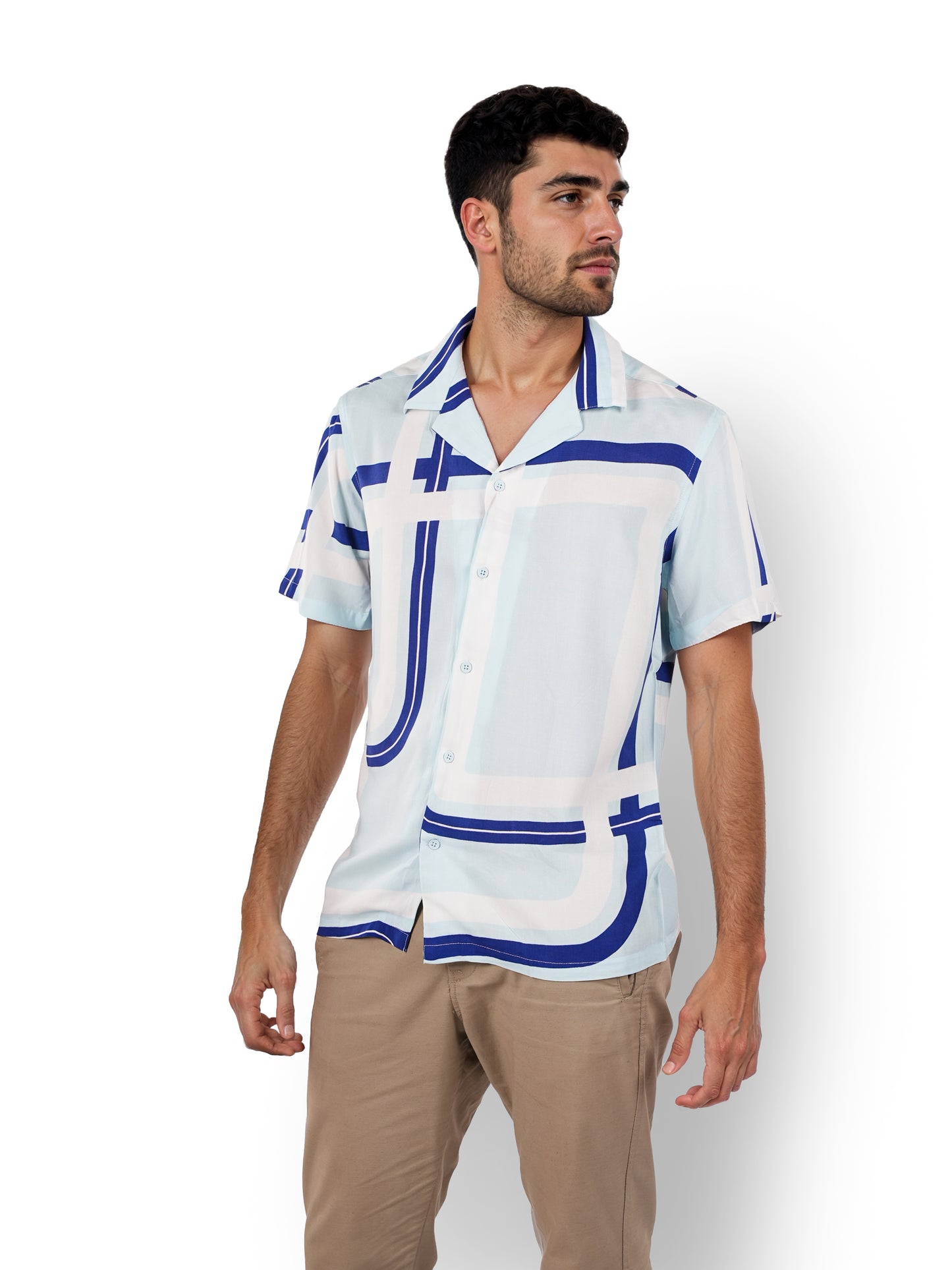 Elevate your casual style with the Celio Men's Blue Cuban Collar Shirt. Crafted from soft-touch viscose rayon, it features a relaxed fit and short sleeves for ultimate comfort. Disclaimer: All other items in the image are only for display purposes and will not be a part of the delivery content. Product colour may slightly vary due to photographic lighting sources. Country of Origin - India.