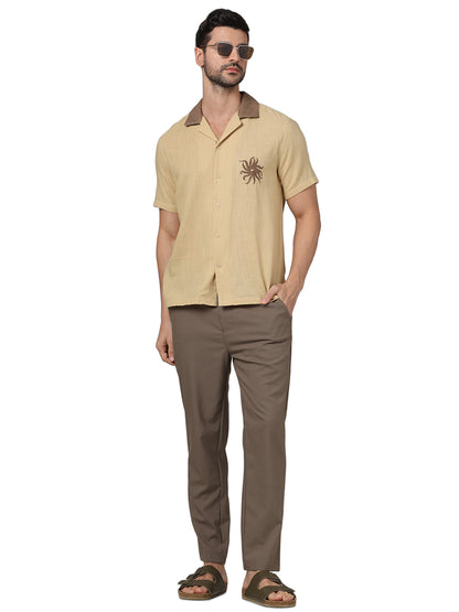 Celio* Embroidered Regular Fit Cotton Brown Shirt