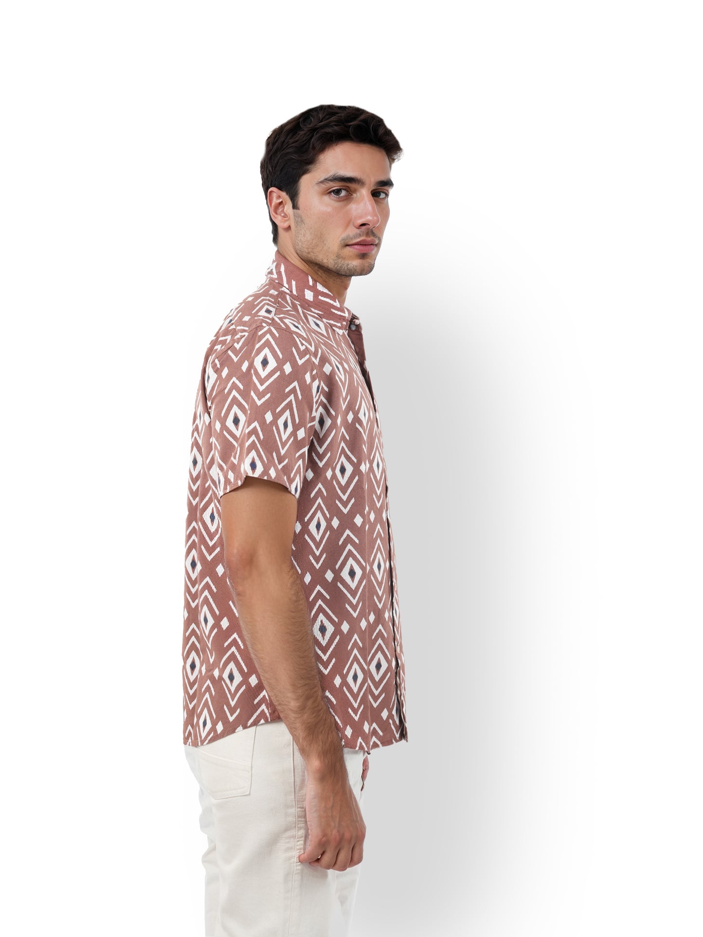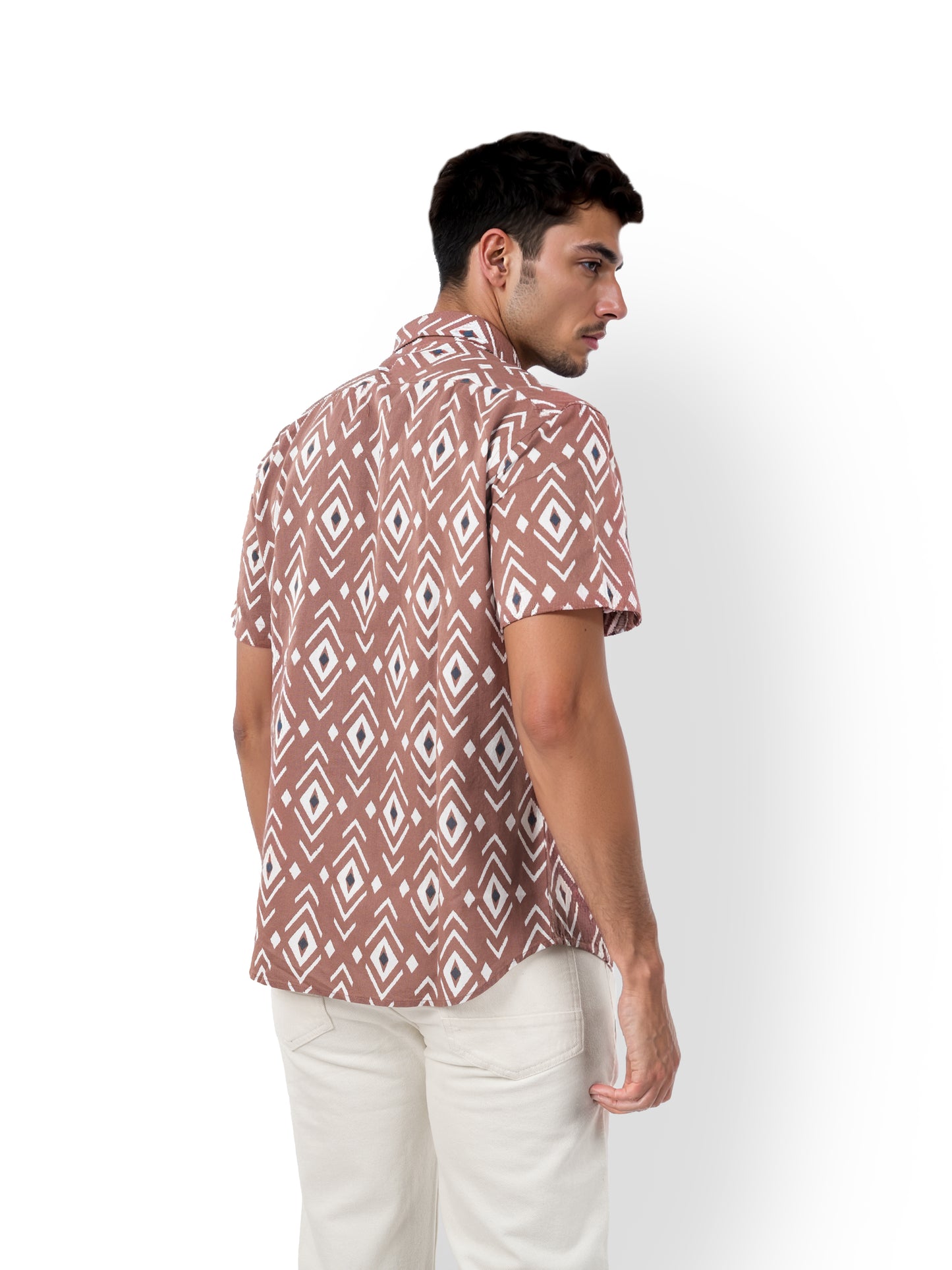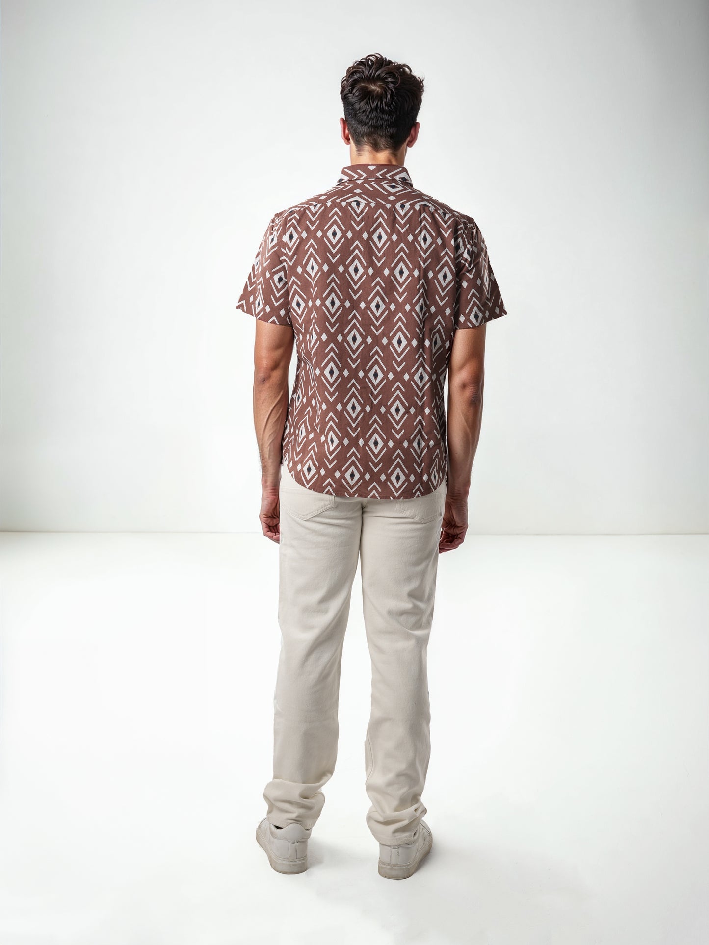 Discover the Celio Men's Brown Spread Collar Casual Shirt, crafted from breathable cotton. Perfect for casual occasions, it features short sleeves and a stylish print for a relaxed yet refined look. Disclaimer: All other items in the image are only for display purposes and will not be a part of the delivery content. Product colour may slightly vary due to photographic lighting sources. Country of Origin - India.