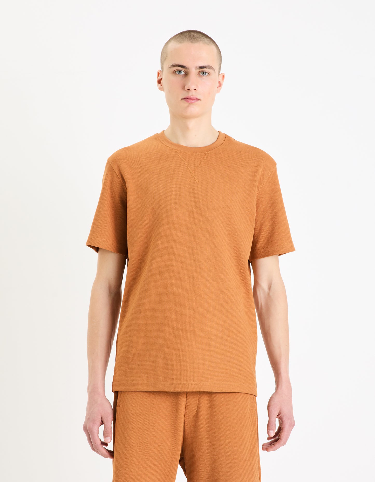 Discover the Celio Men Brown Round Neck T-shirt, crafted from soft cotton. Perfect for casual outings, this boxy design features short sleeves and a solid color for versatile styling. Disclaimer: All other items in the image are only for display purposes and will not be a part of the delivery content. Product colour may slightly vary due to photographic lighting sources. Country of Origin - India.