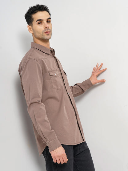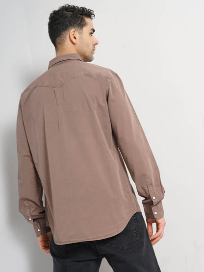 Celio* Solid Regular Fit Cotton Brown Shirt