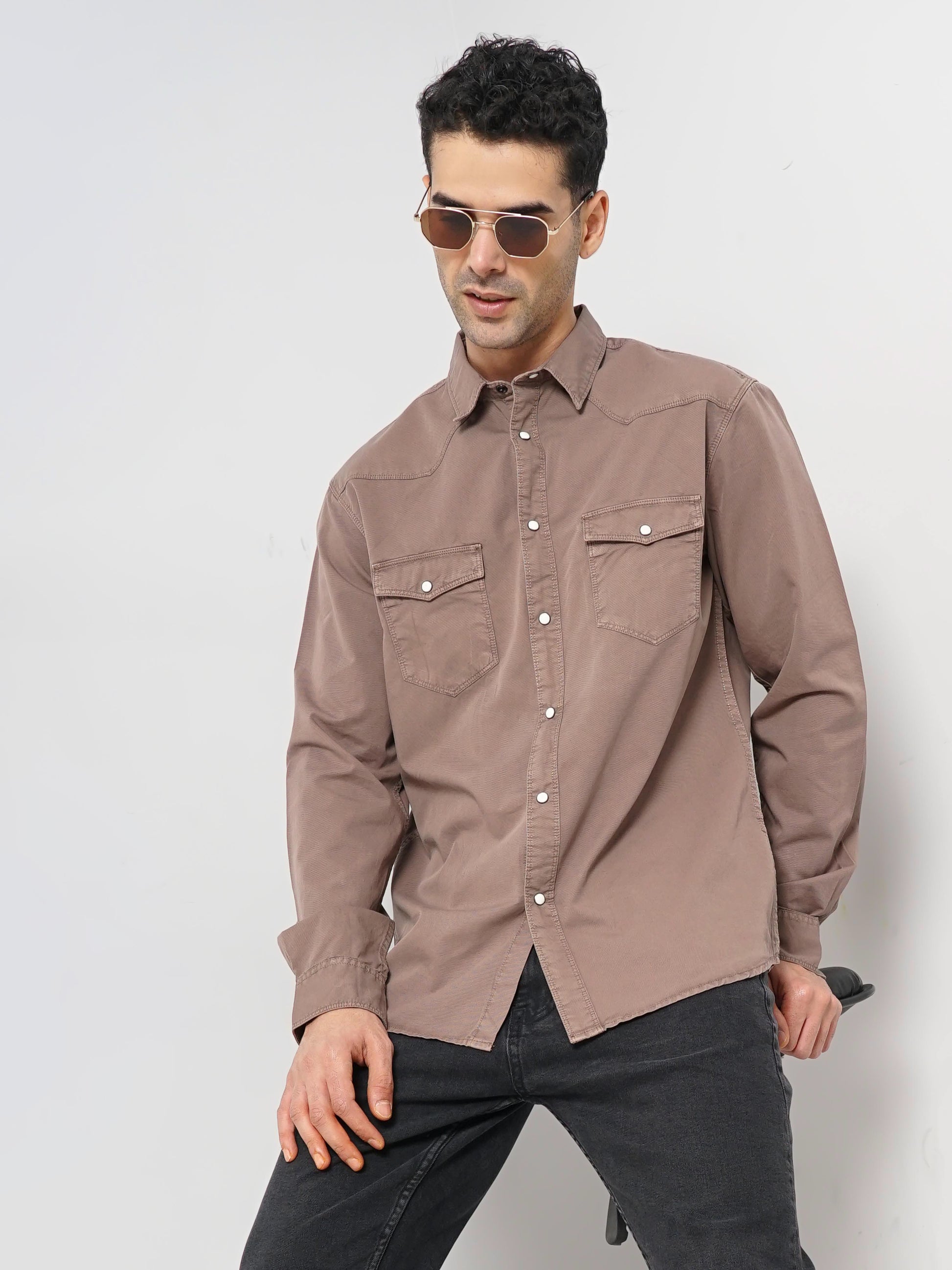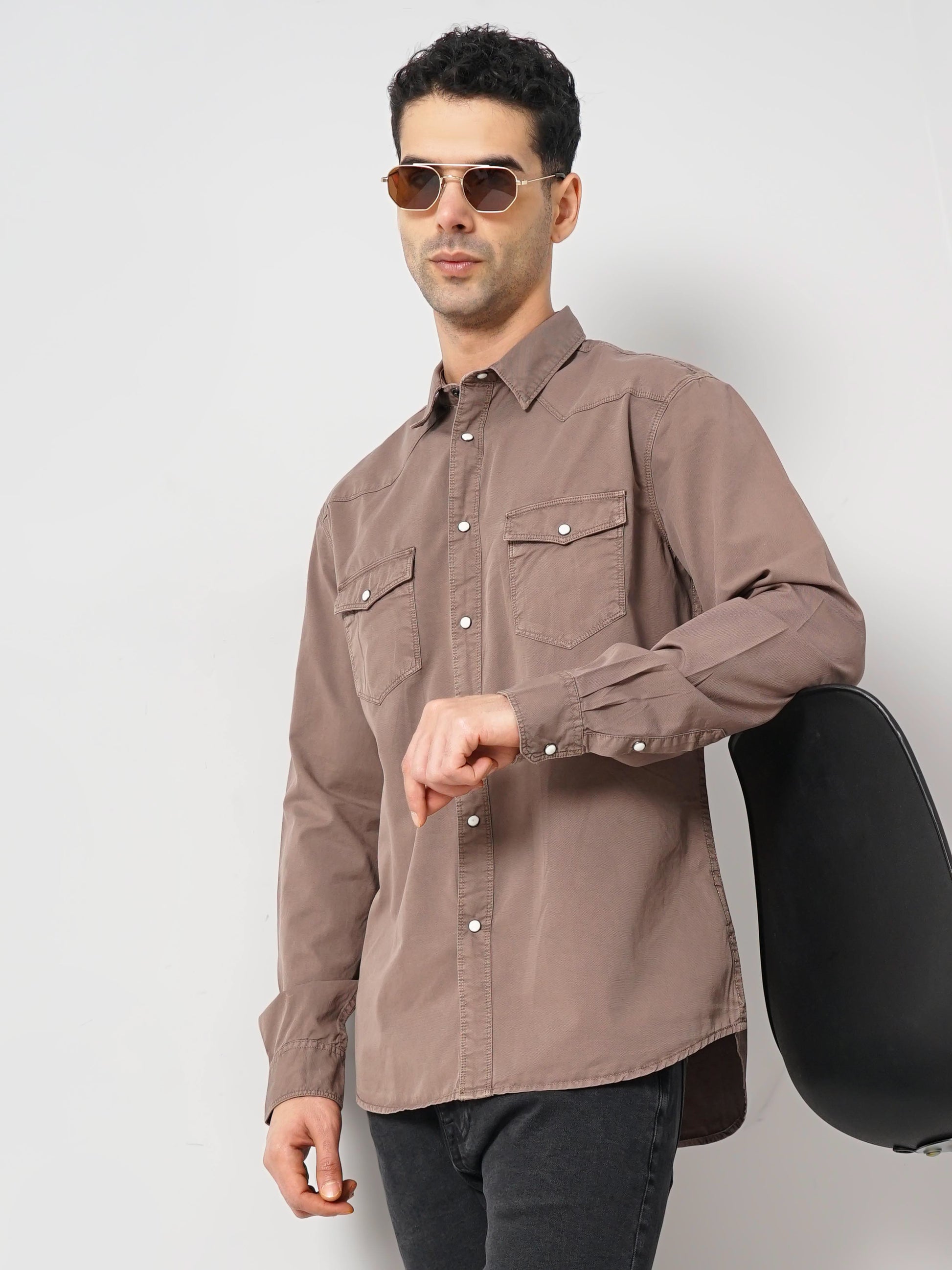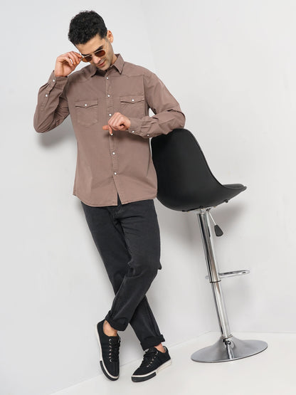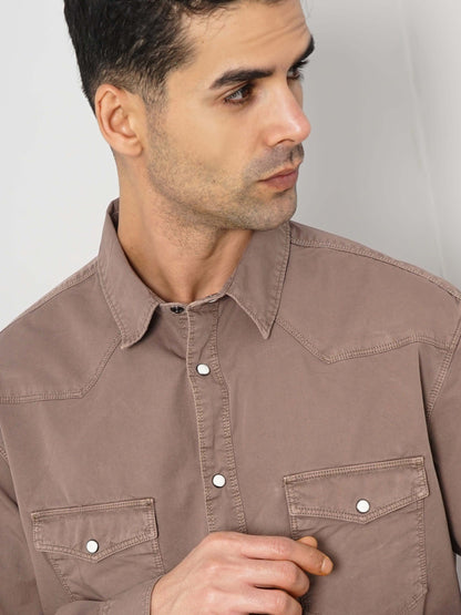 Elevate your casual style with the Celio Men Brown Cotton Overdyed Twill Denim Shirt. Featuring a regular fit and long sleeves, this shirt is perfect for relaxed outings. Disclaimer: All other items in the image are only for display purposes and will not be a part of the delivery content. Product colour may slightly vary due to photographic lighting sources. Country of Origin - India.