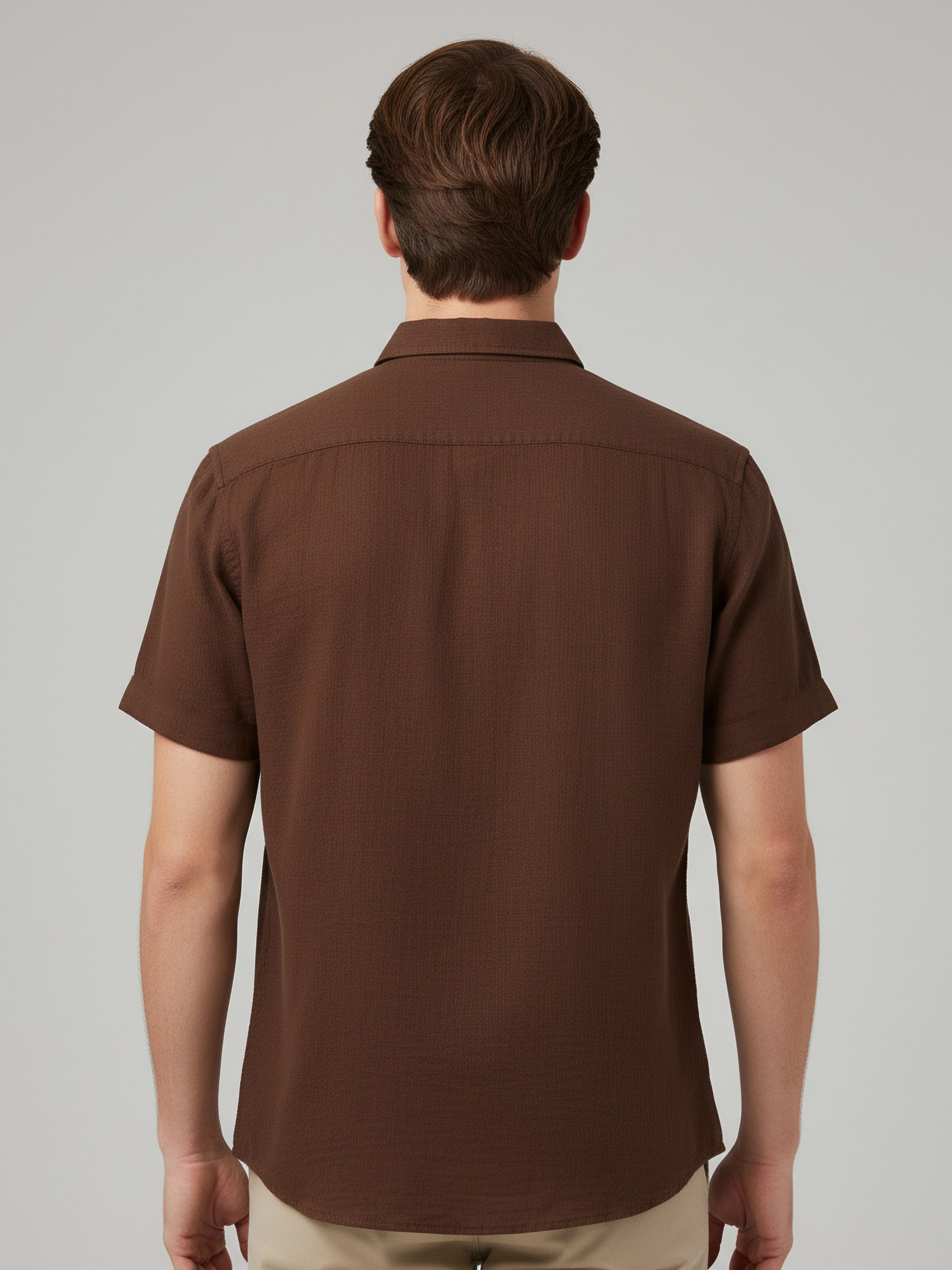 Shop the Celio Men Brown Solid Casual Shirt, crafted from cotton for comfort. With a regular fit and short sleeves, it's perfect for casual occasions. Disclaimer: All other items in the image are only for display purposes and will not be a part of the delivery content. Product colour may slightly vary due to photographic lighting sources. Country of Origin - India.