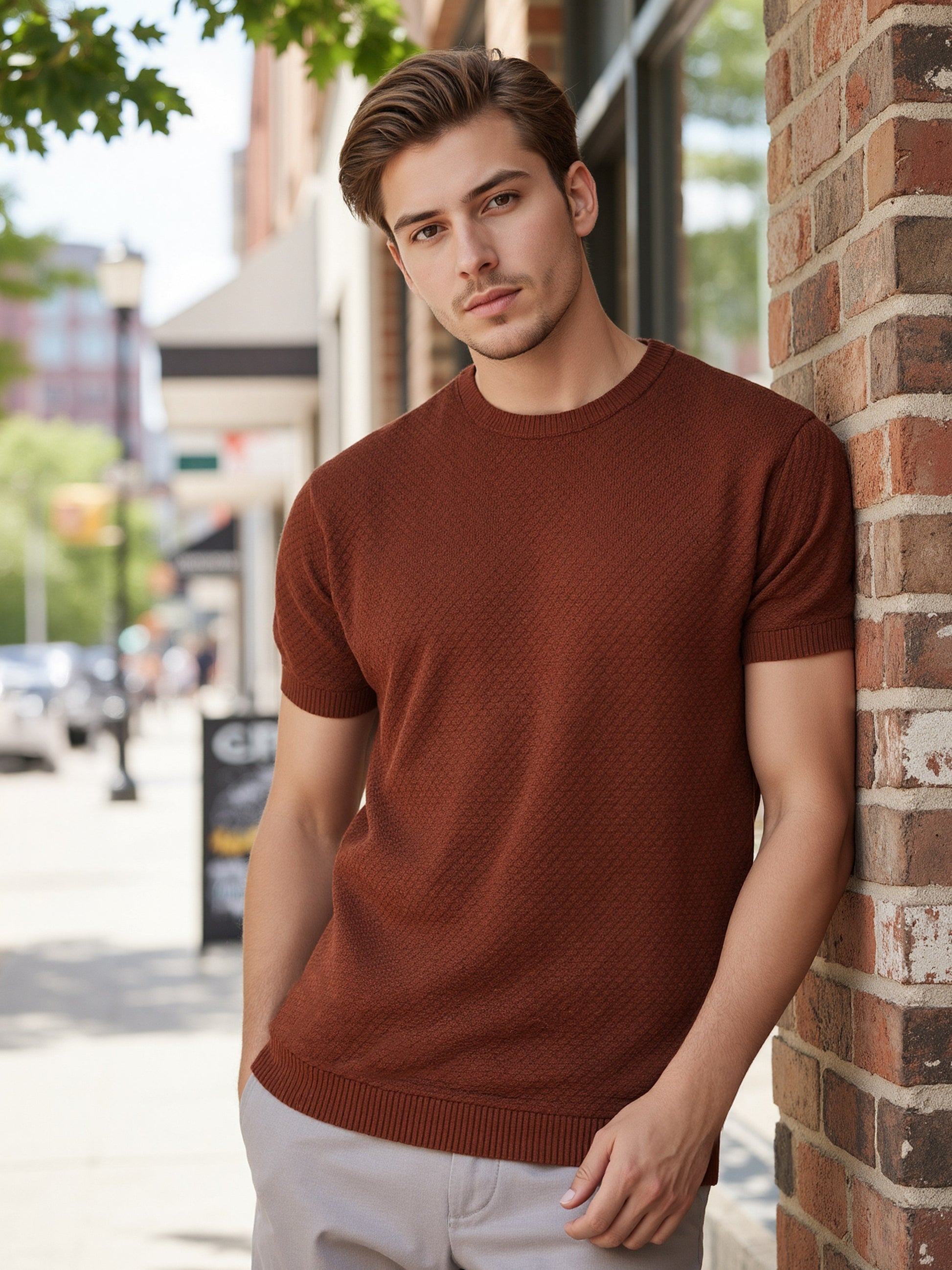 Elevate your casual wardrobe with Celio's brown solid regular fit t-shirt for men, crafted from soft cotton for comfort. Features stylish short sleeves, perfect for everyday wear. Disclaimer: All other items in the image are only for display purposes and will not be a part of the delivery content. Product colour may slightly vary due to photographic lighting sources. Country of Origin - India.