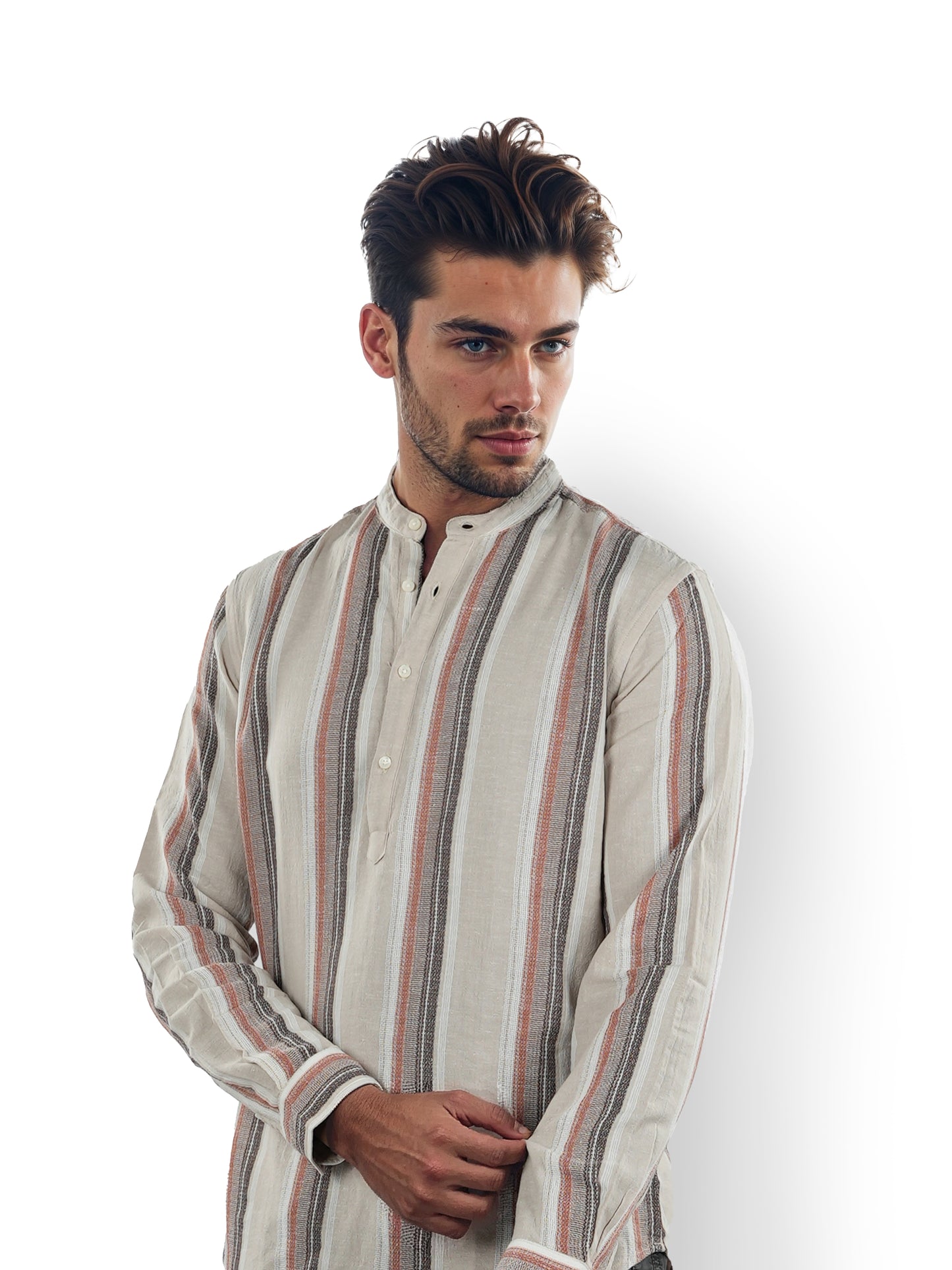 Elevate your casual wardrobe with the Celio Men Brown Mandarin Collar Shirt. This striped cotton shirt features long sleeves and a regular fit, perfect for stylish outings. Disclaimer: All other items in the image are only for display purposes and will not be a part of the delivery content. Product colour may slightly vary due to photographic lighting sources. Country of Origin - India.