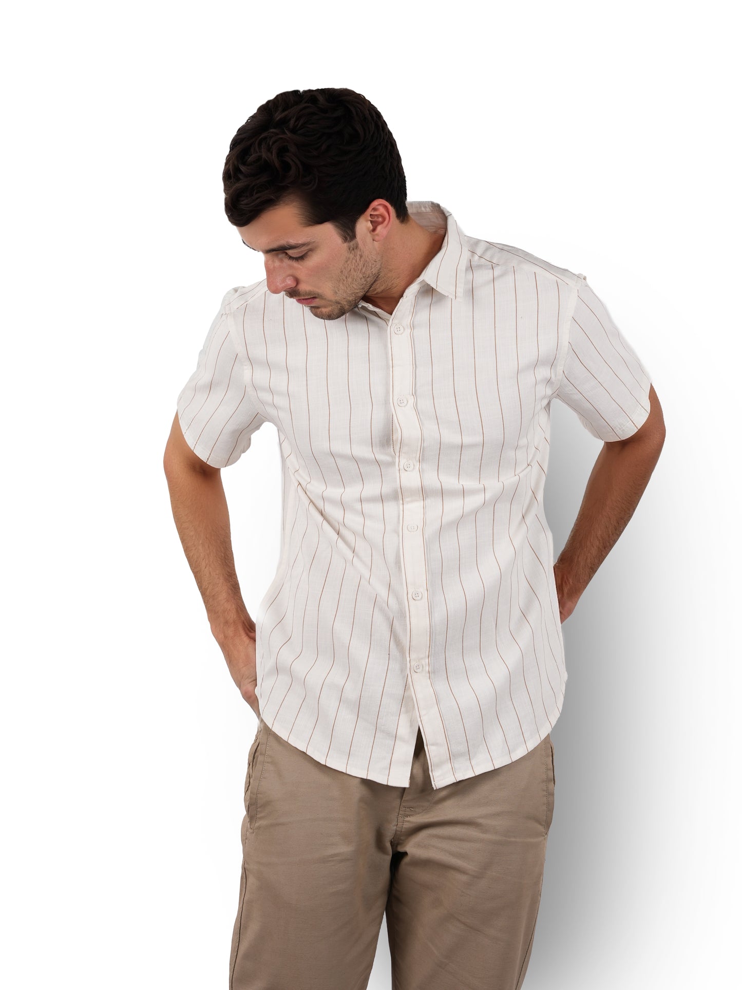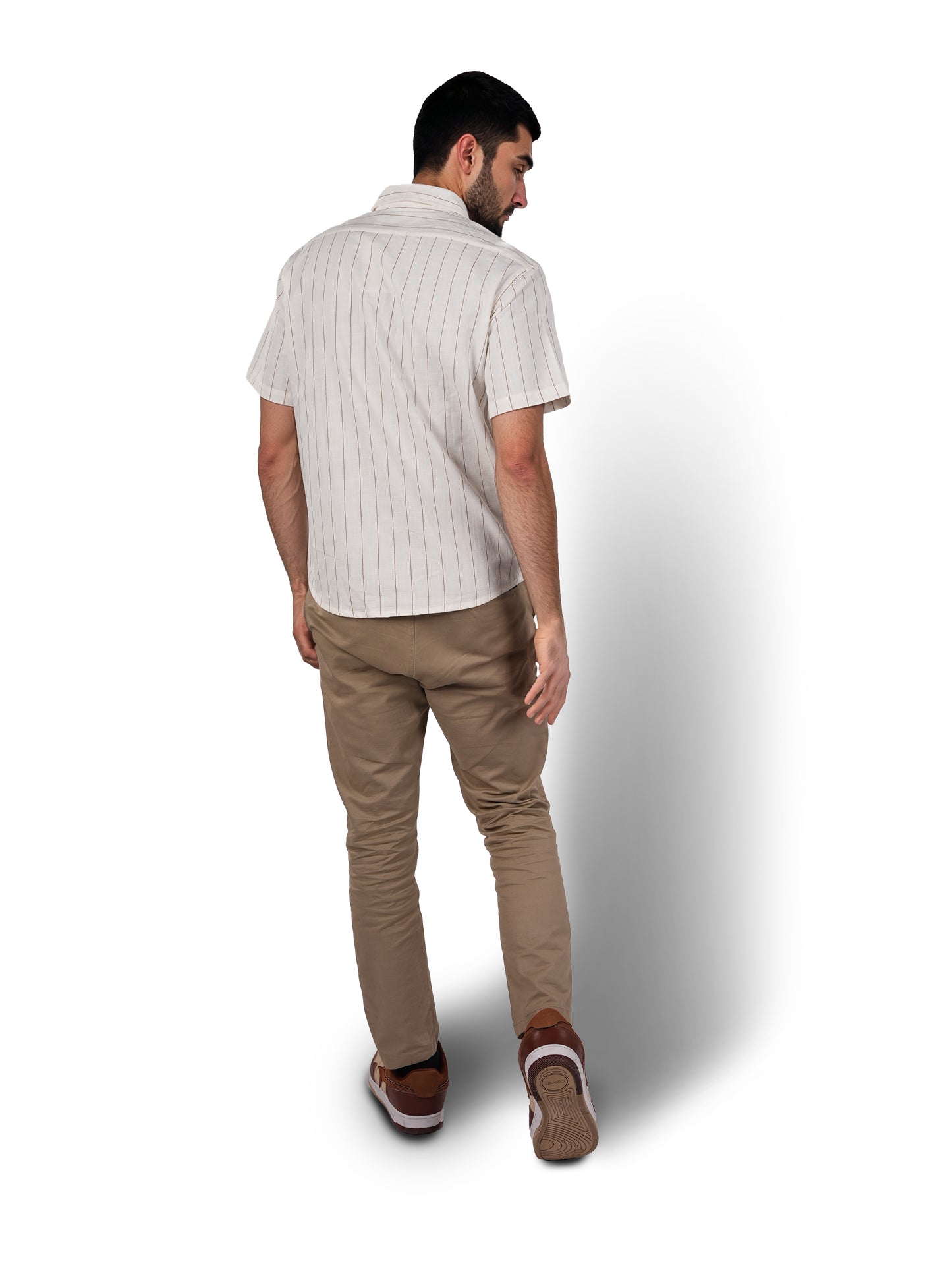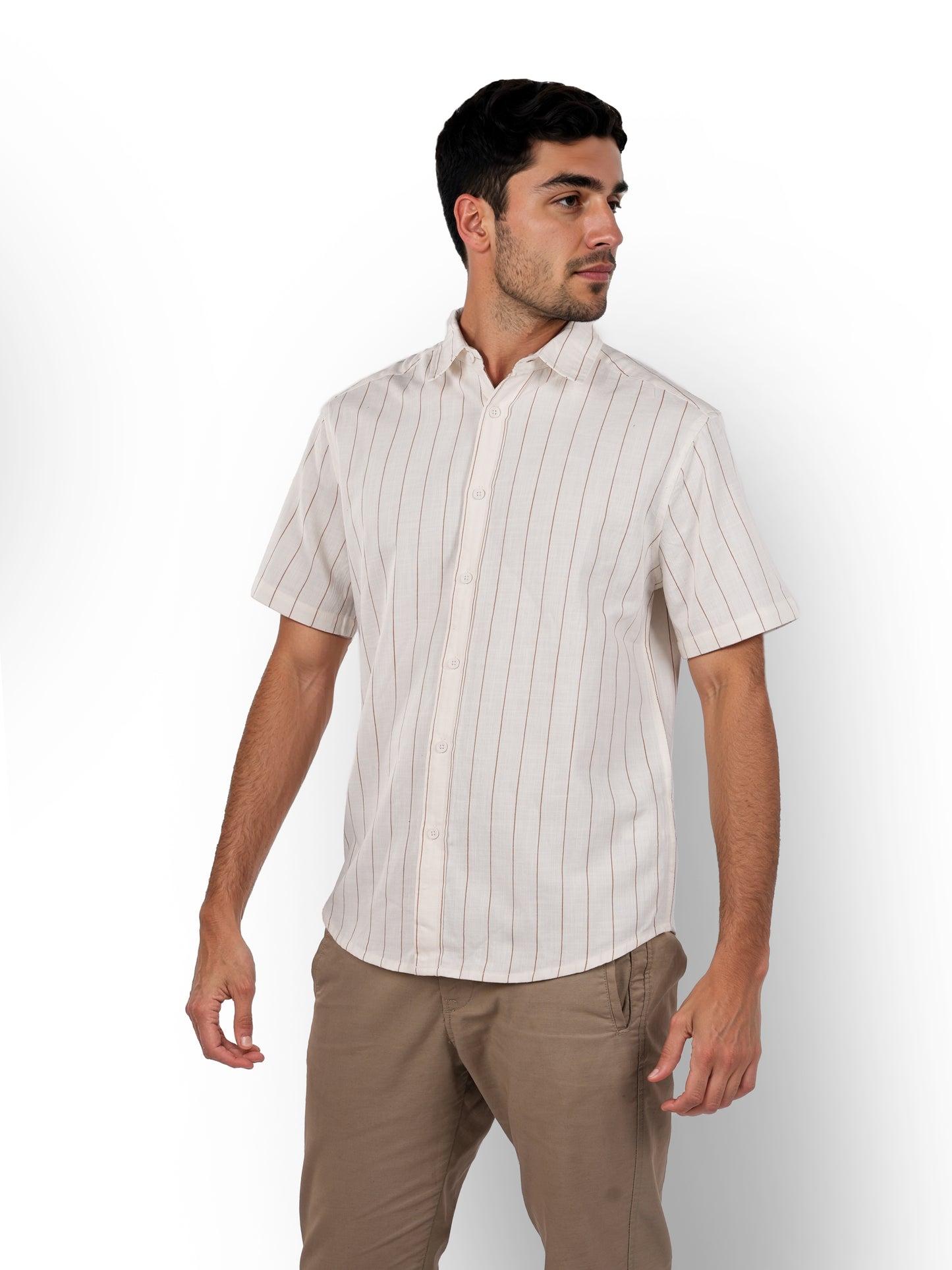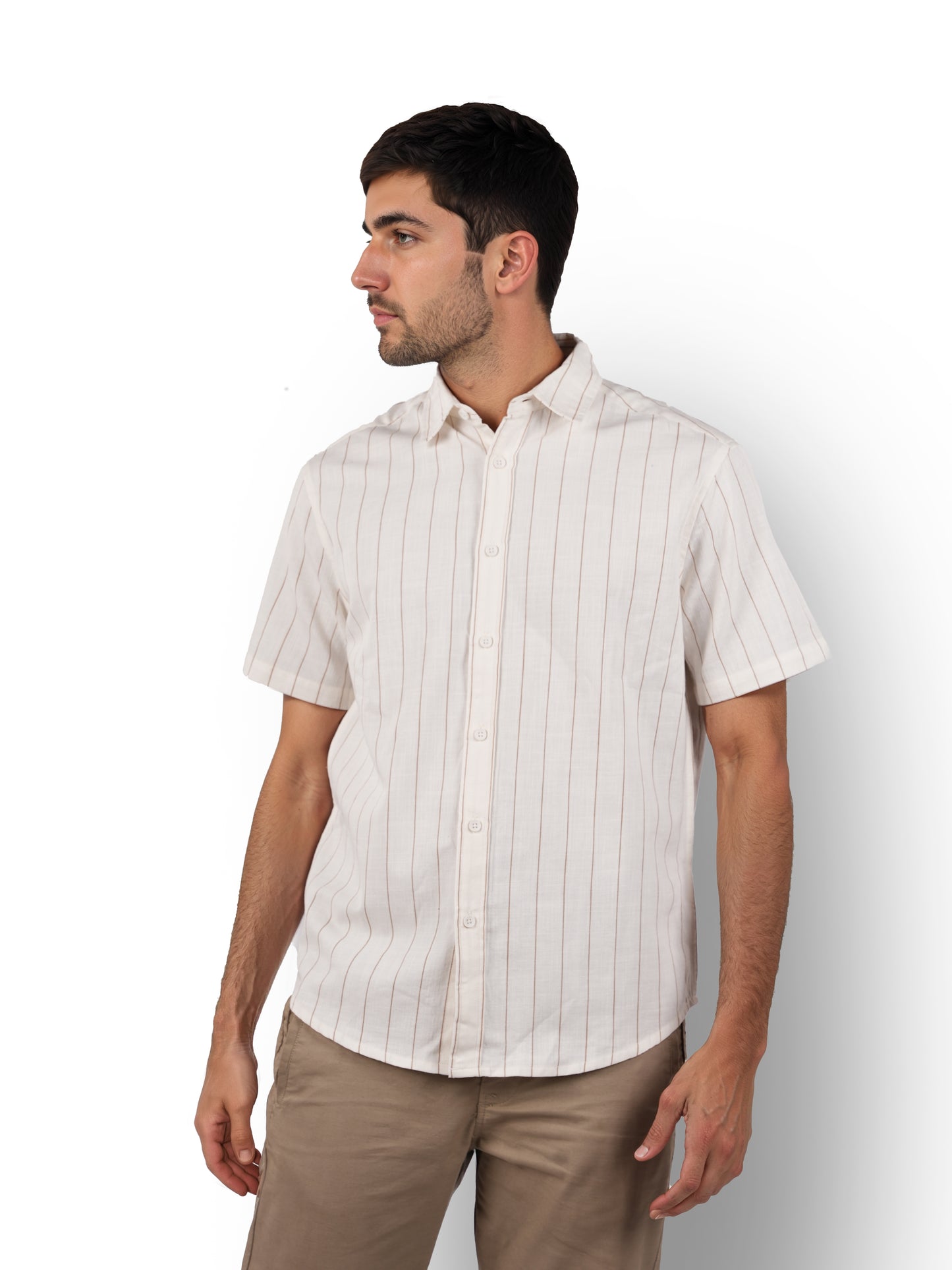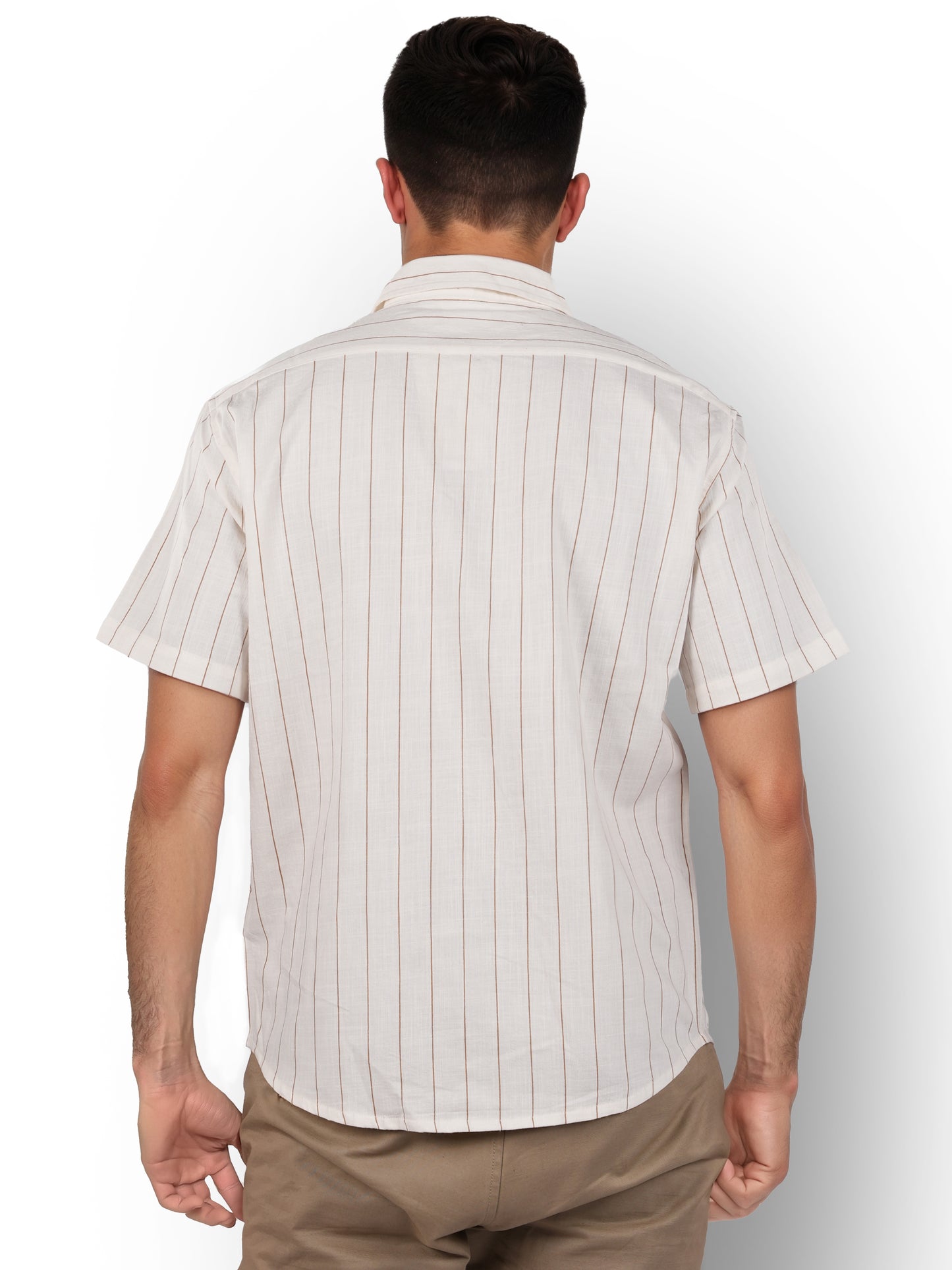 Elevate your casual style with the Celio men's brown striped cotton shirt. Featuring a spread collar and short sleeves, it's perfect for relaxed occasions. Disclaimer: All other items in the image are only for display purposes and will not be a part of the delivery content. Product colour may slightly vary due to photographic lighting sources. Country of Origin - India. JALPLINE