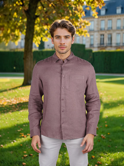 Stylish brown linen shirt for men from Celio, perfect for casual occasions. Features long sleeves and a regular fit, making it a versatile addition to any wardrobe. Disclaimer: All other items in the image are only for display purposes and will not be a part of the delivery content. Product colour may slightly vary due to photographic lighting sources. Country of Origin - India.