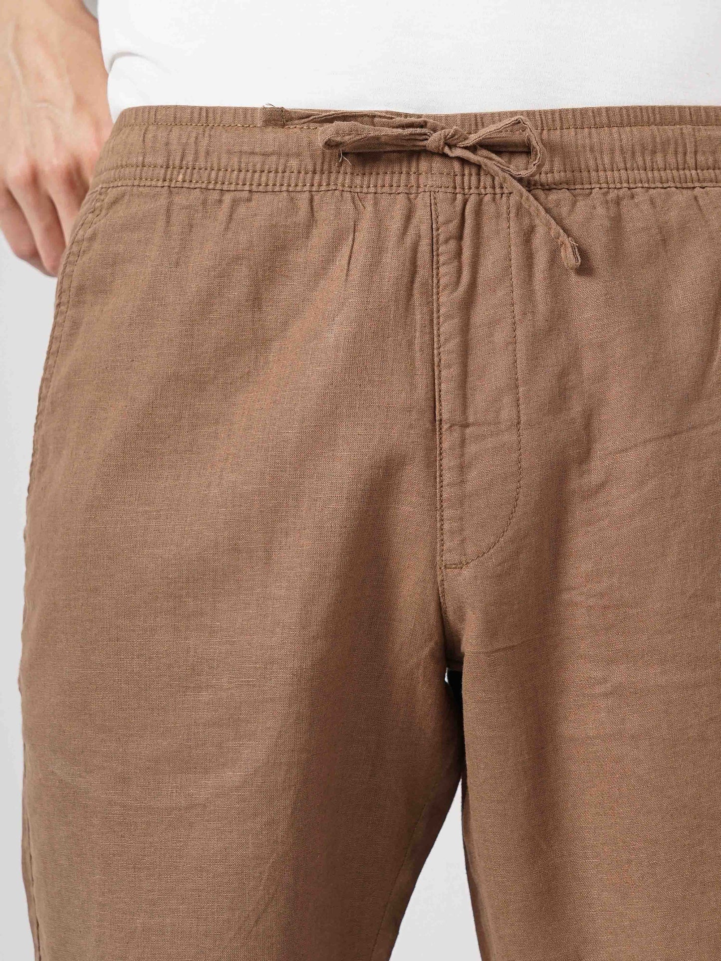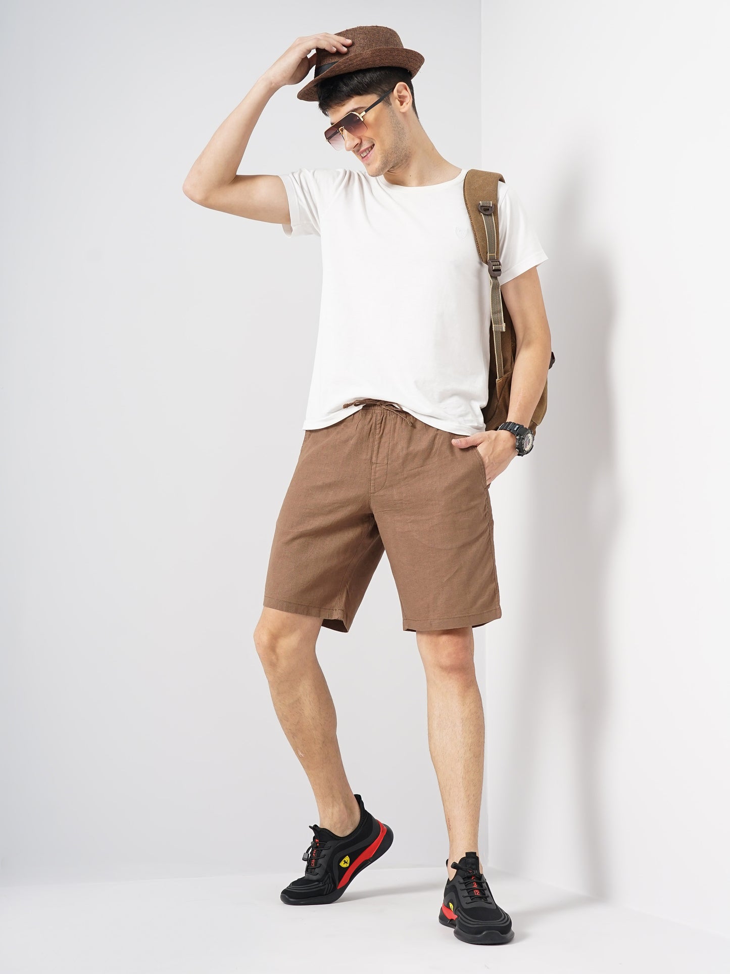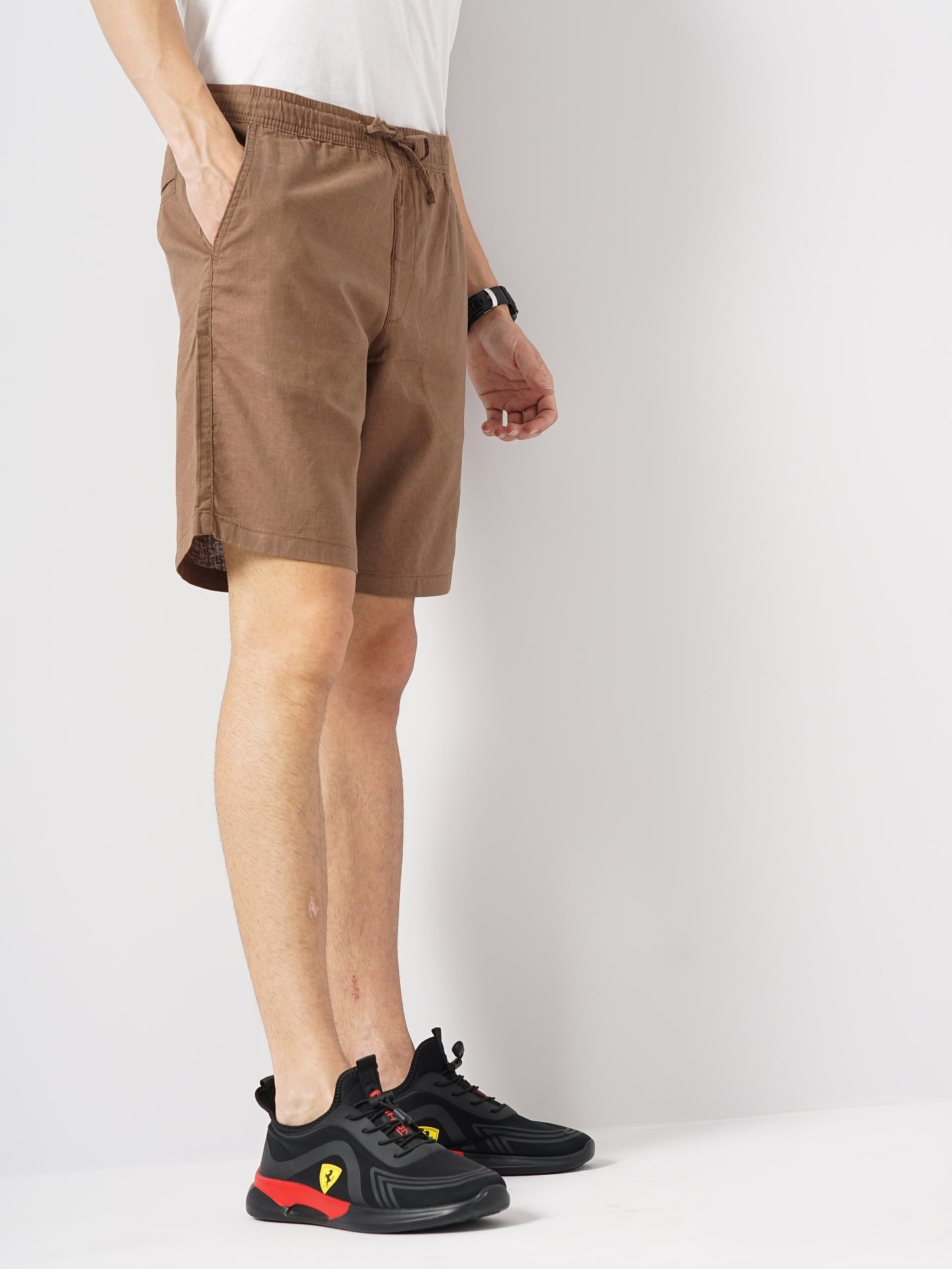 Explore comfort with Celio's brown linen casual shorts for men. Designed for easy wear, these loose fit shorts are perfect for leisurely outings and everyday style. Disclaimer: All other items in the image are only for display purposes and will not be a part of the delivery content. Product colour may slightly vary due to photographic lighting sources. Country of Origin - India.