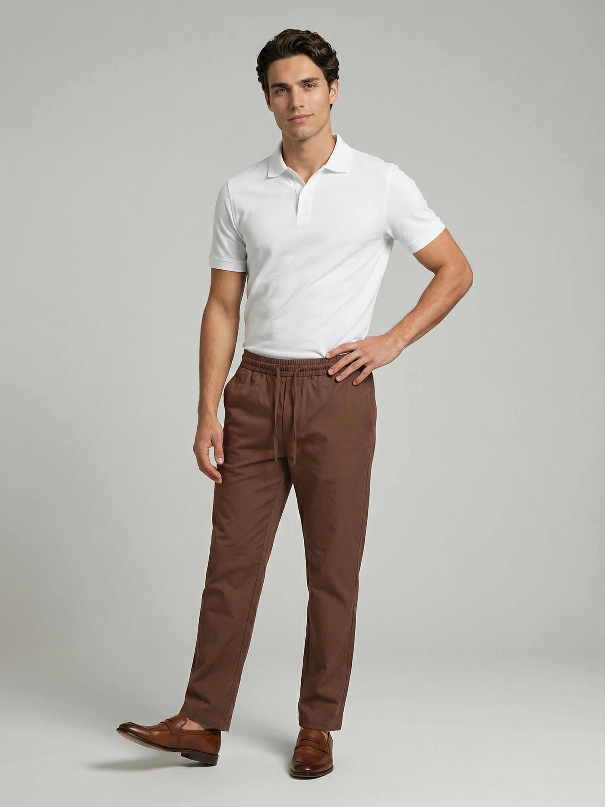 Stylish Celio men’s brown solid slim trousers crafted from durable polyester, perfect for casual occasions. Upgrade your wardrobe with this fashionable essential. Disclaimer: All other items in the image are only for display purposes and will not be a part of the delivery content. Product colour may slightly vary due to photographic lighting sources. Country of Origin - India.