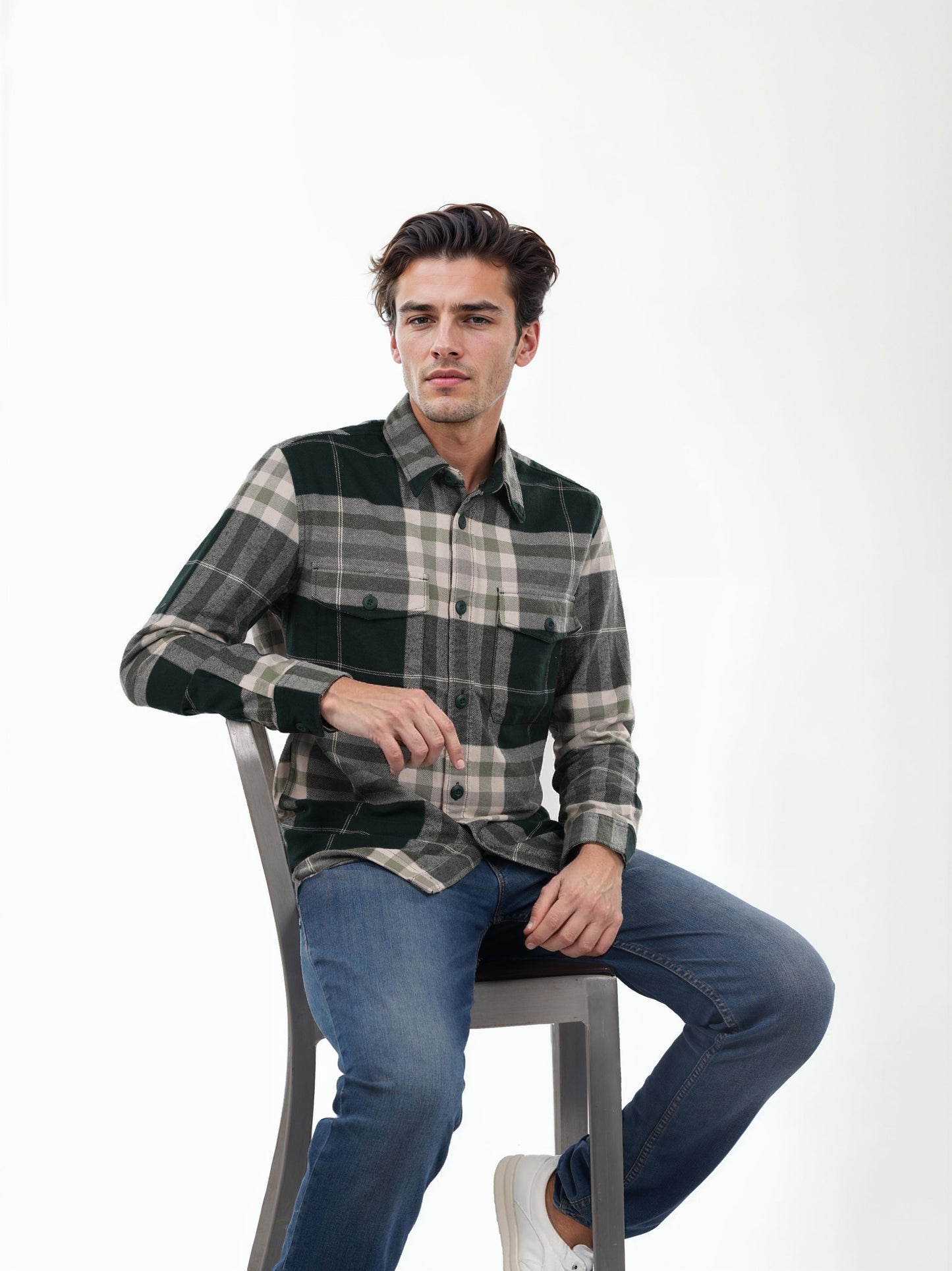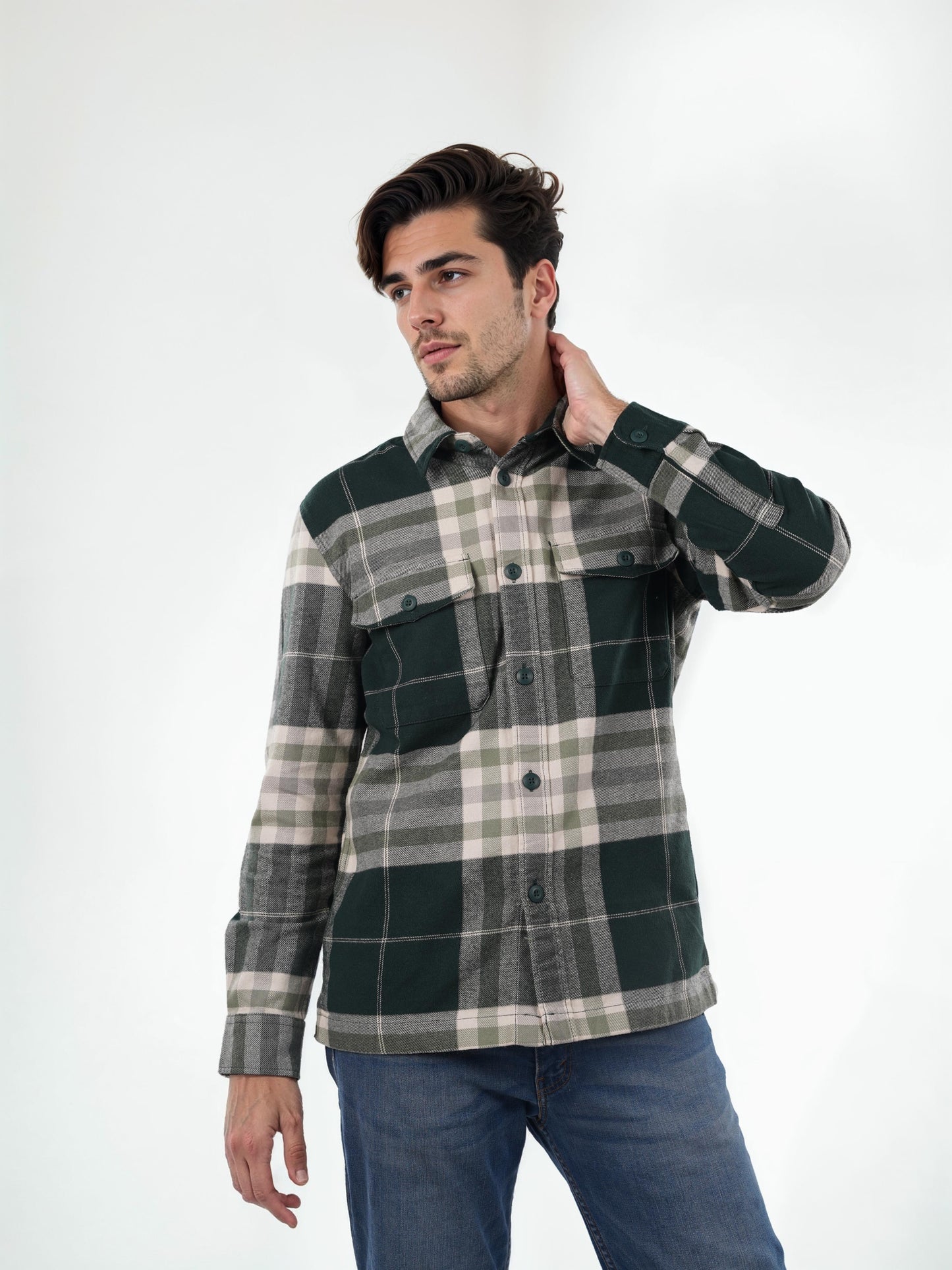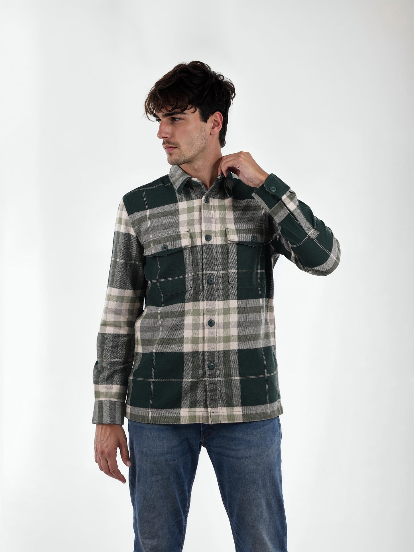 Elevate your casual style with this oversized green checked shirt by Celio. Crafted from soft cotton, it features long sleeves and a trendy spread collar, perfect for any occasion. Disclaimer: All other items in the image are only for display purposes and will not be a part of the delivery content. Product colour may slightly vary due to photographic lighting sources. Country of Origin - India.
