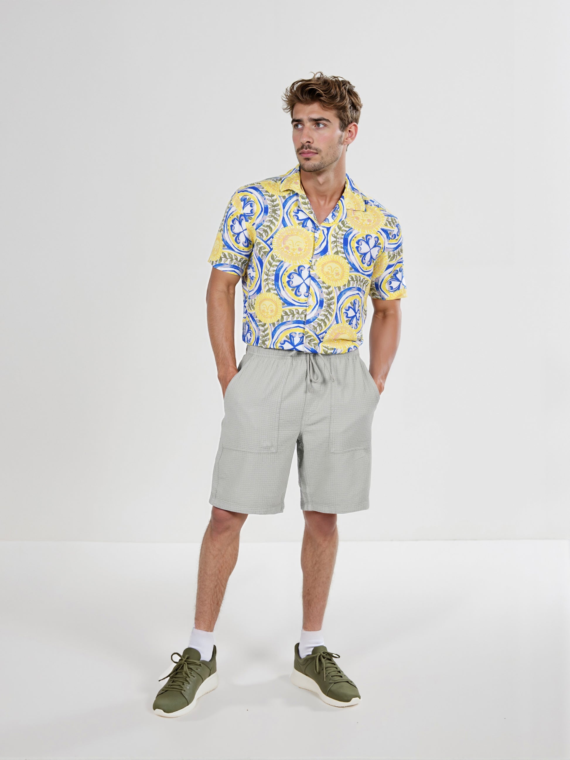 Men's green Bermuda shorts by Celio, crafted from comfortable cotton. Perfect for casual occasions, these regular fit shorts add style to any outfit. Disclaimer: All other items in the image are only for display purposes and will not be a part of the delivery content. Product colour may slightly vary due to photographic lighting sources. Country of Origin - India.