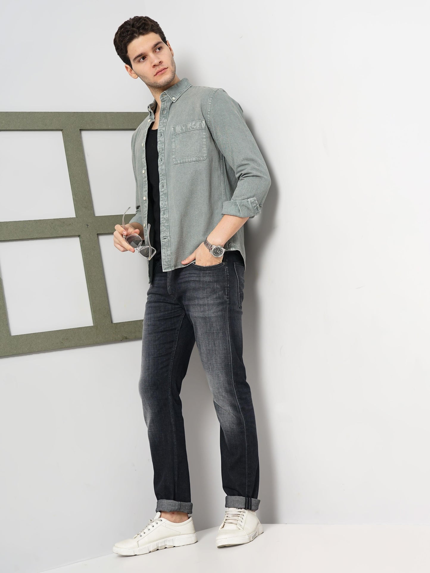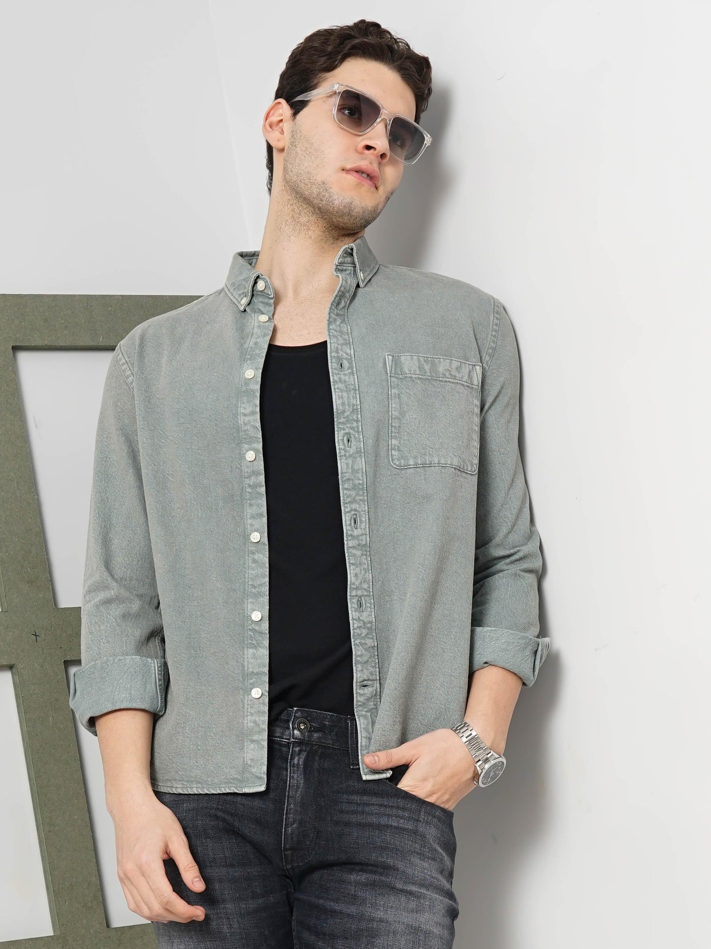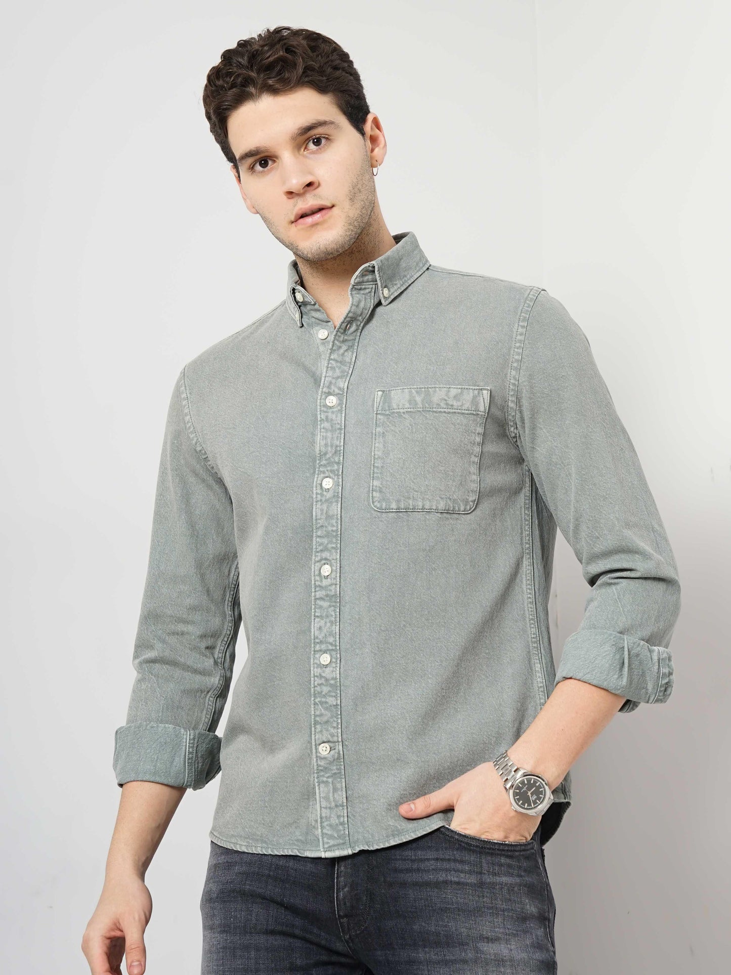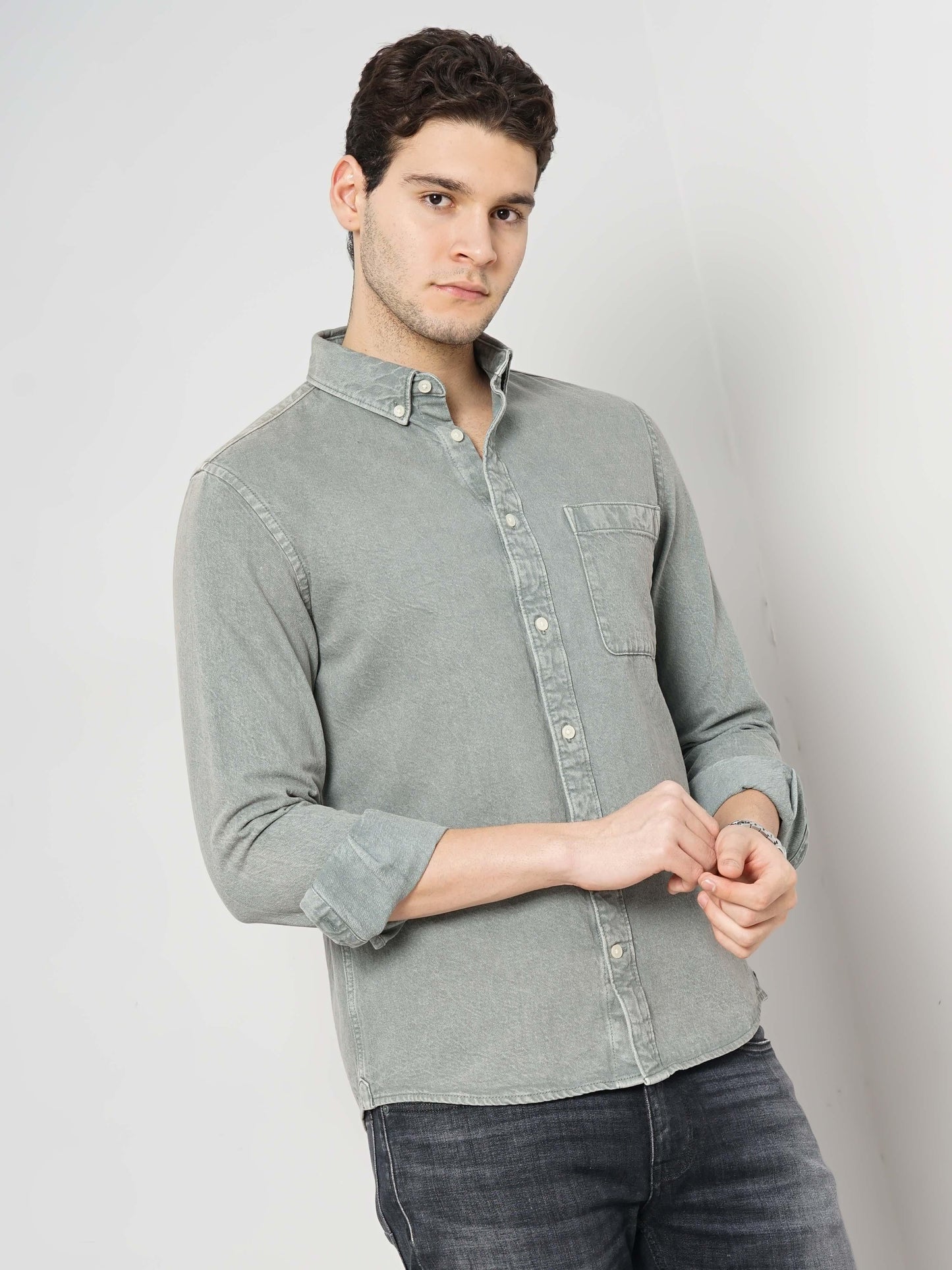 The Celio Men Green Solid Denim Shirt is a stylish casual option. Crafted from comfortable cotton, it features long sleeves and a regular fit, perfect for laid-back occasions. Disclaimer: All other items in the image are only for display purposes and will not be a part of the delivery content. Product colour may slightly vary due to photographic lighting sources. Country of Origin - India.