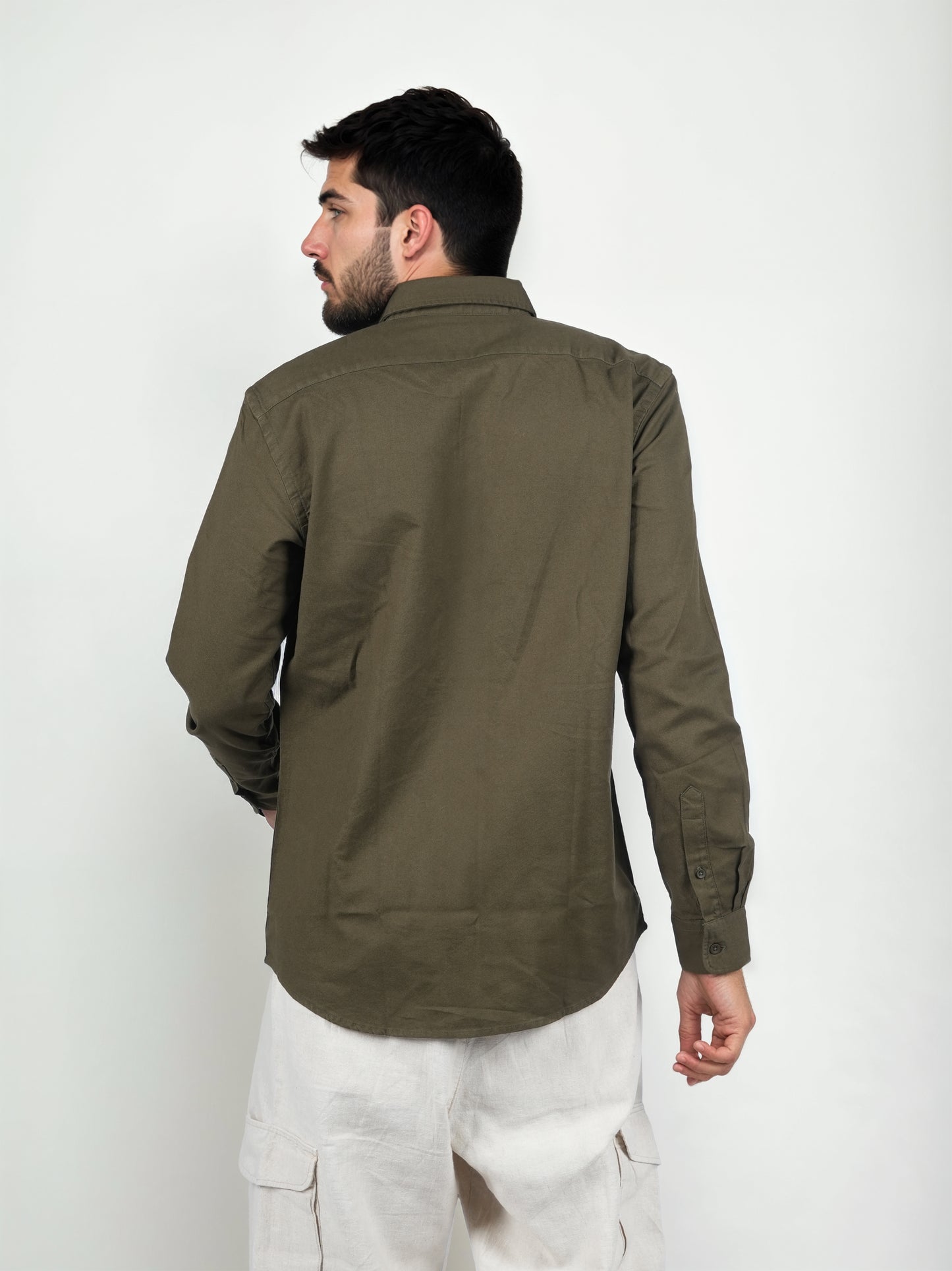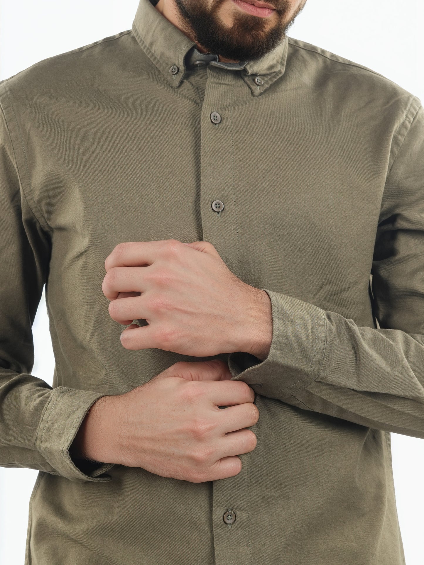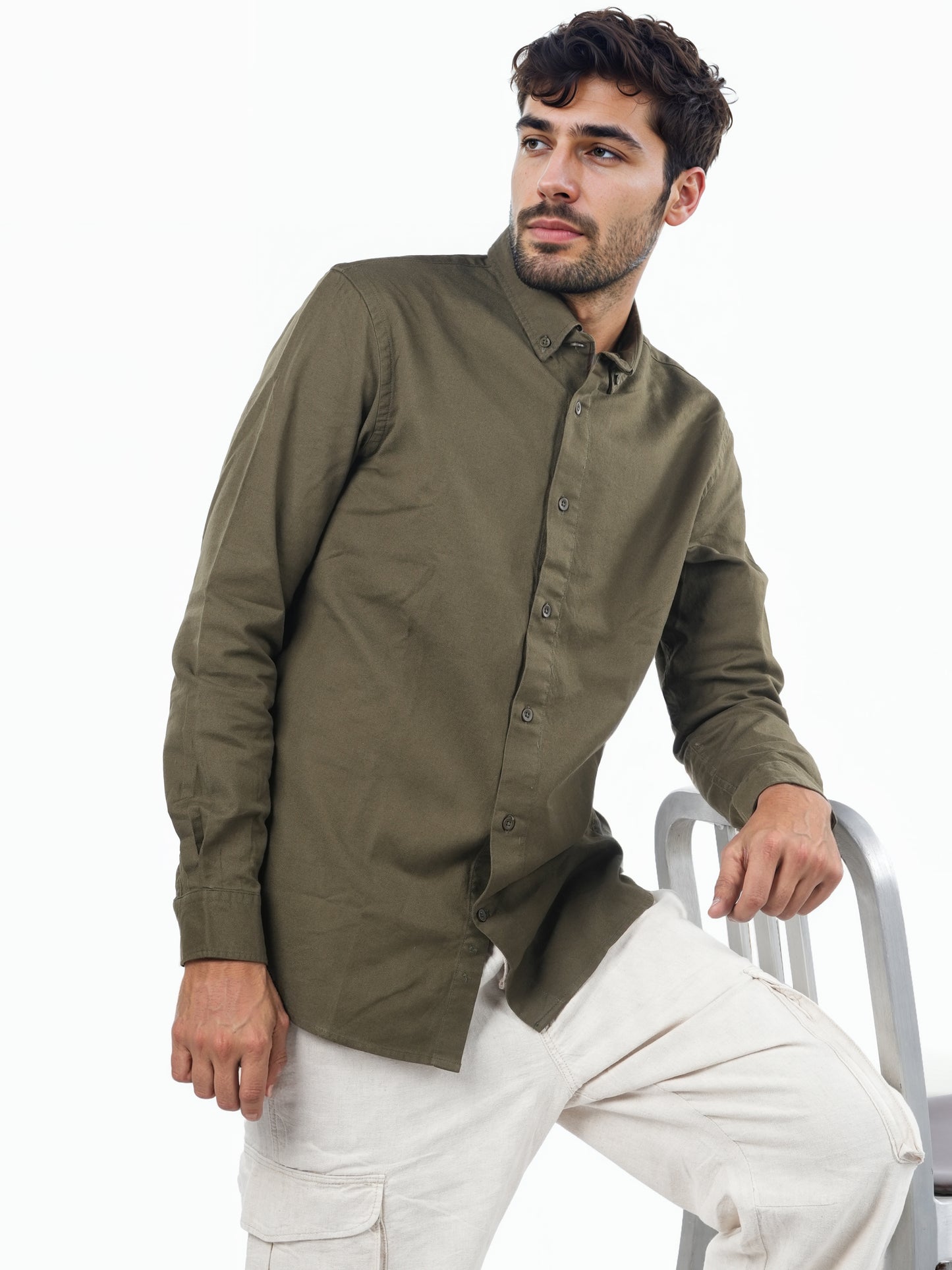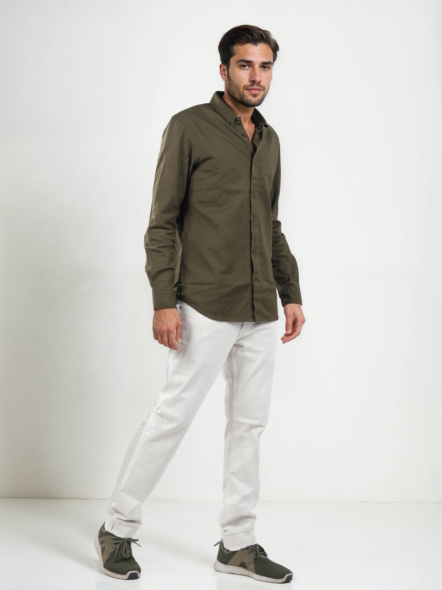 Men's Olive button-down collar shirt from Celio features a regular fit design made of soft cotton. Perfect for casual occasions, it comes with long sleeves for a stylish look. Disclaimer: All other items in the image are only for display purposes and will not be a part of the delivery content. Product colour may slightly vary due to photographic lighting sources. Country of Origin - India.